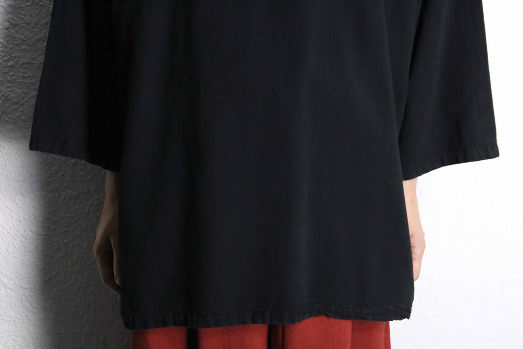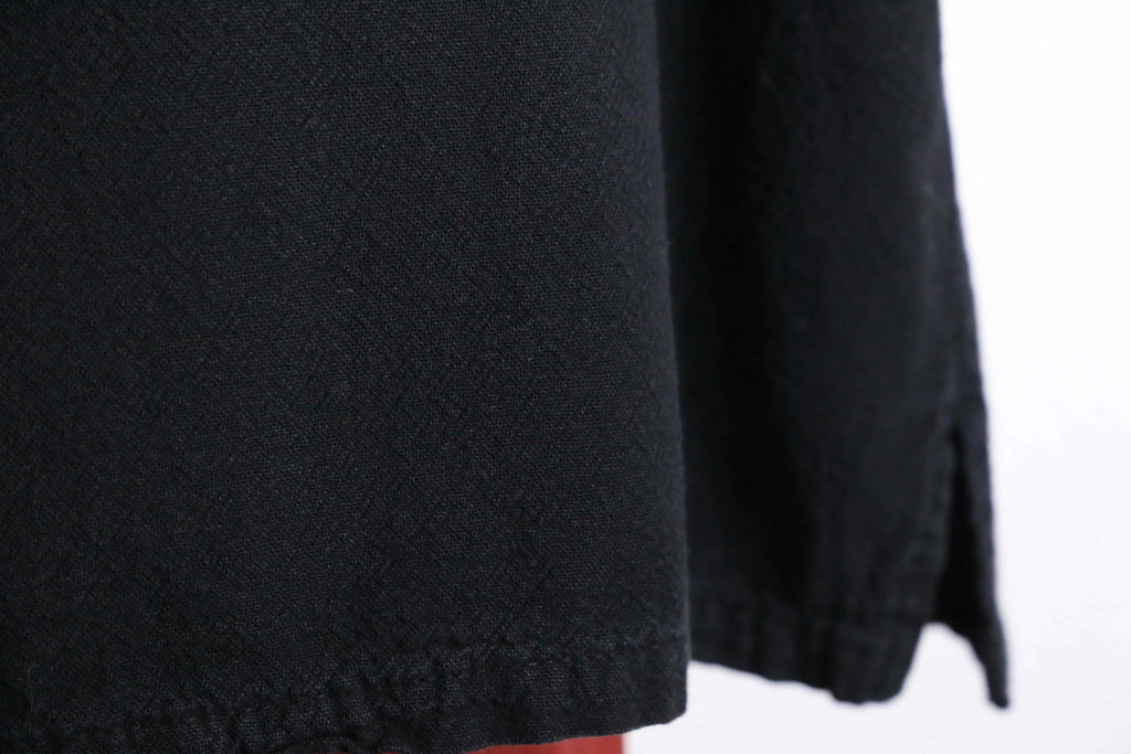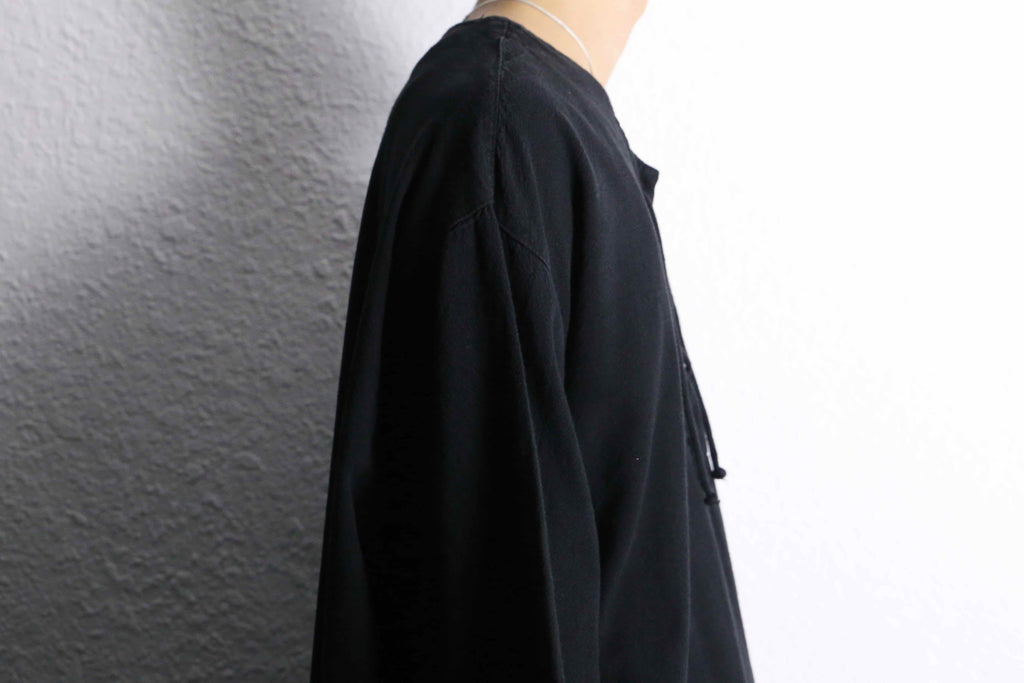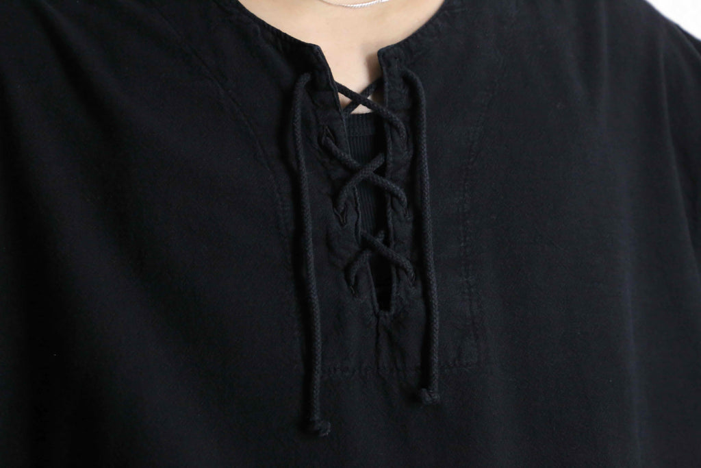 袖丈が七分になっており、やや和な要素も感じる一着。コットンらしいやや硬さのある生地感に、柔らかさを感じるレースアップというデザインが加わり、シルエットが良いナチュラルなアイテムへと昇華しています。