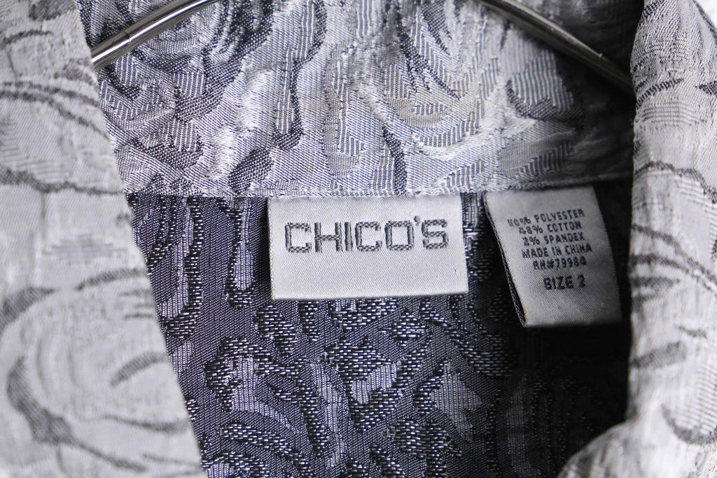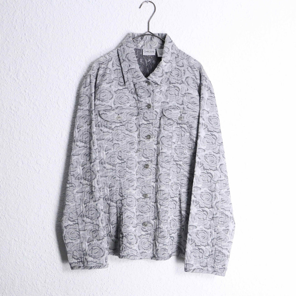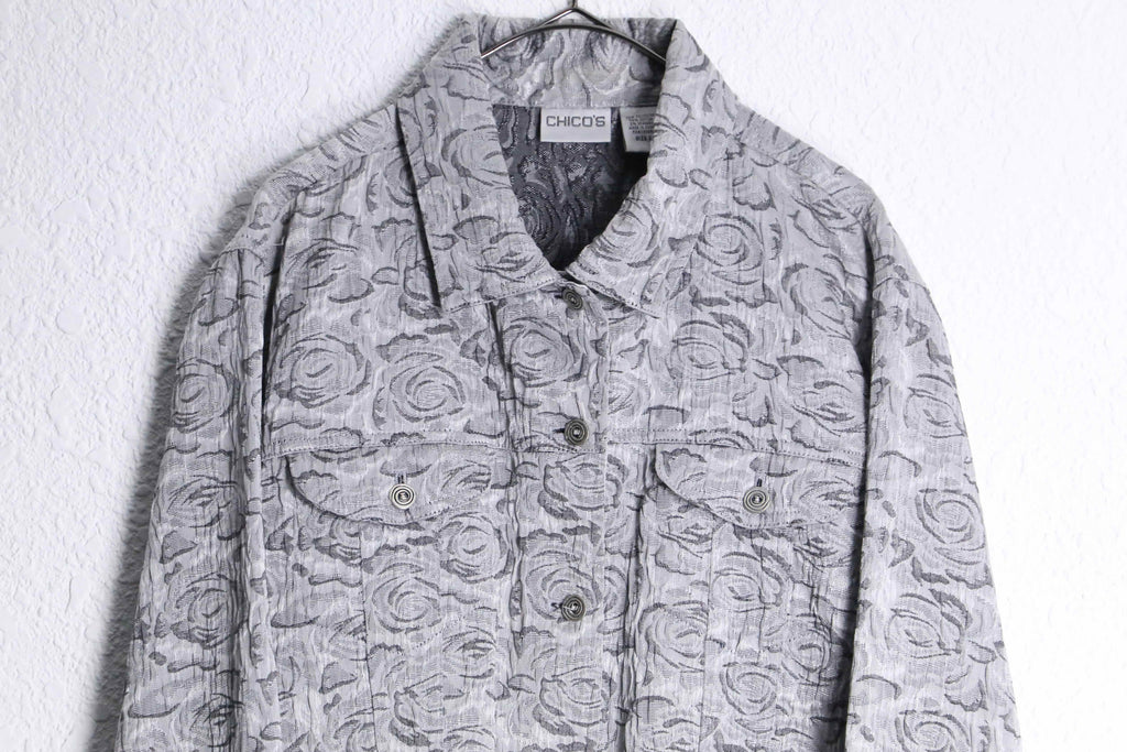 ・"CHICO'S" silver rose bouquet jacquard tracker jacket