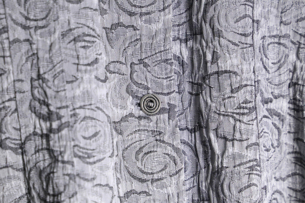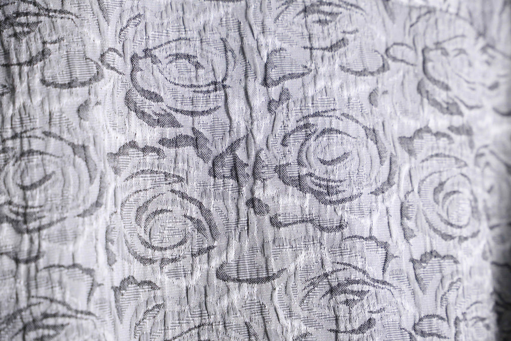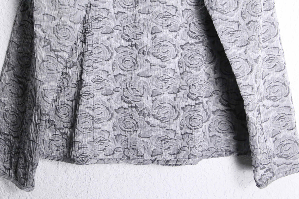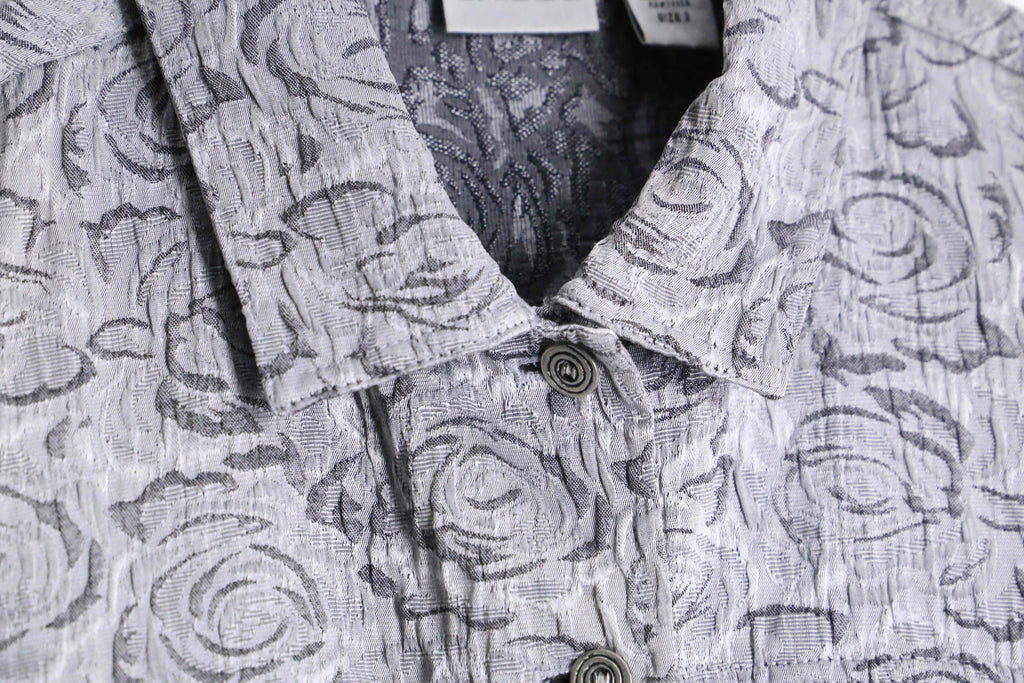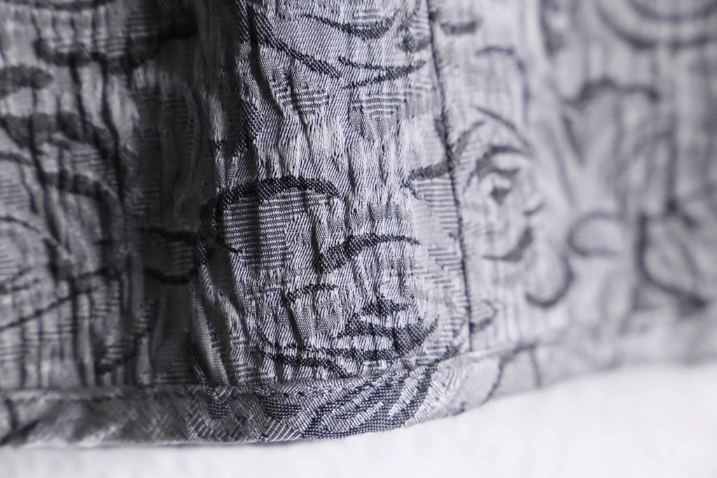 2種のグレーによるジャガード織が上品な雰囲気を醸し出す1着。派手になりがちな薔薇の総柄ですが、同色によるジャガード織で表現する事でスラックスやデニムにサッと合わせられる汎用性にも優れたアイテムとなっています。
