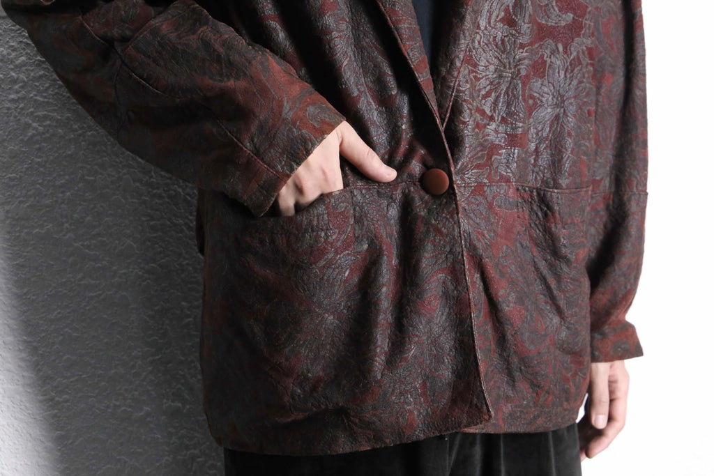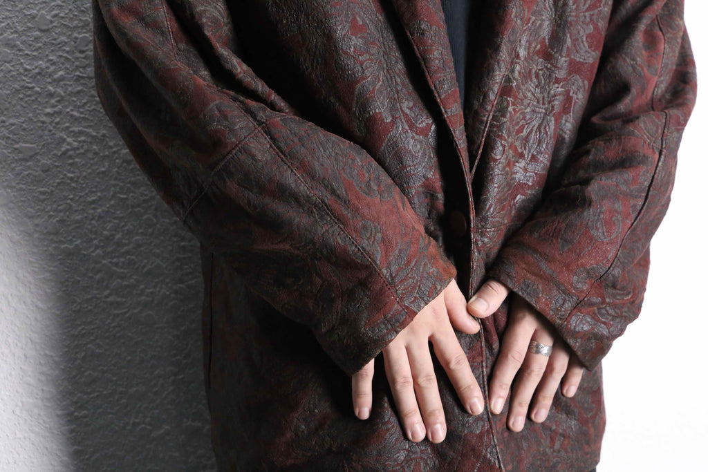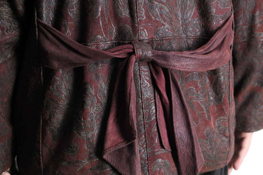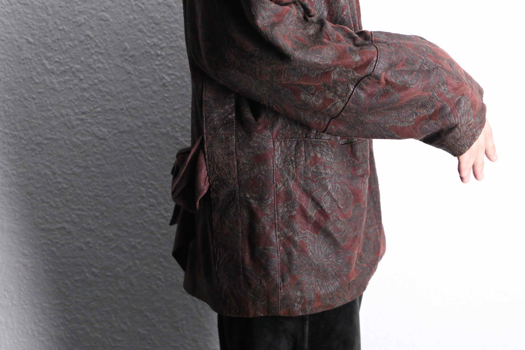レザーアウターとしては異例と言っても良いほどの薄手で柔らかいリアルレザー、しかもボルドーカラーに花柄を落とし込んだ総柄という、これまたレザーとしては異例なデザイン。唯一無二の逸品です。