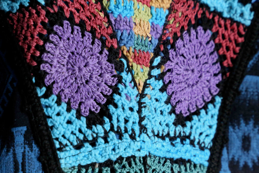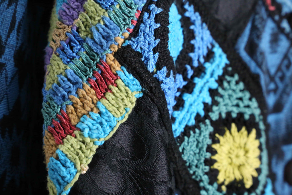 ブラックとターコイズブルーの落ち着いた色味をメインに据え、クロシェニットで鮮やかな色味をアクセントとして取り入れた立体感のある総柄コート。