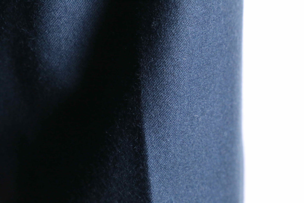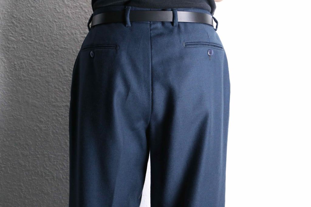 ヴァージンウール100%という上質な生地によって表現された深みのあるダークブルーカラーは汎用性も高く、ウエストの2タックが生み出すドレープの美しさも相まって品性を感じさせます。渡り幅もしっかりと採ってあるため、靴に程よく溜まるラフさも顕現。