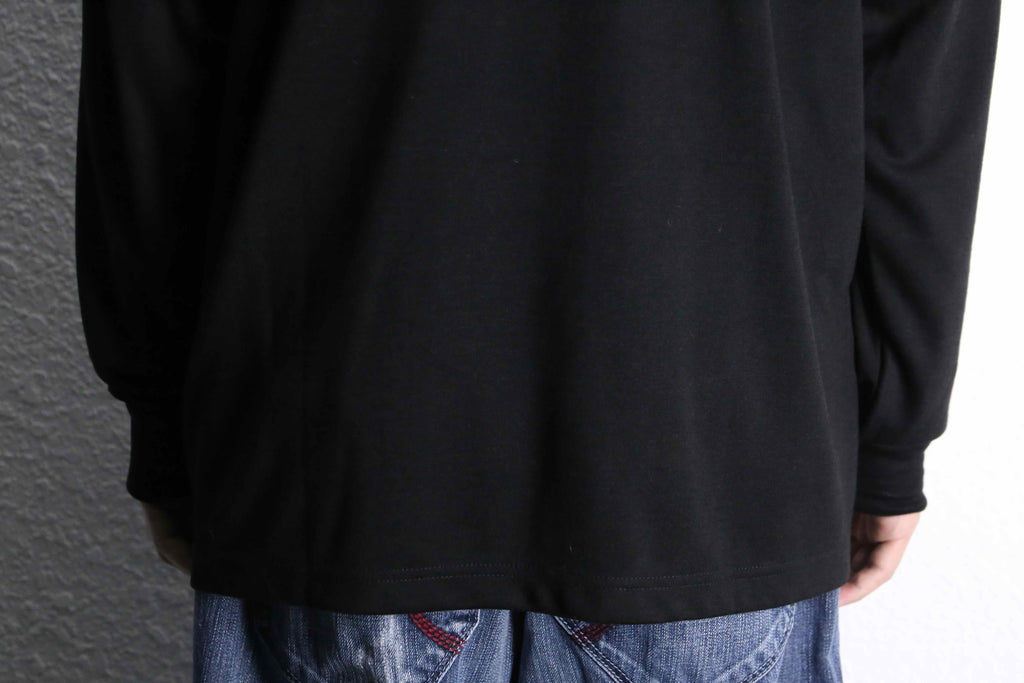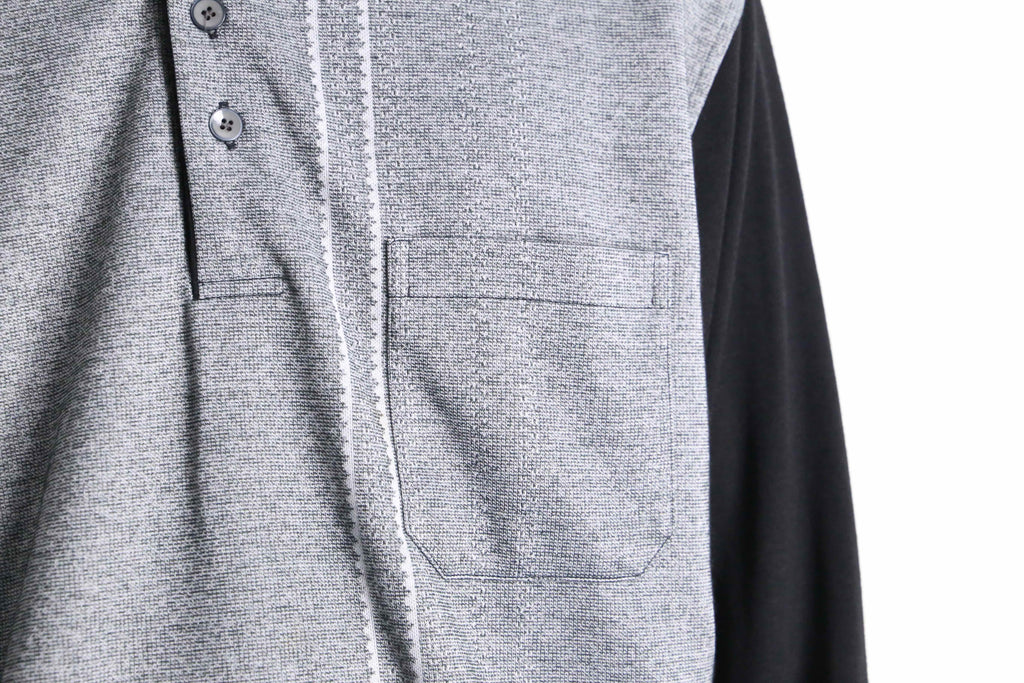 グレー×ブラックの切り替えとフロントのデザインが印象的な長袖ポロシャツ。