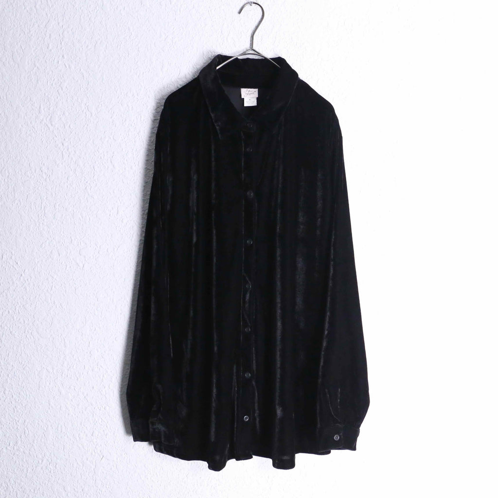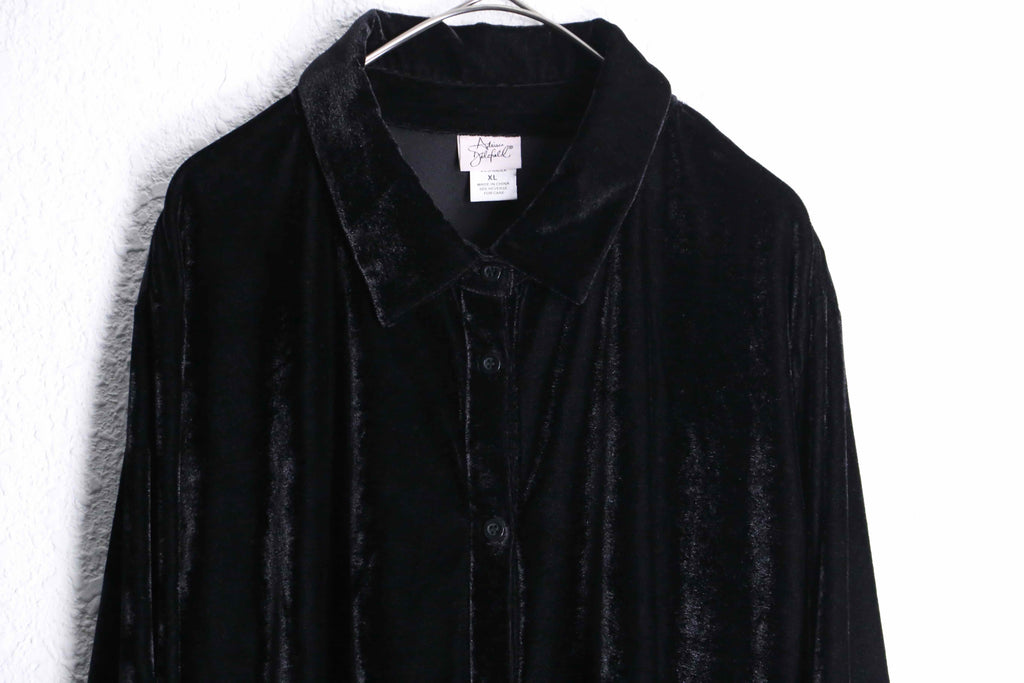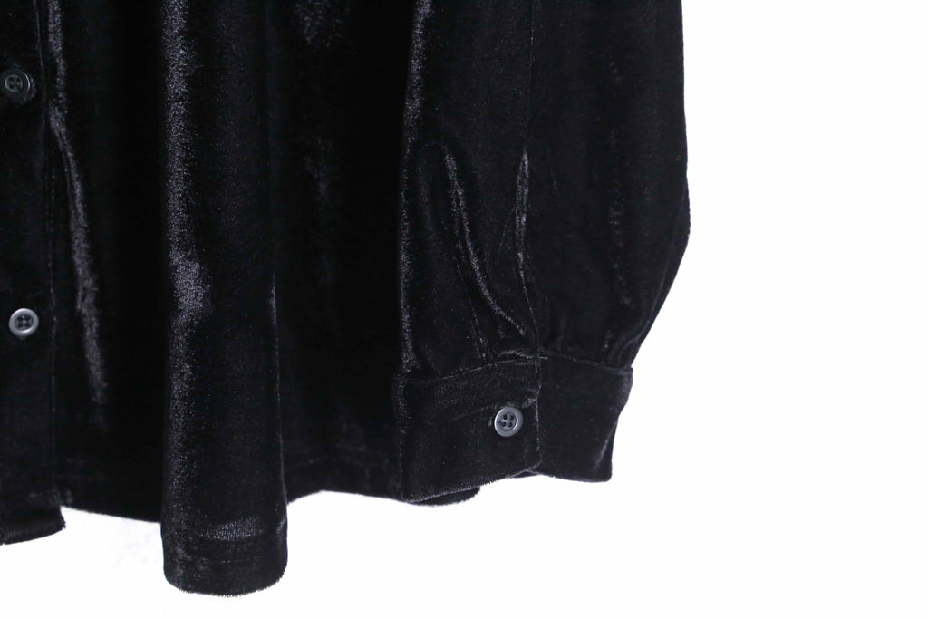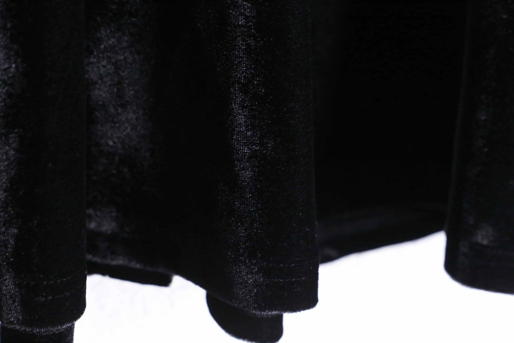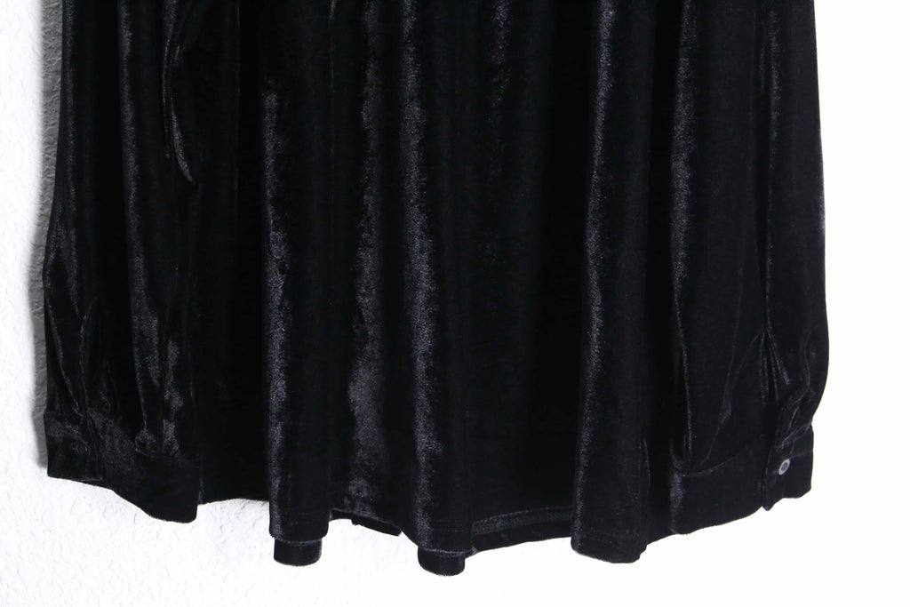 ブラックワンカラーのシンプルなデザインの1着。伸縮性のあるベロア生地がリラックス感のある柔らかな着心地で、ゆったりとしたシルエットの良い1着。