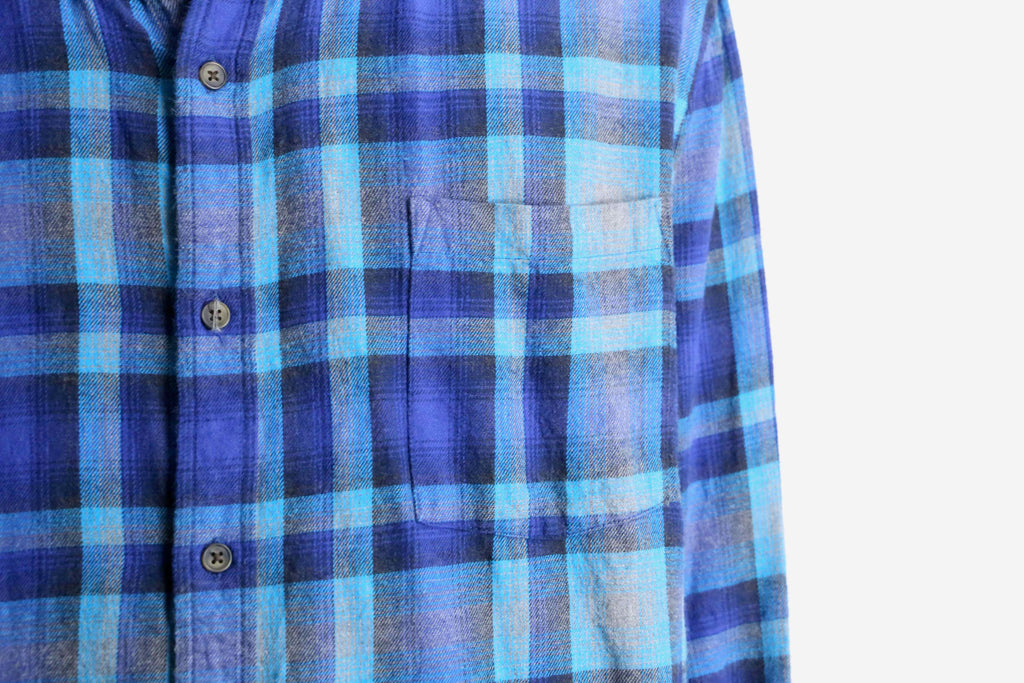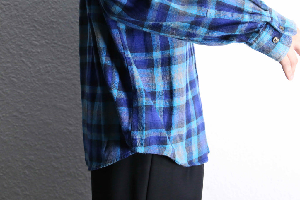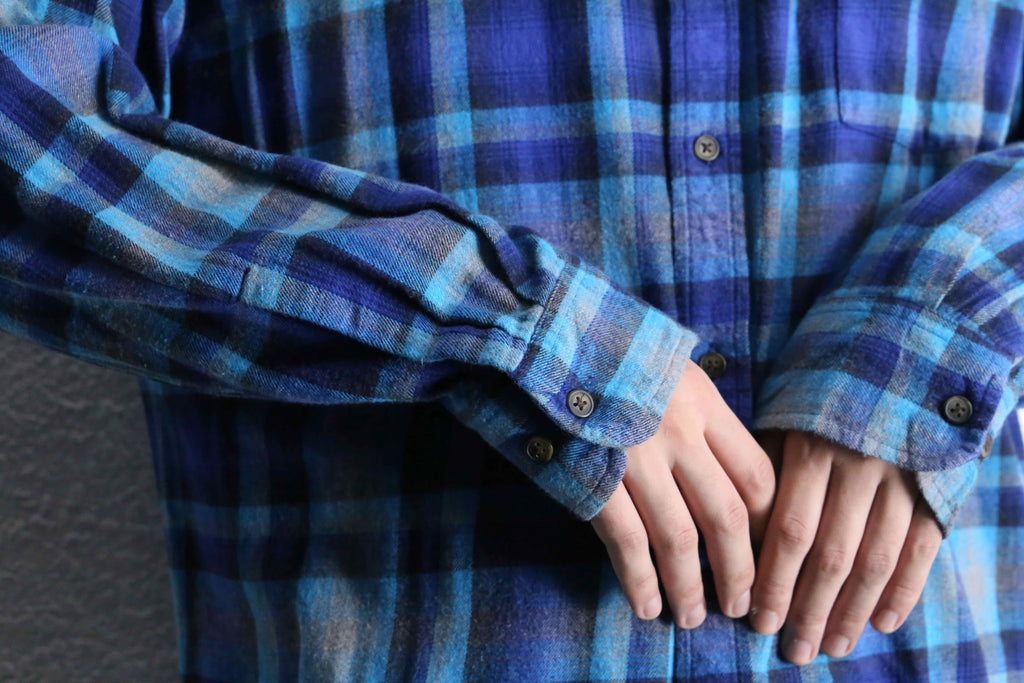 発色の良いブルーを使ったグラデーションで、鮮やかながらもどこか大人らしい雰囲気が魅力の一着。コットン100%のフランネル生地で生地感もよく、寒くなるこれからの季節に汎用性も高いです。