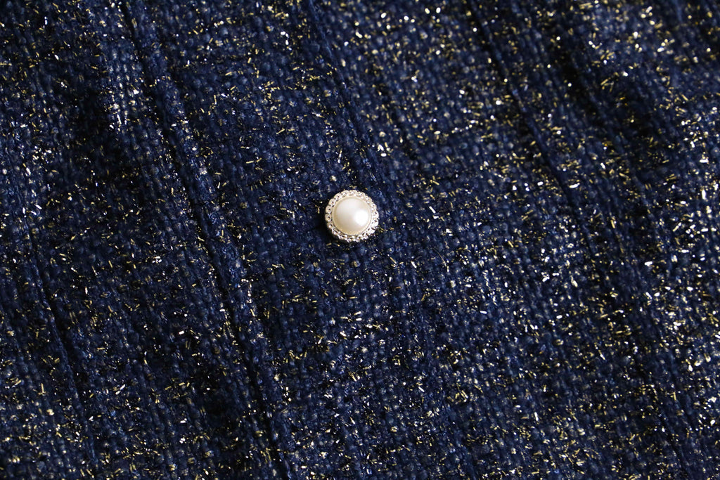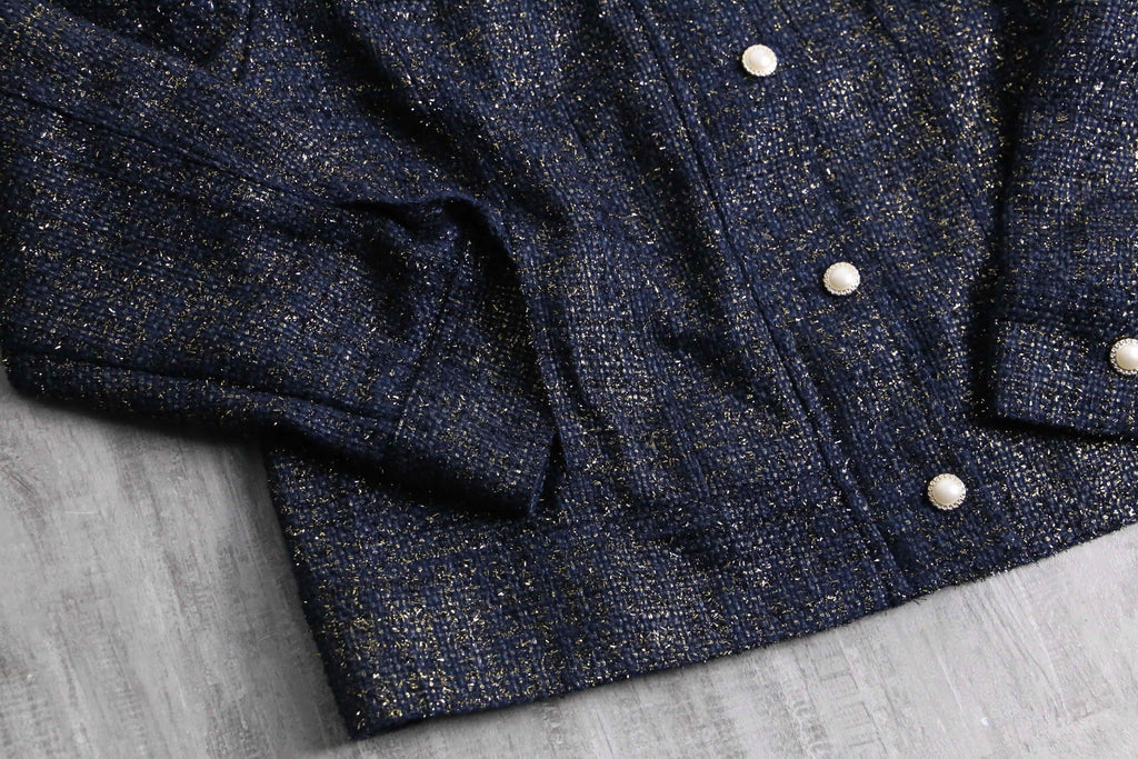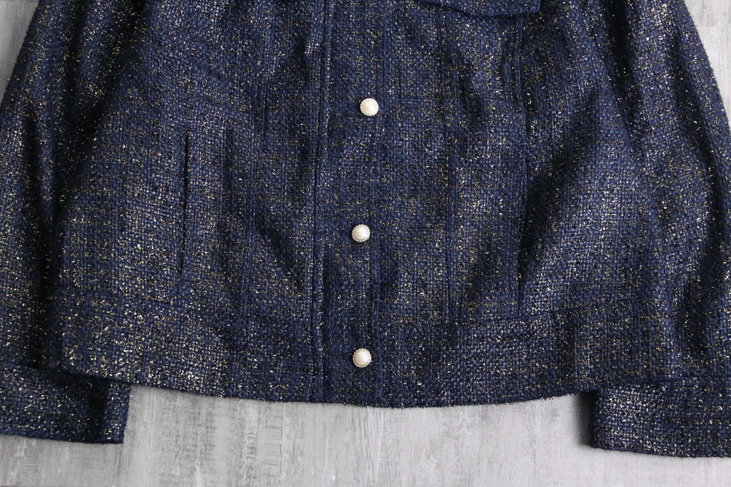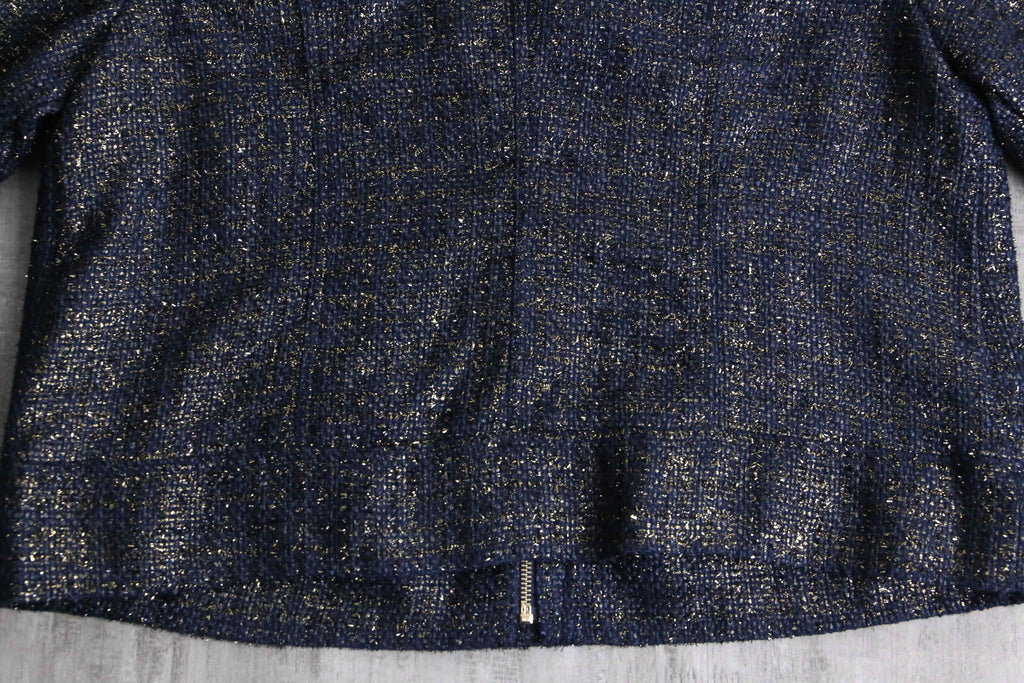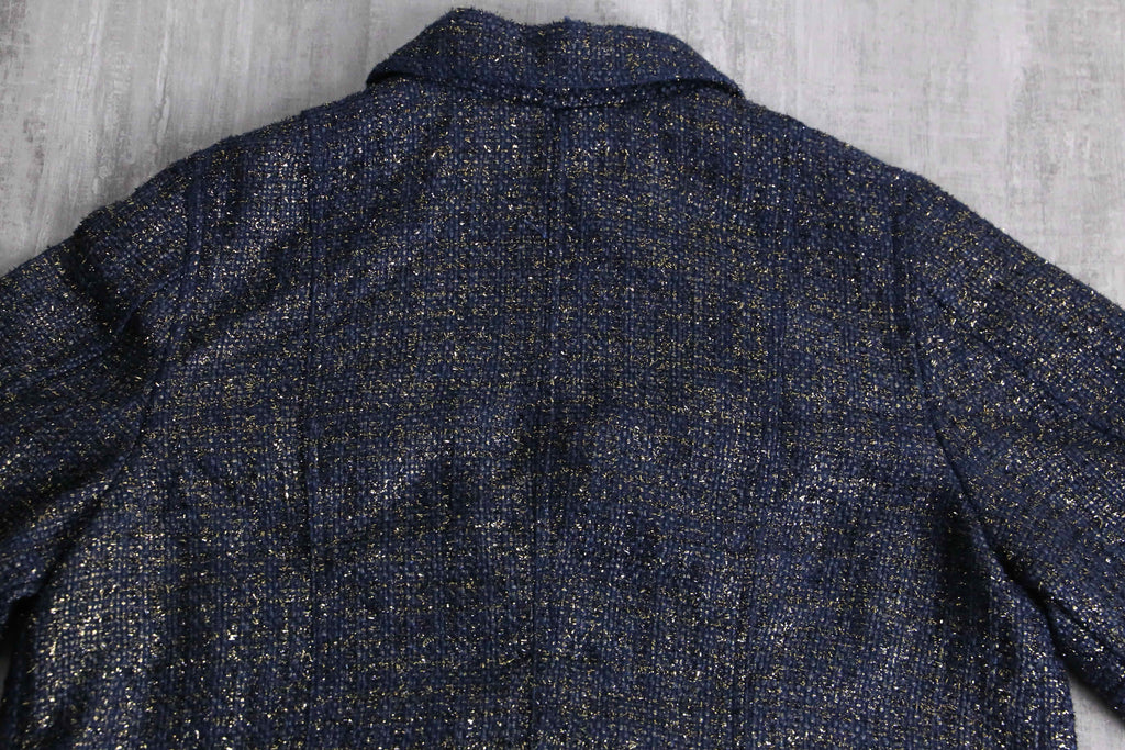 ネイビーというシックな色味に浮かぶゴールド糸が美しい一着。ジップアップで比翼仕立てとシックに合わせられる仕様。サイズは3とメンズでも着用可能な優れもの。ボックスカットのおかげで丈は短く身幅は広く取られたため、着心地も◎