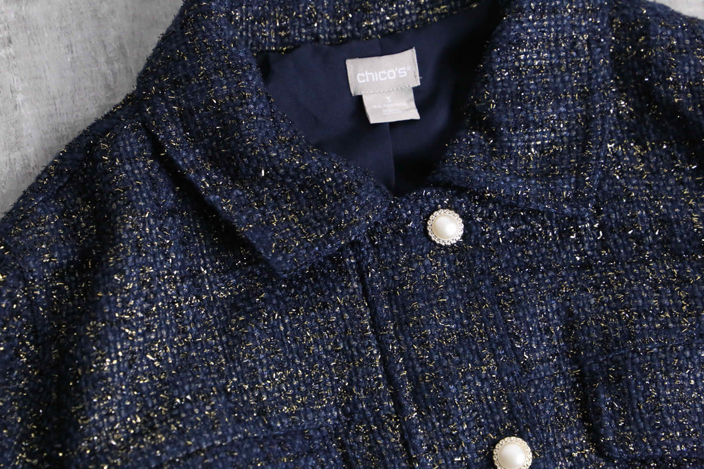 アメリカのレディースブランドの中でもデザイン性が特出して素晴らしい”CHICO’S”より、ラメツイードジャケットの入荷。