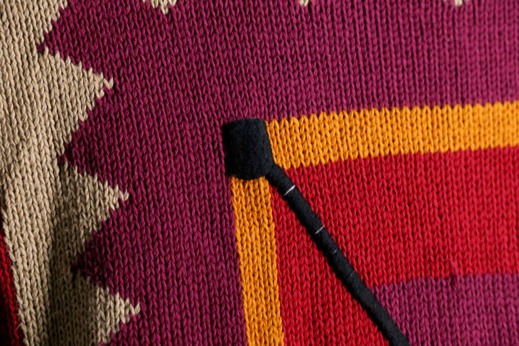 民族調のデザインや立体的なフラワーモチーフ、幾何学柄が丁寧に編み込まれており、アートを思わせる存在感。ネックラインや裾、袖口には紺の縁取りをすることで顔周りやボトムスと馴染みやすくなっているなどディテールまでこだわりが感じられる逸品です。