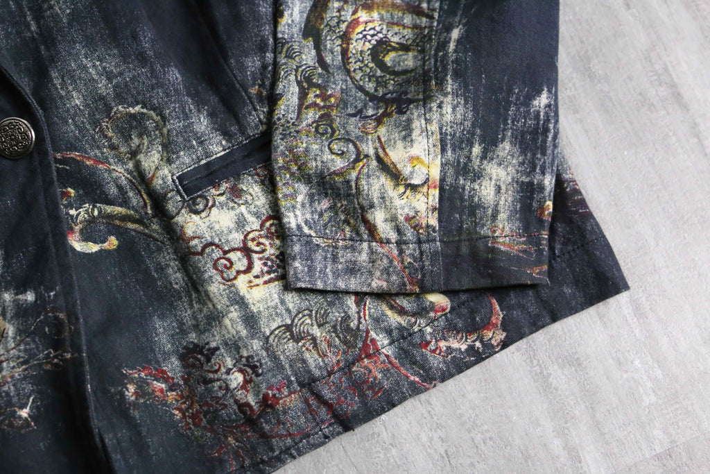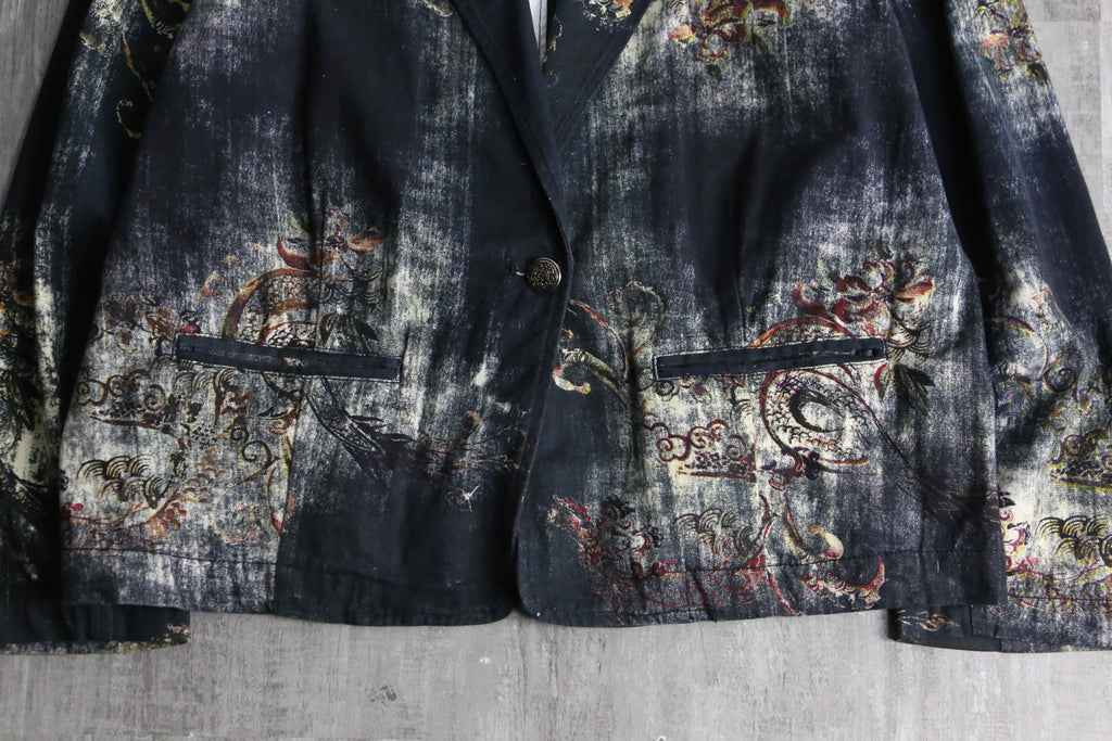 掠れた花柄。インディゴボディに映えるカラーリング。まるで抽象画のような弧を描いたデザイン。圧倒的なビジュアルのイージーテーラードとなります。コットン100%生地は程よく柔らかく、張りのある綺麗なシルエットを描きます。