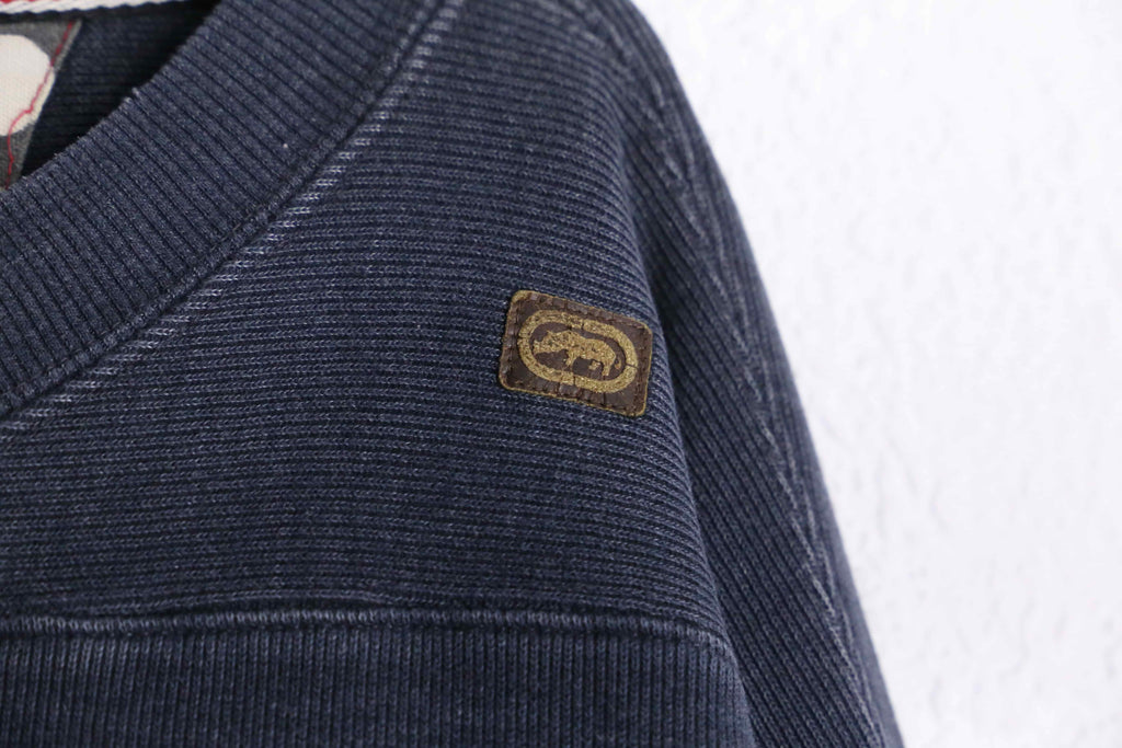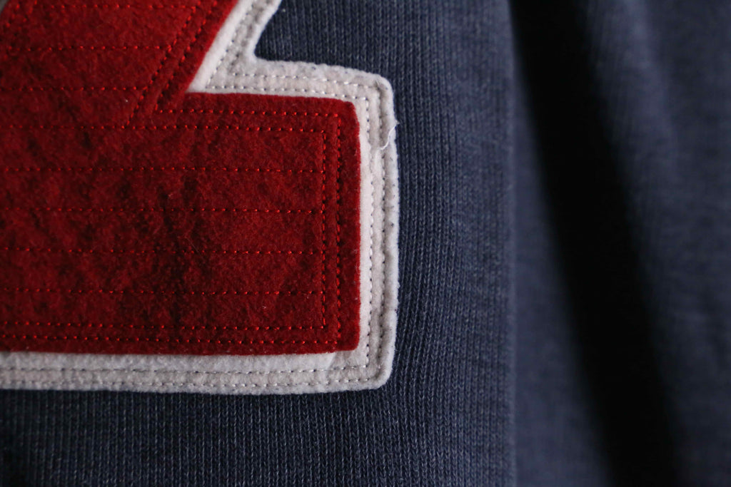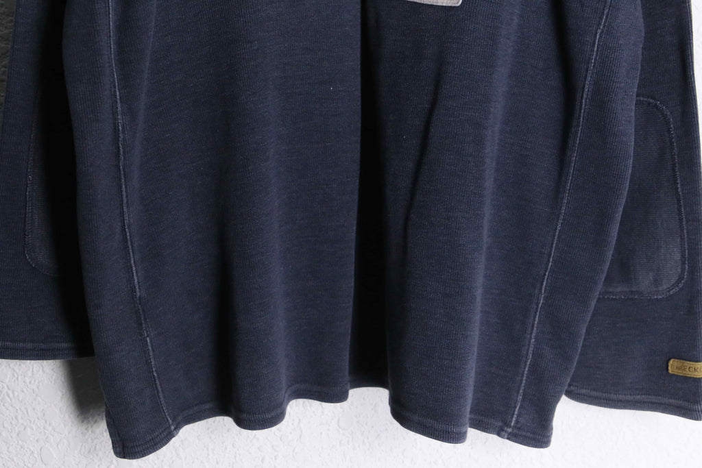 伸縮性のある生地とナンバリングワッペンが可愛らしい一着。色褪せたネイビーカラーがまた独特な風合いを出しており、赤や白のカラースイッチがより映えるアイテム。両袖にはサイの刺繍が入ったワッペンもつき、全体のどこを見てもECKOらしくて良いですね。