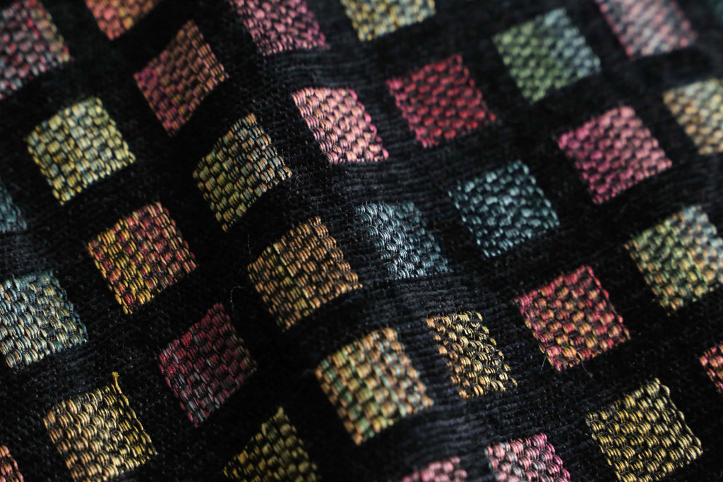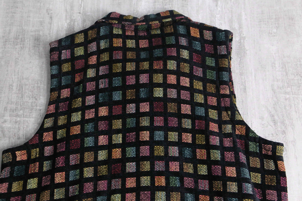 四角系の柄が規則的に並んだフロントジップジャガードベストの入荷。