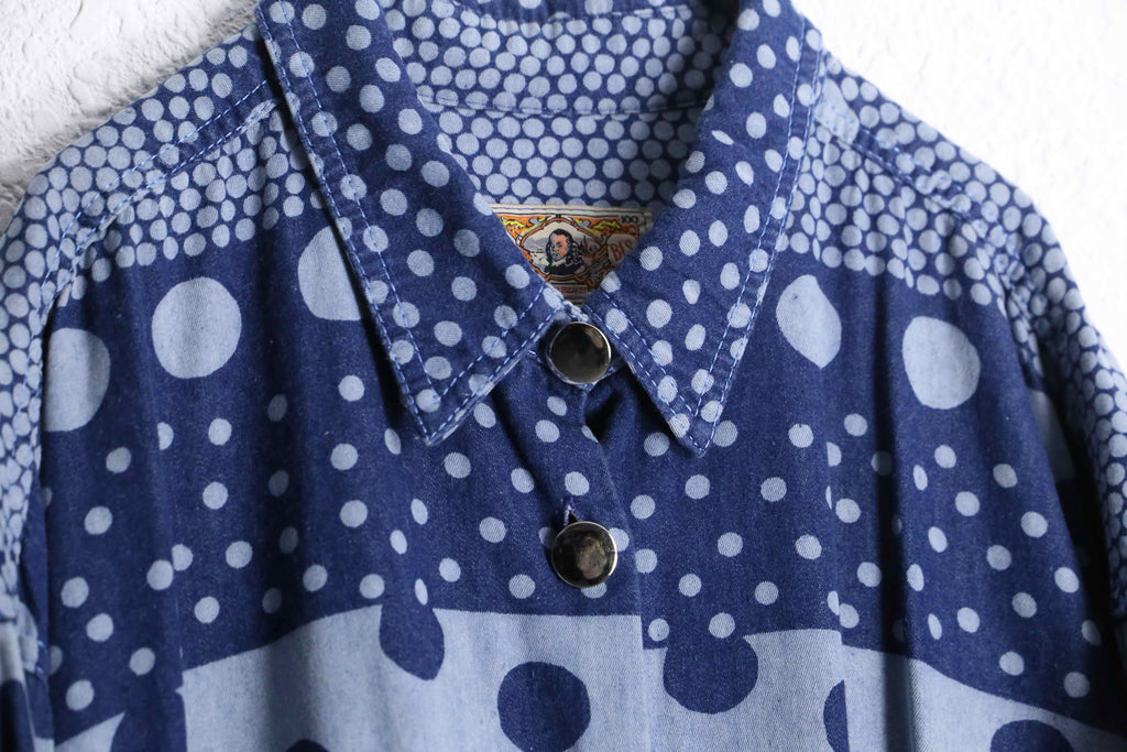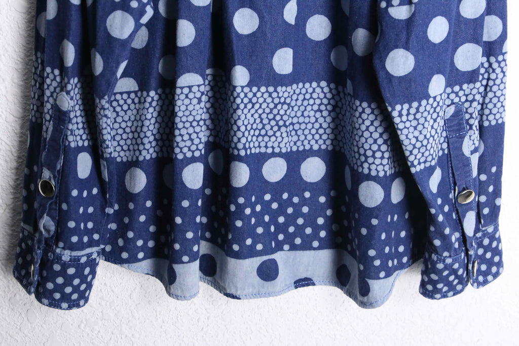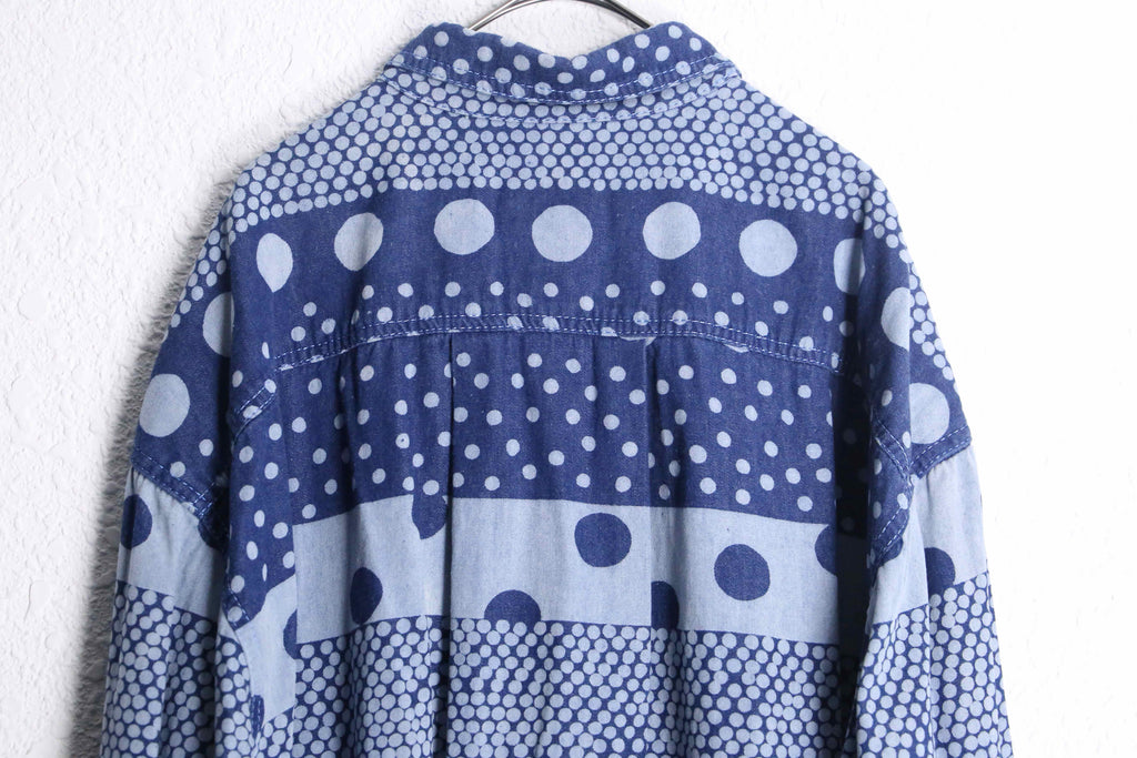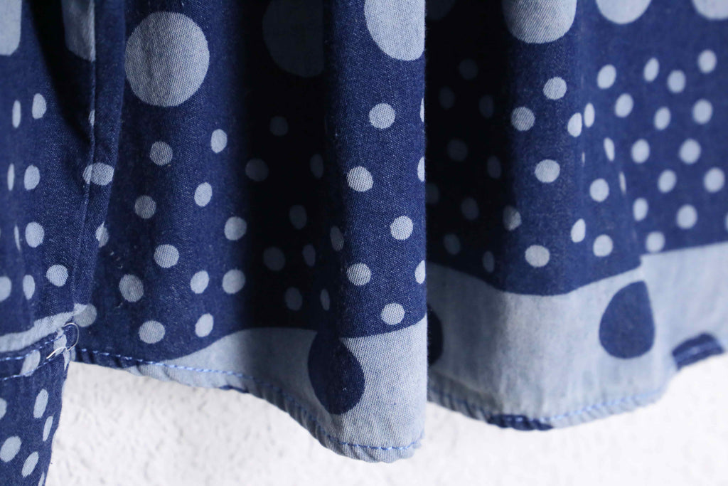 細かさや密度が異なるドット柄をボーダー切り替えのように配置したデザイン色強めのビッグシャツ。柔らかめの薄手デニムを用いる事で生まれる2トーンカラーとルーズなサイジングが可愛らしい1着です。艶々シルバーの大きなボタンもアクセントとして◎