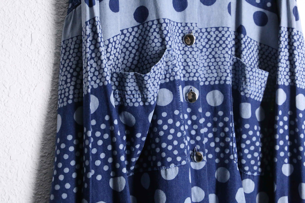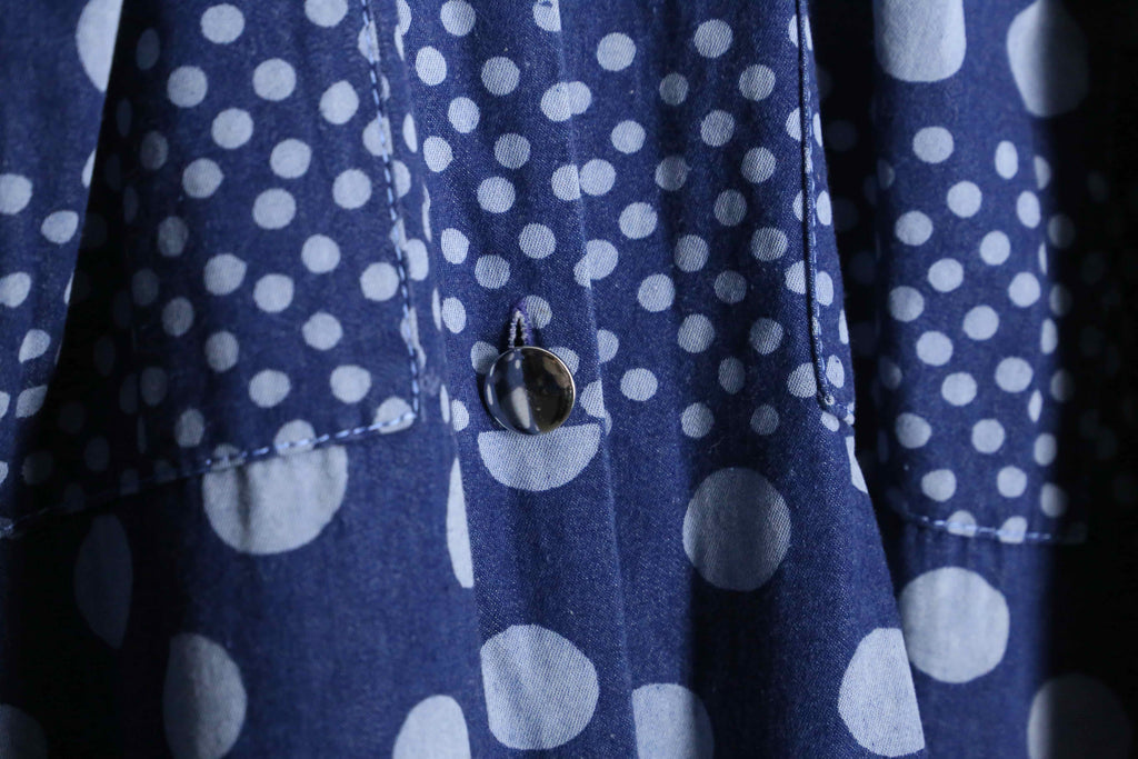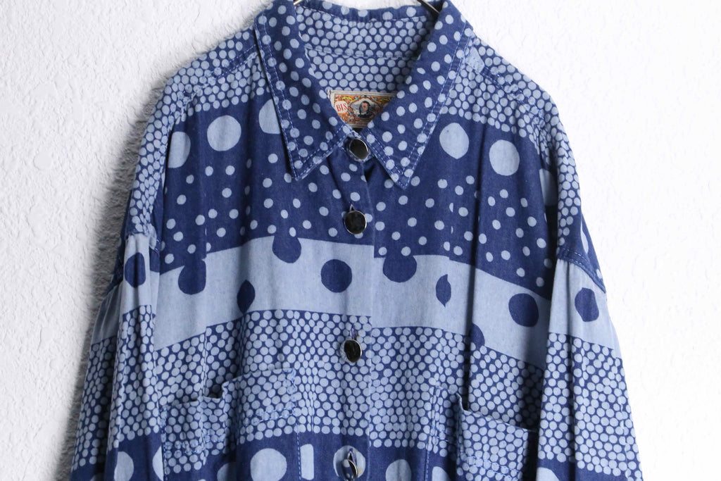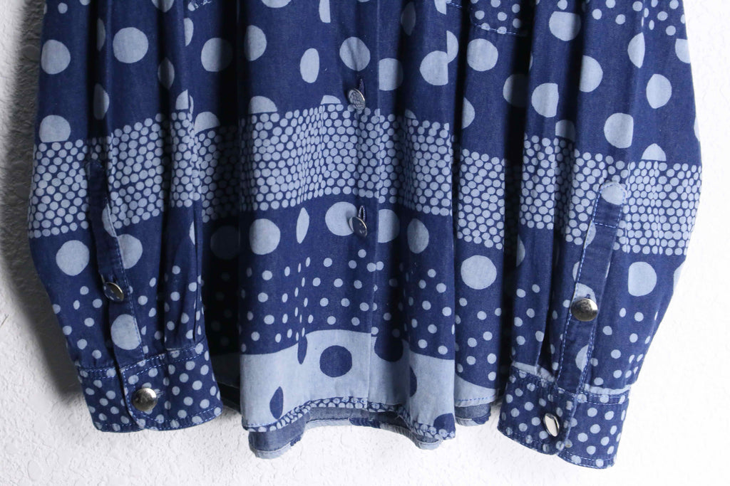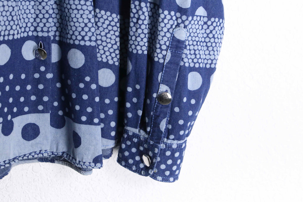 細かさや密度が異なるドット柄をボーダー切り替えのように配置したデザイン色強めのビッグシャツ。柔らかめの薄手デニムを用いる事で生まれる2トーンカラーとルーズなサイジングが可愛らしい1着です。艶々シルバーの大きなボタンもアクセントとして◎