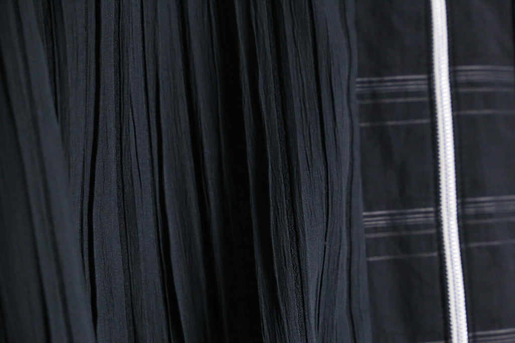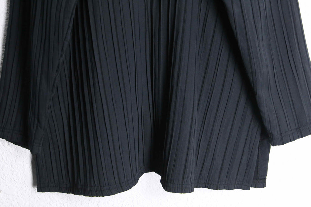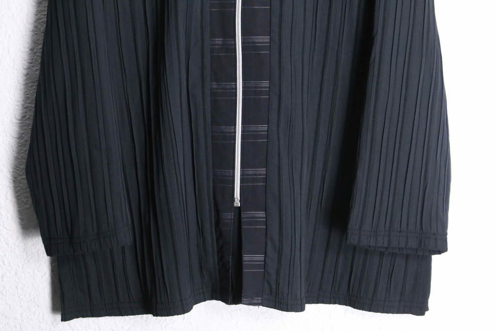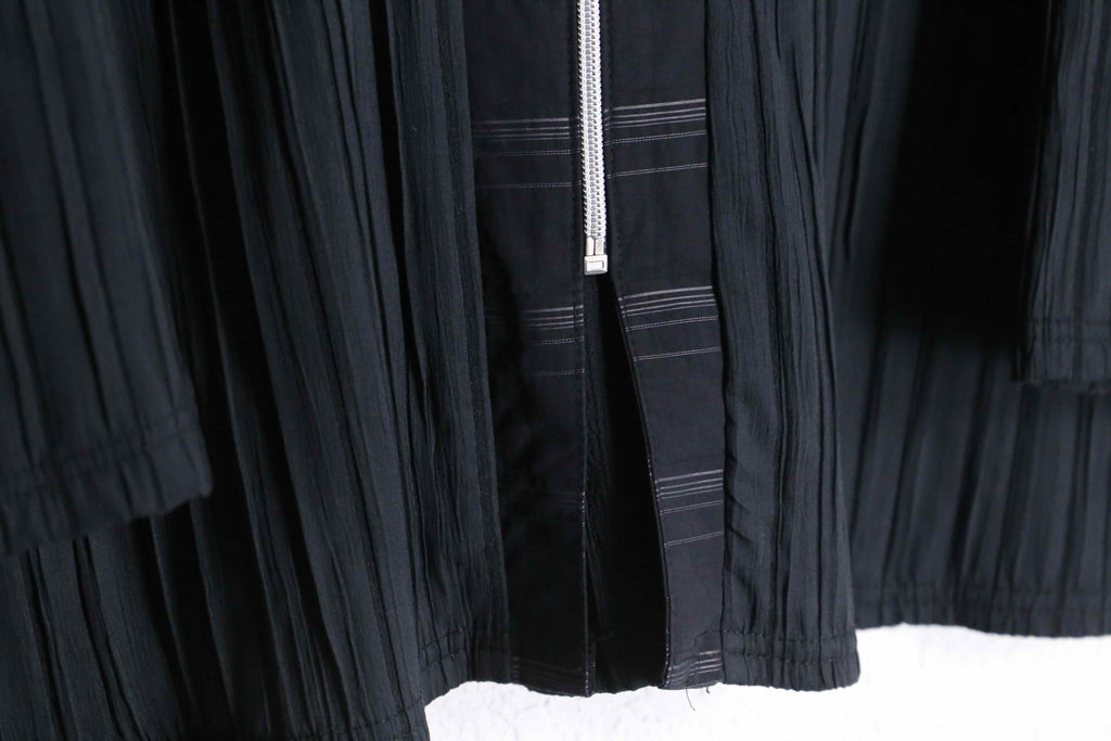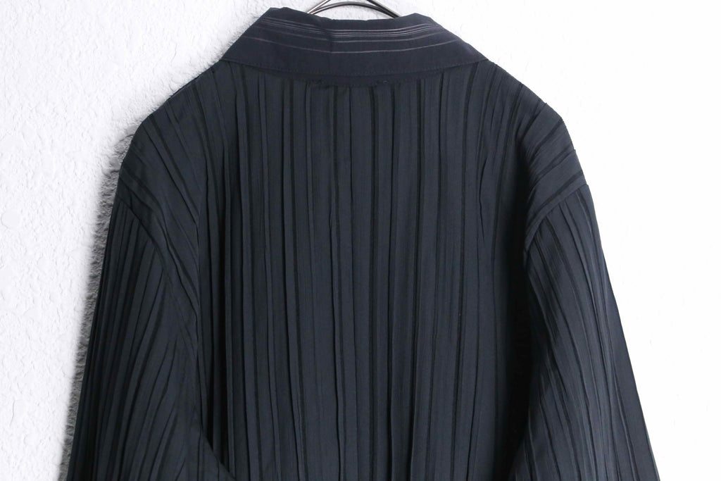 パッと羽織りやすいイージー仕様により今時期はインナー使いでも着用可能な一着。センターラインと襟にはラインデザインが加わり、シックな雰囲気もあるアイテム。シワ加工とプリーツが組み合わさることで他にない独特な逸品に。