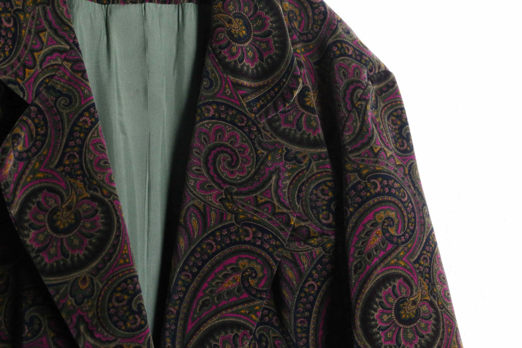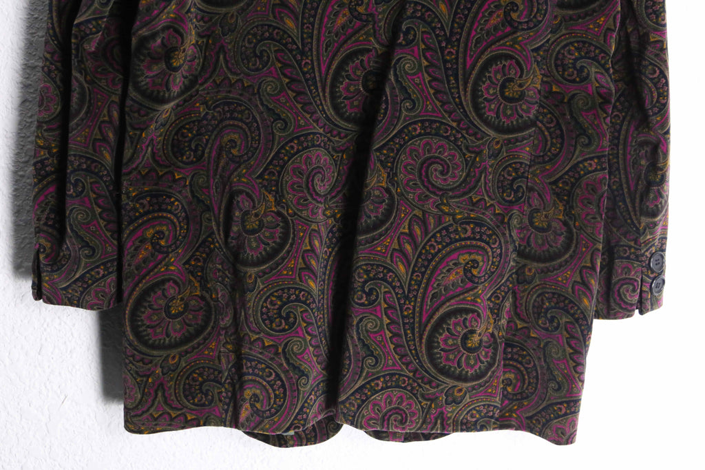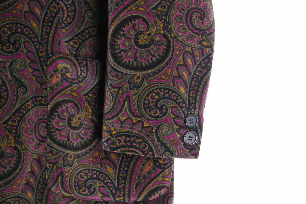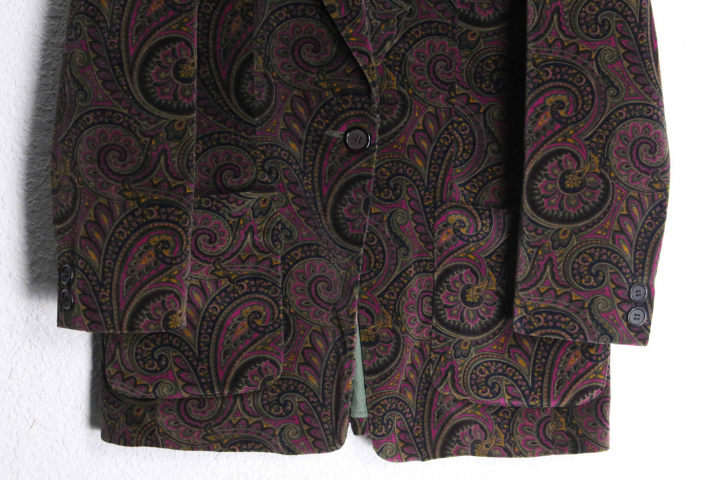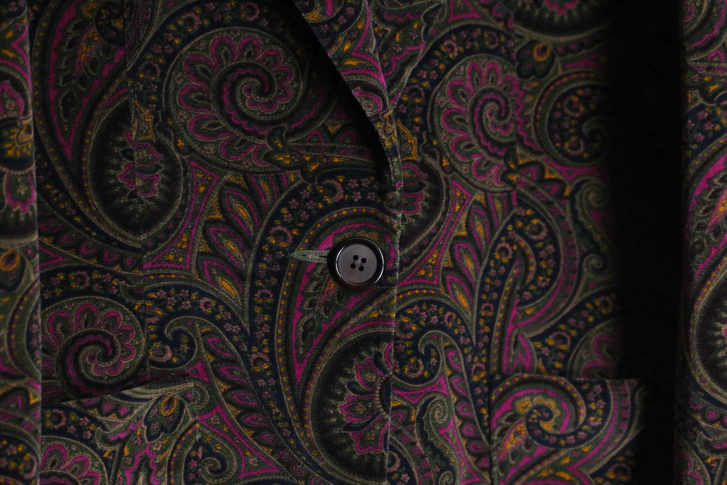 鮮やかなマゼンタピングが珍しいペイズリー柄のパイル生地シングルテーラードジャケットの入荷。