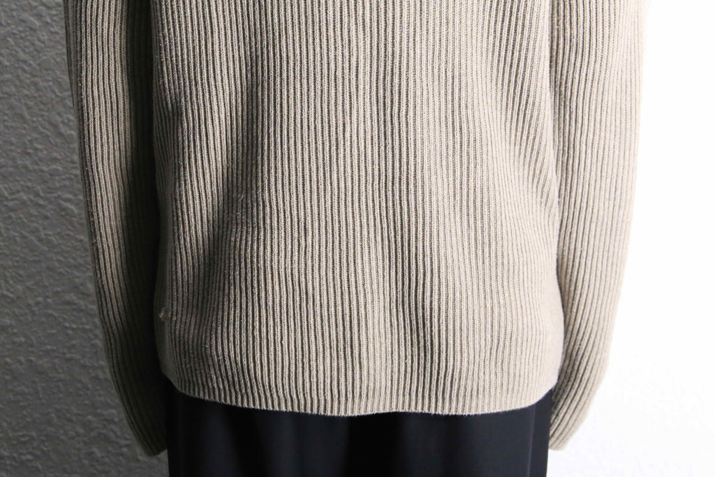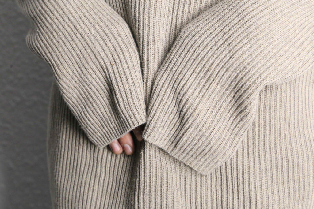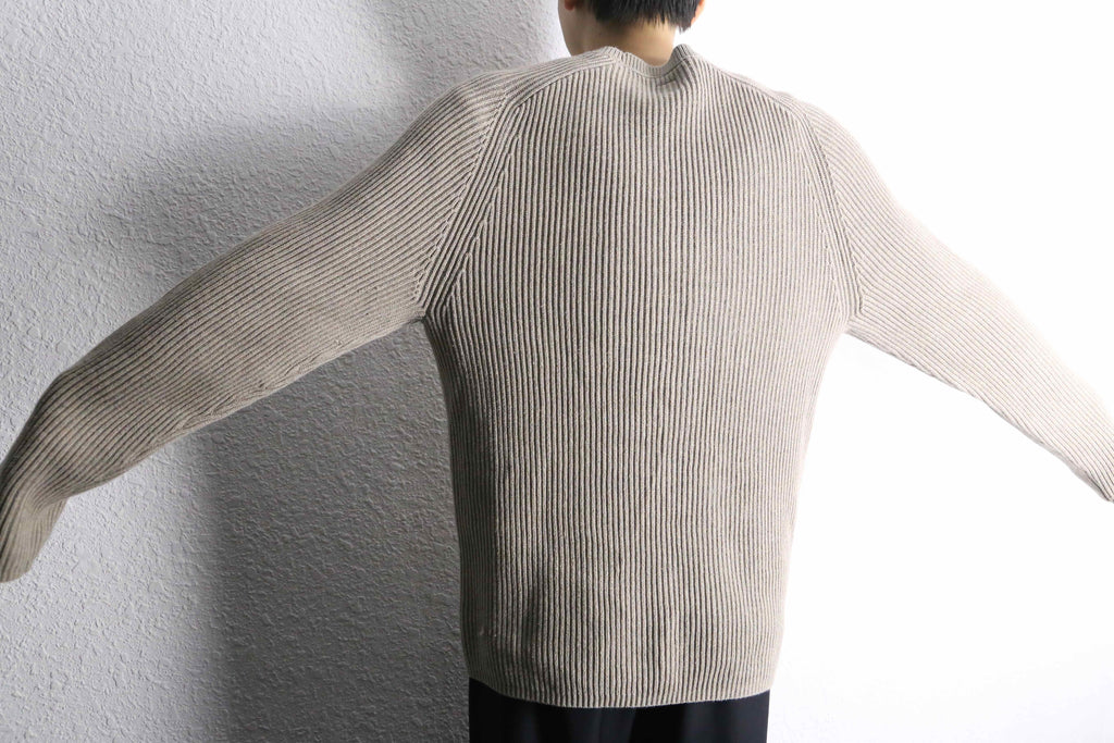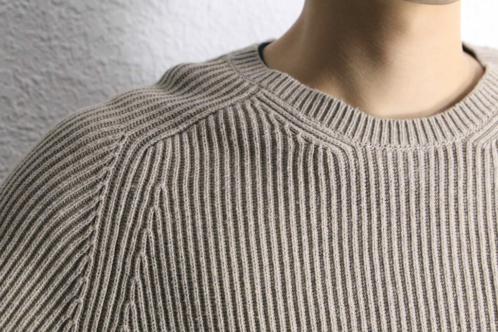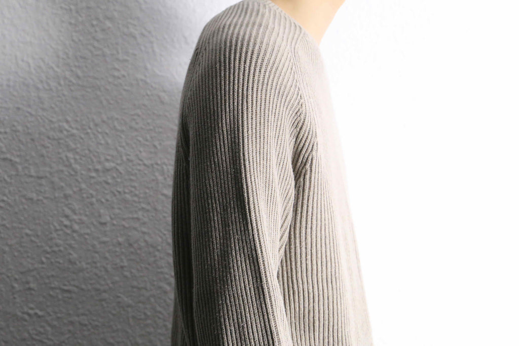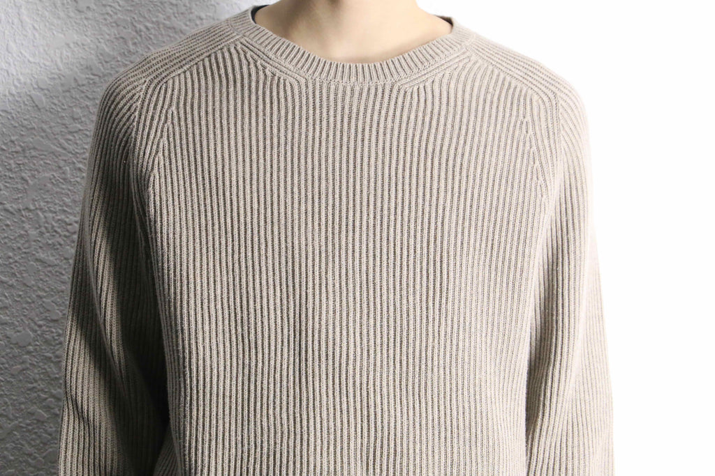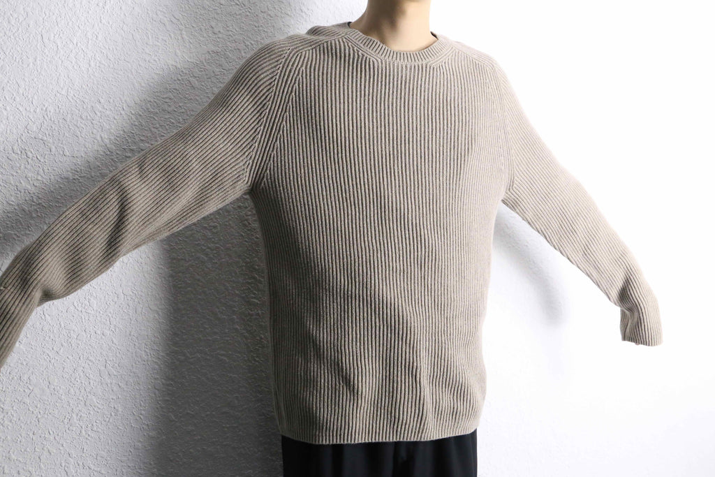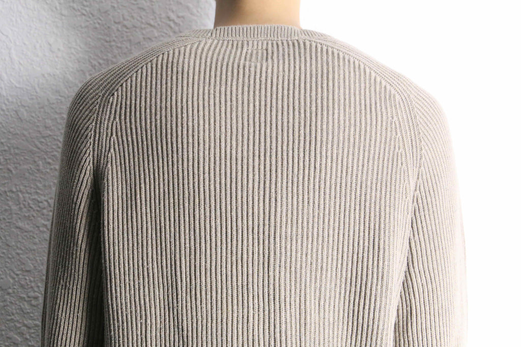 シンプルだからこその汎用性の高さが魅力のベージュニット、今回入荷となるのはラグランスリーブ仕様に縫い目が切り替えられ、自分の体型に合わせてストンと落ちてくれるシルエットが美しい1着です。また、ニットによく見られる袖と裾の絞りがなく、ストンと落ちてくれるカットソーのような着用感も個人的にかなり推しておきたいポイント。