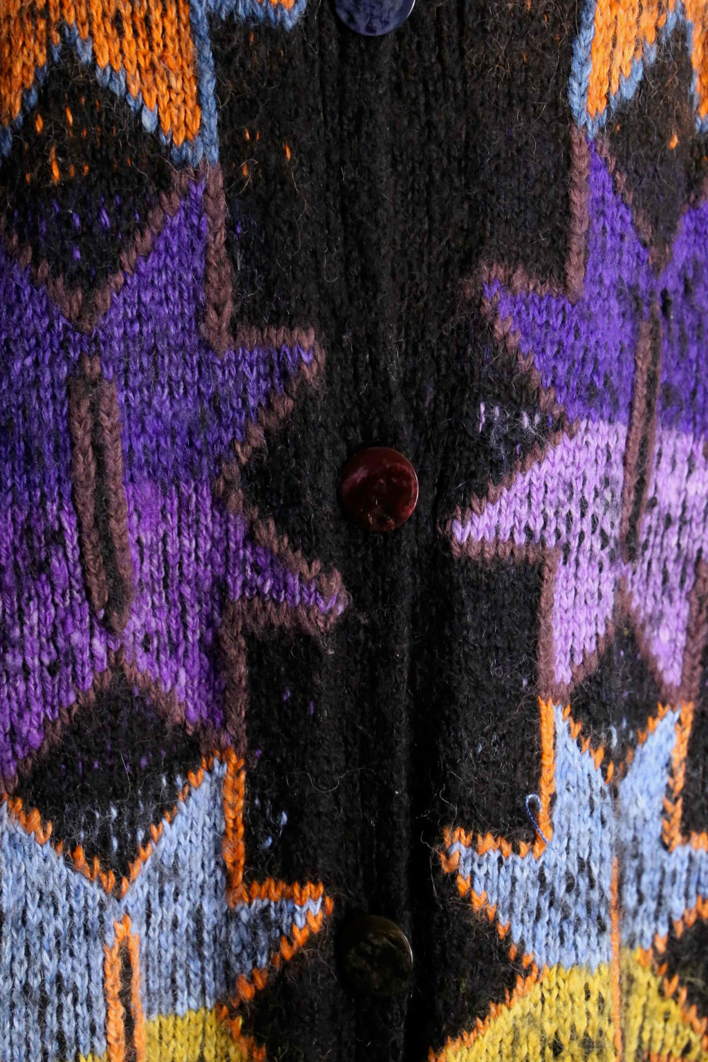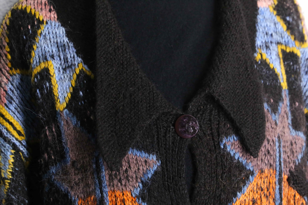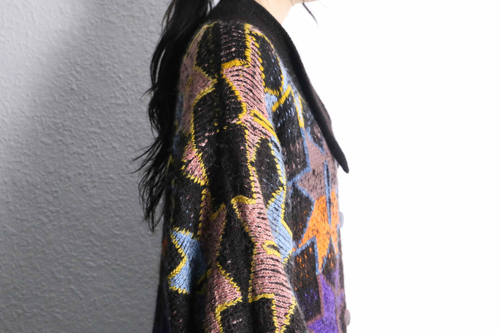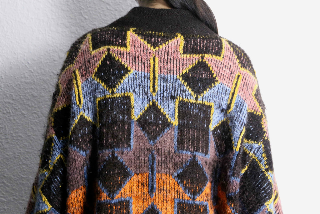 着丈は100cmとシャツというよりガウンのような長さ。編み目は甘めではありますが、ローゲージほど荒くはないため暖かさがありつつ絵柄も綺麗に見える仕様。そしてバルーンシルエットを採用することでよりポップに可愛らしく仕上がった逸品。袖も綺麗に膨らむため、ライトアウターとしてはかなり優秀。