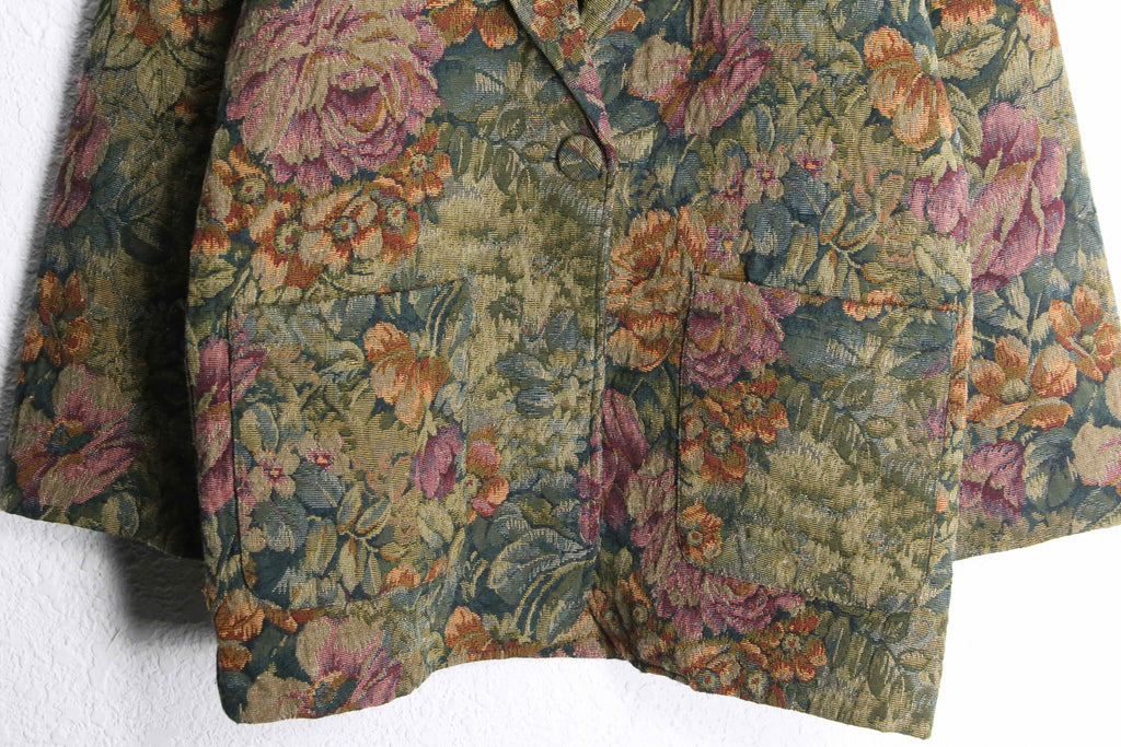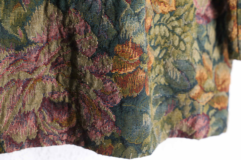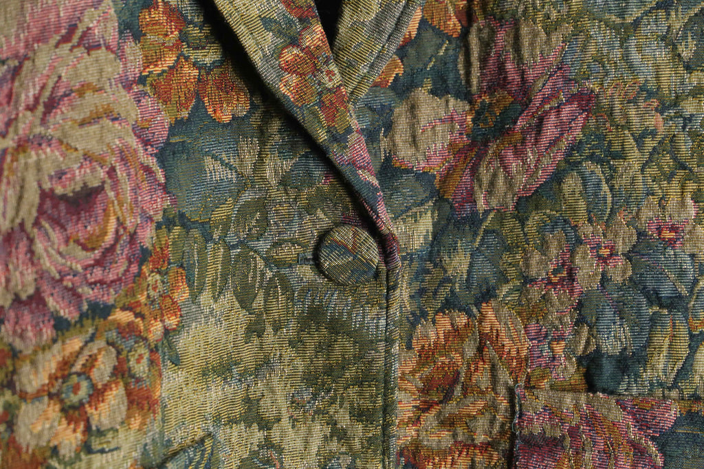 当店で人気の高いゴブラン、ジャガードアイテムたちの中でも一際存在感を放つ、希少価値の高い1着。ワンボタンテーラード型に乗せられたボタニカルデザインが、カチッとした綺麗めエッセンスを含みながらもどこか抜け感のあるルーズなスタイルにも落とし込める万能な逸品。しっかりと肩パッドが入っているため、着崩れすることなく綺麗なシルエットで着用可能。