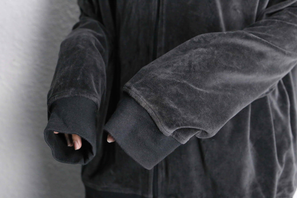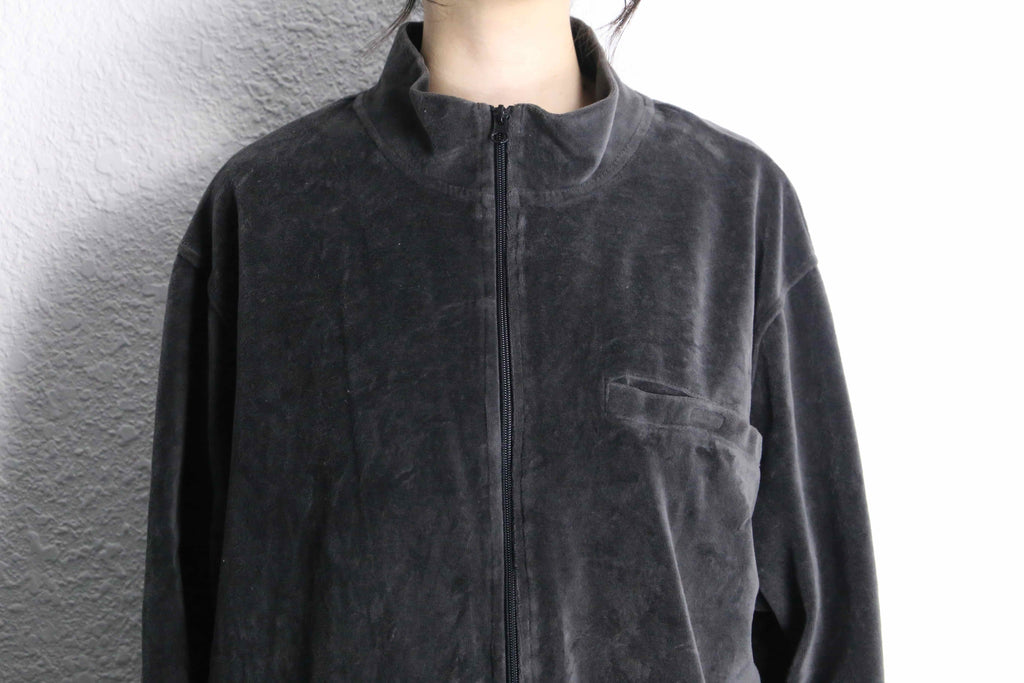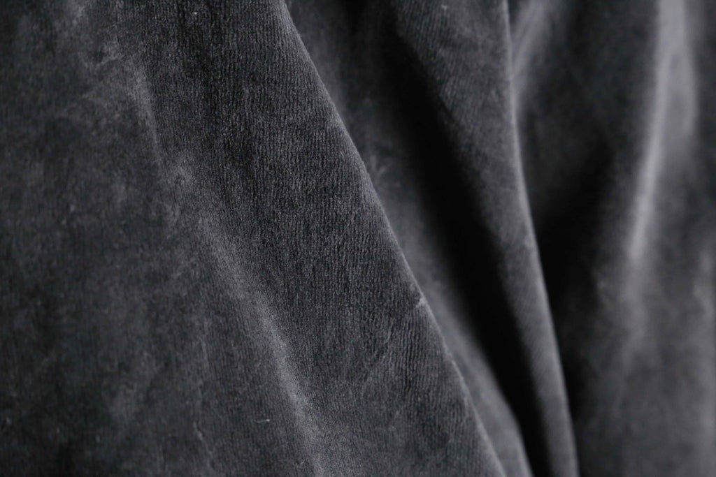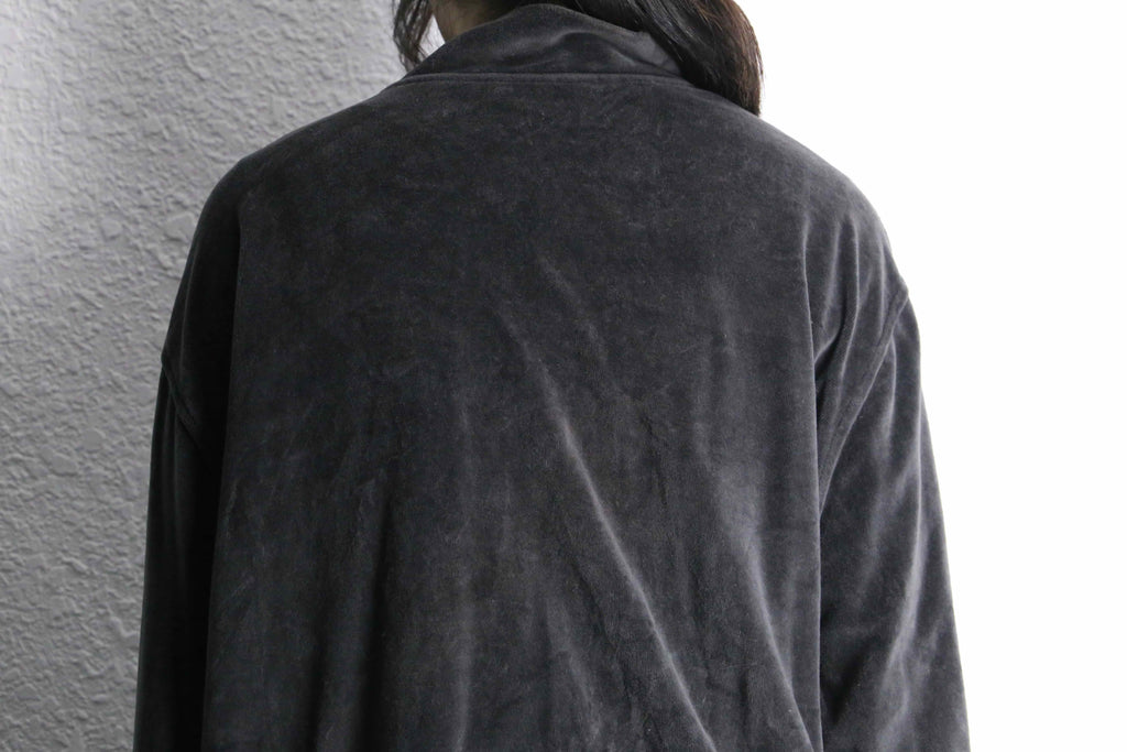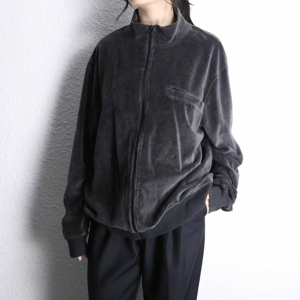 ブラックとグレーの中間色が毛足のあるベルベット素材特有のしっとりした光沢を纏い、カジュアルながらもどこか品のある仕上がりとなった1着。黒スラックスはもちろん、デニムや春カラーのボトムスなどとも相性抜群のお色味です。