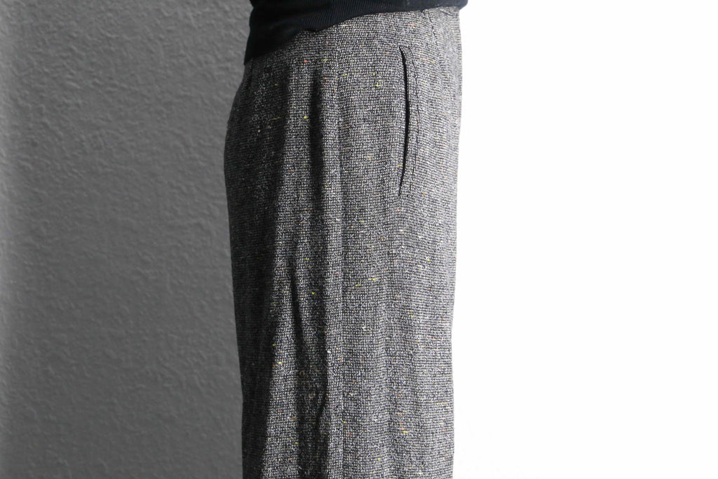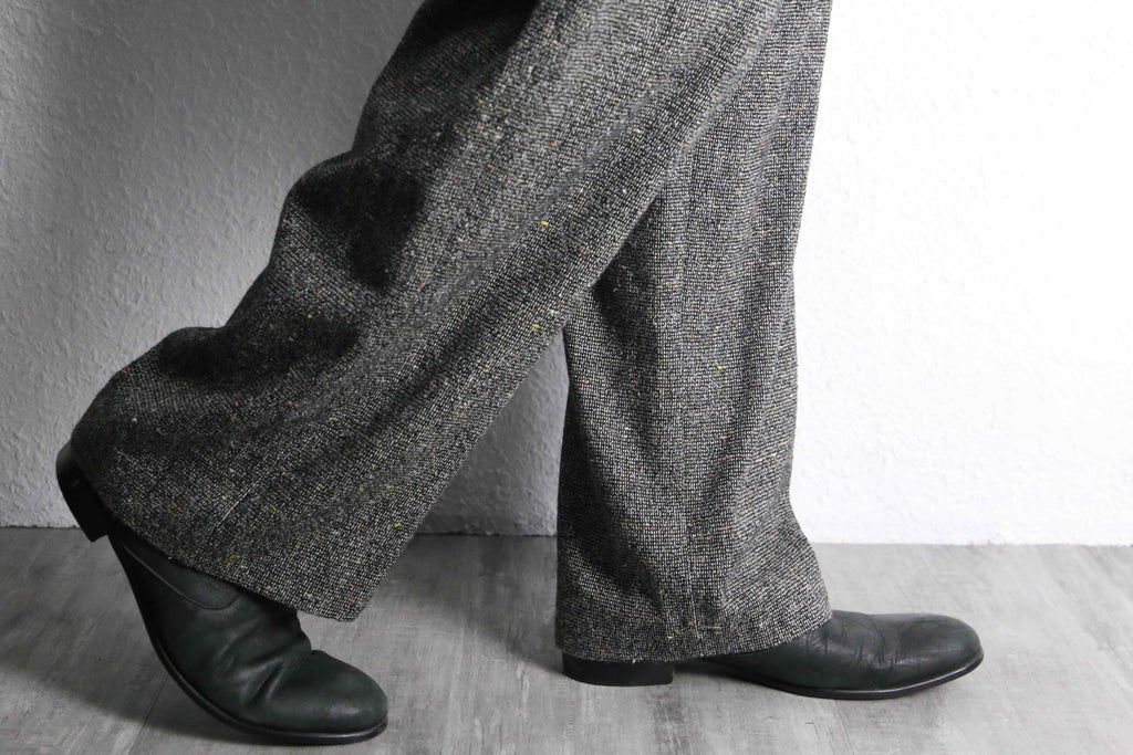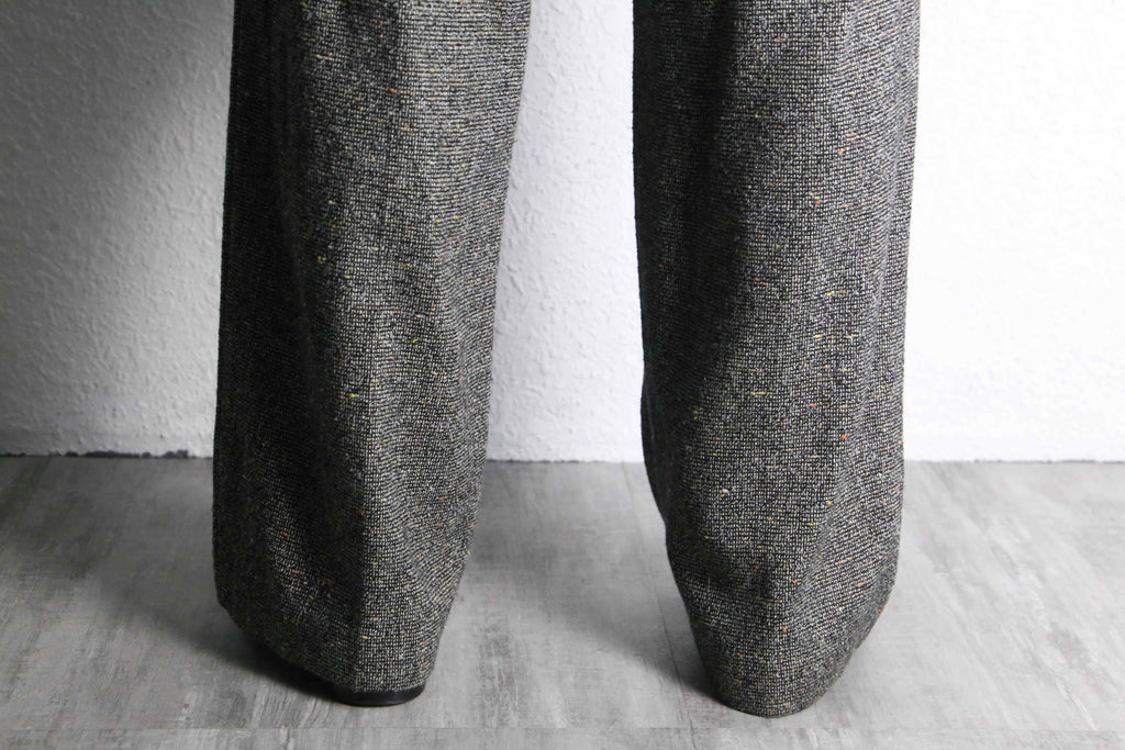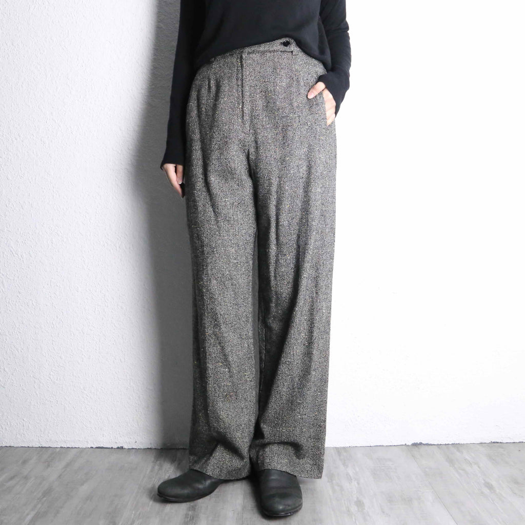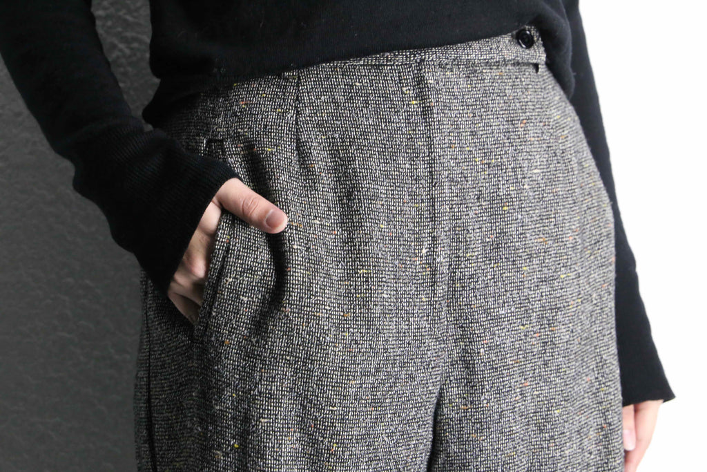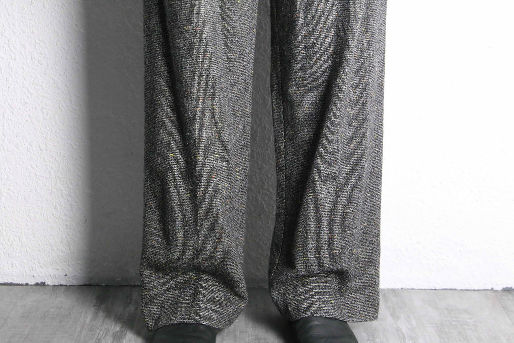 黒白ベースに所々顔を出すオレンジや黄色のネップが特徴の1本。この手のスラックスは厚手のウールがほとんどですが、こちらはアクリルやナイロンを多く使用した比較的薄手で柔らかく、深めの股上ゆえのドレープ感を楽しめる珍しいタイプとなります。なめらかなドレープと足元の溜まり具合、ネップデザインが相まって、なんとも小慣れた古着らしい表情が秀逸です。