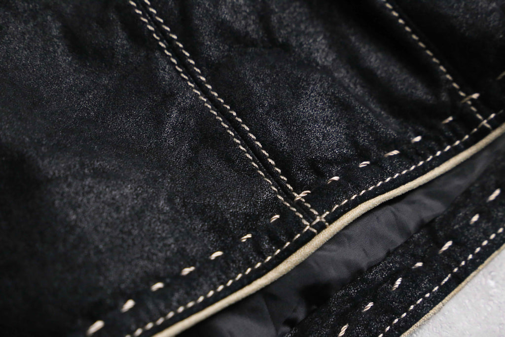 トラッカージャケットを連想させるステッチにレザーの中でも柔らかく着やすい一着。3ボタンとやや着丈は長くVゾーンは小さめな仕様。レザーが持つ重厚感に対して本切羽を採用することで抜け感ができ、着方もいろいろと楽しめます。