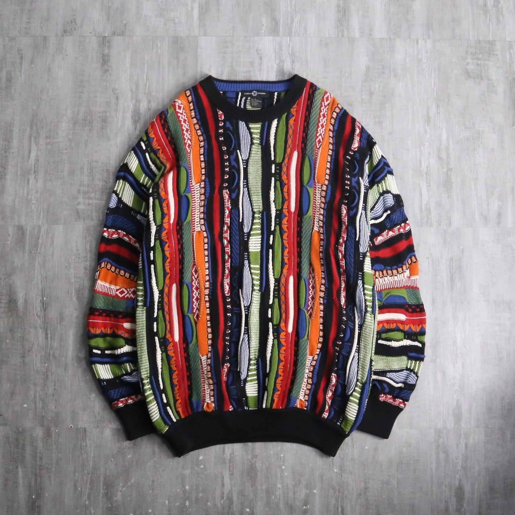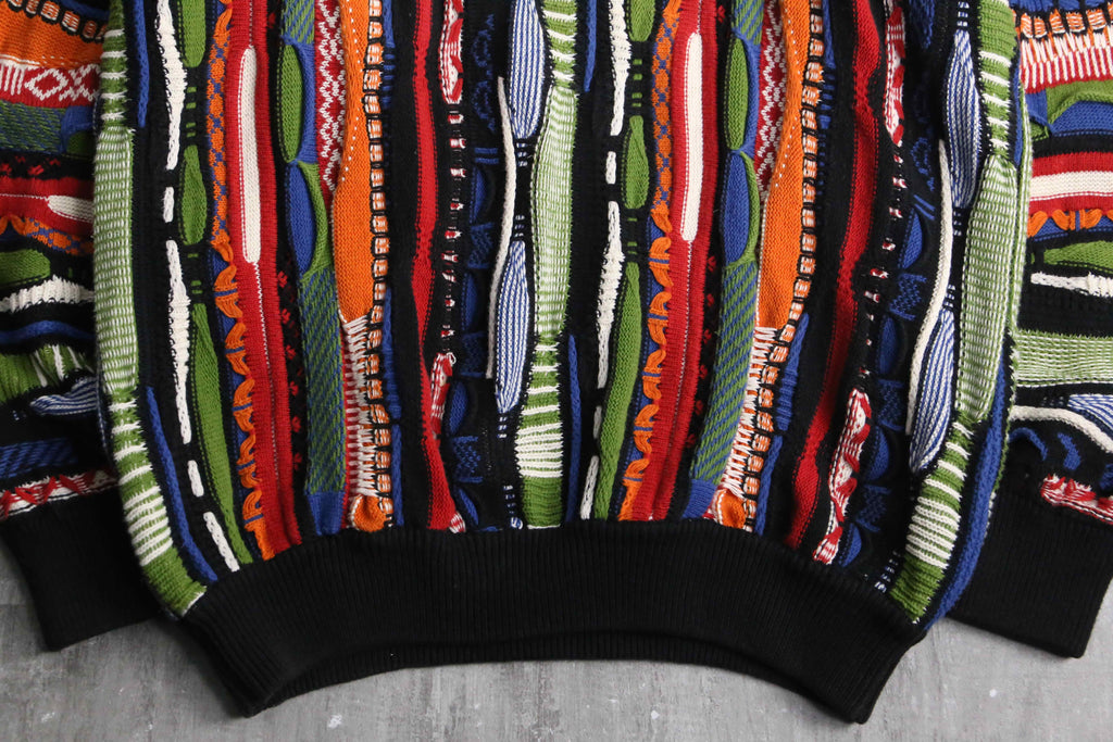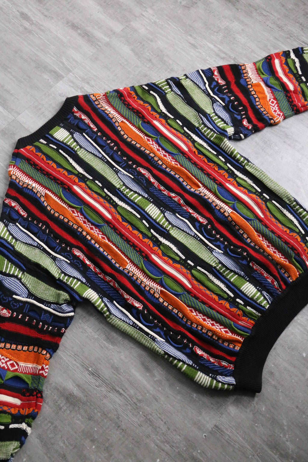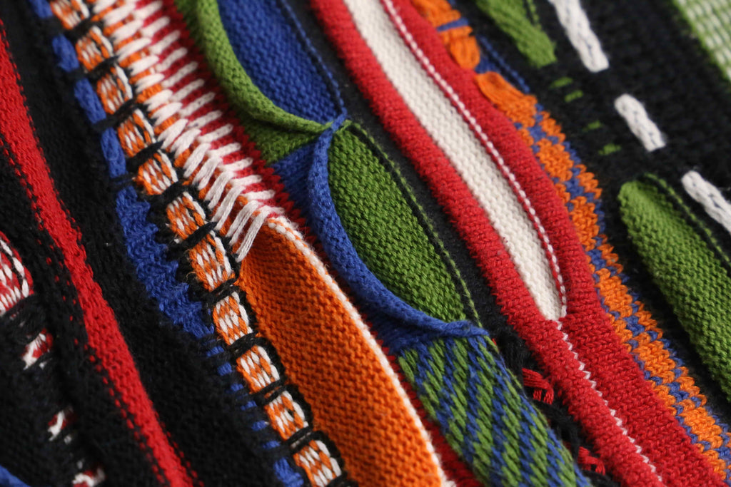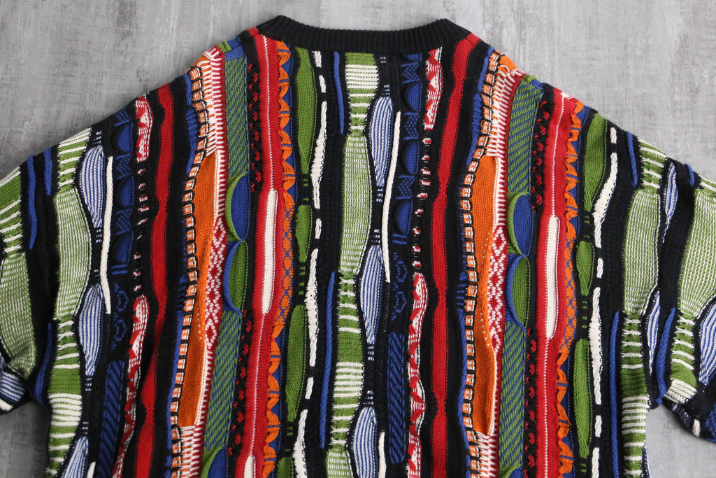 かなりルーズでゆったりと着ることのできる一着。赤や黄、青などさまざまなビビッドなカラーリングが華やかなデザイン。3Dニットらしく派手でありつつも、サイジングによりゆったりとやや落ち着いた面。暑すぎずさらっとした着心地は春にぴったりかと。
