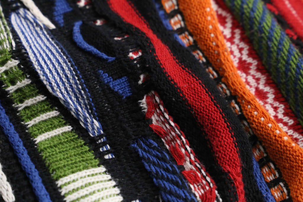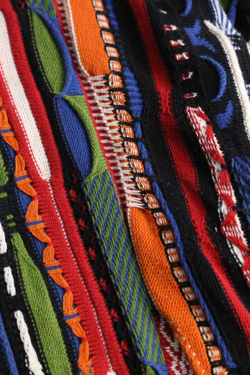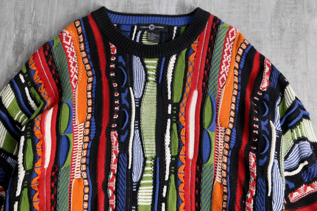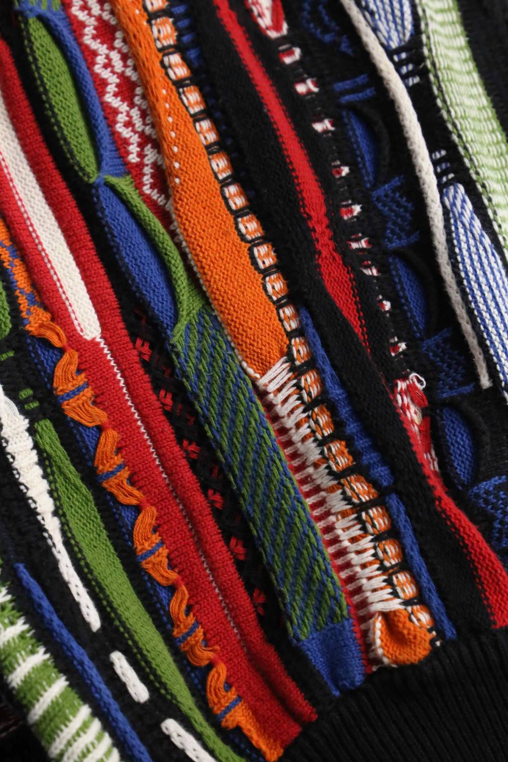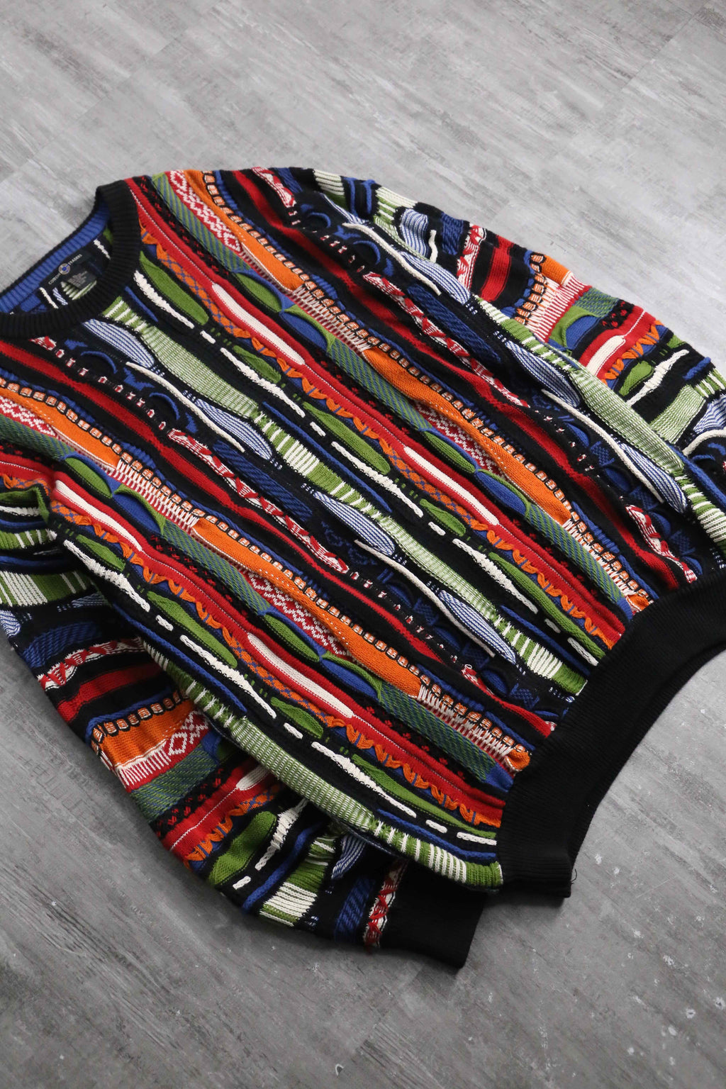 かなりルーズでゆったりと着ることのできる一着。赤や黄、青などさまざまなビビッドなカラーリングが華やかなデザイン。3Dニットらしく派手でありつつも、サイジングによりゆったりとやや落ち着いた面。暑すぎずさらっとした着心地は春にぴったりかと。