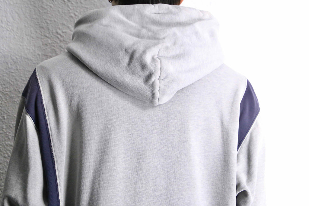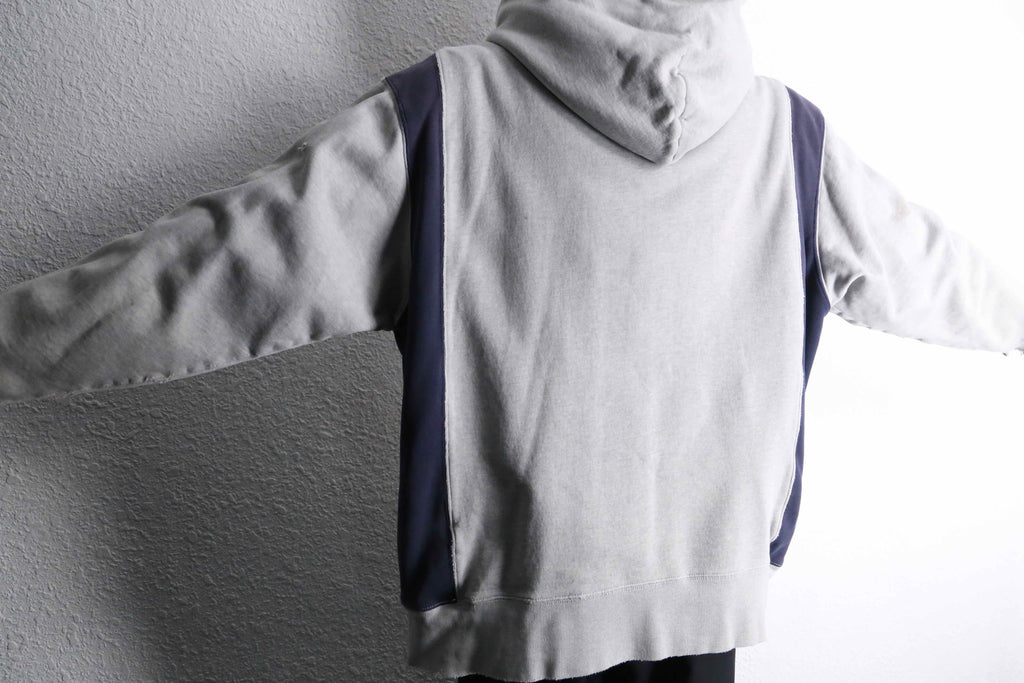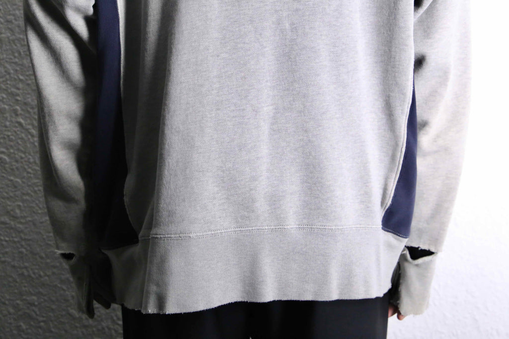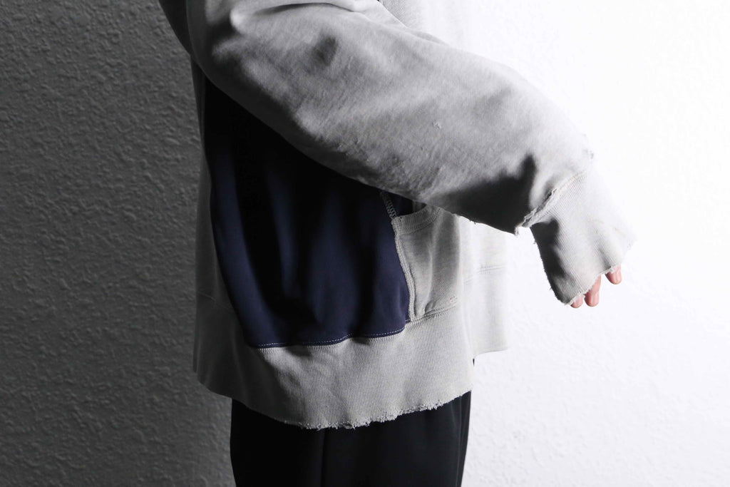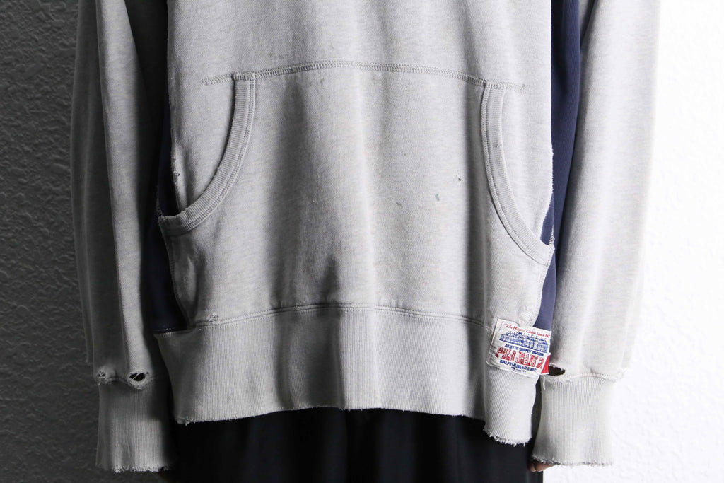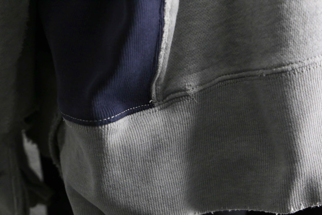 全体的に着込まれた風合いと、裾や袖口に見られるラフなダメージが相まって、退廃的な“襤褸”の空気感を纏った一着。やや柔らかく馴染んだスウェット生地に、ゆったりとしたルーズシルエット。フロントのカレッジライクなロゴデザインが程よい主張を加えつつ、リアルなエイジングが一点物の存在感を引き立てています。