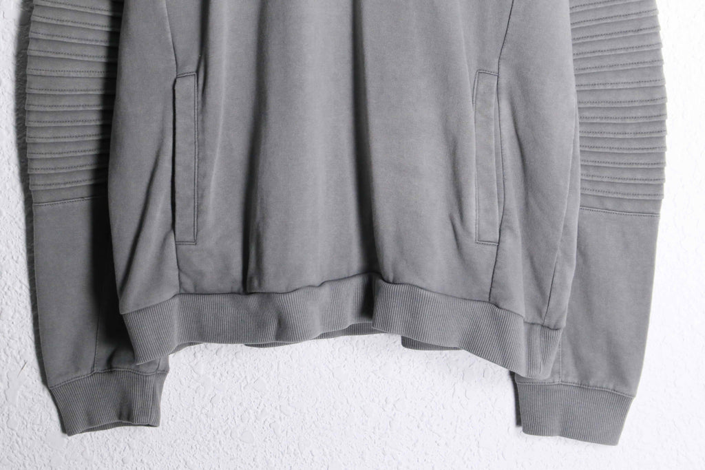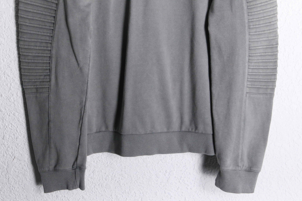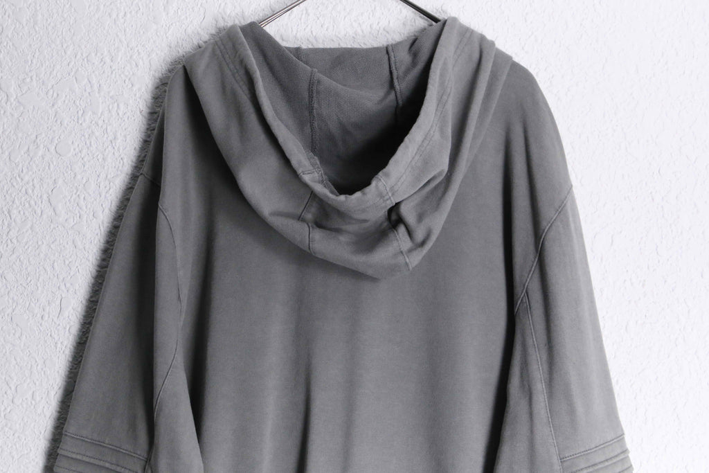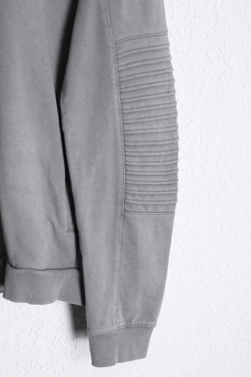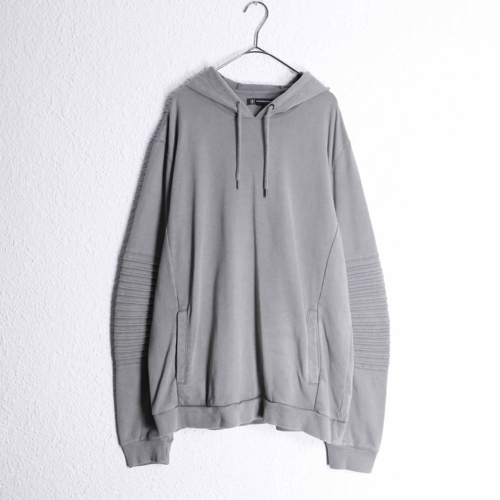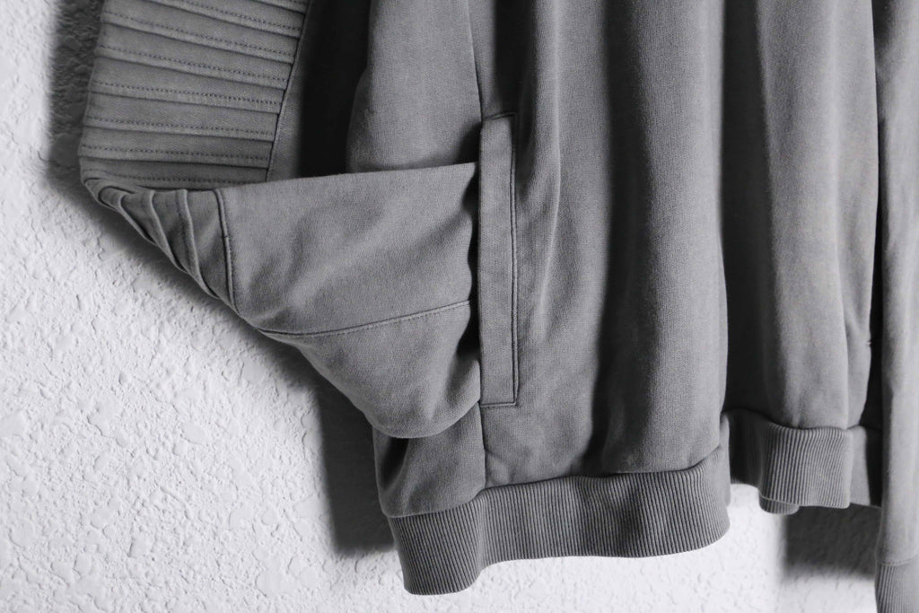 コットン60%・ポリエステル40%の混紡生地を使用。柔らかな着心地と扱いやすさを兼ね備えたバランスの良い仕上がり。程よく肉感のある生地で、デイリーに着回しやすい一着です。袖部分にはリブ状のバイカーデザインを彷彿とさせる切り替えデザインが施されており、シンプルなフーディーの中に立体的なアクセントをプラス。過度な主張はないものの、スタイリングに程よい表情を与えてくれます。