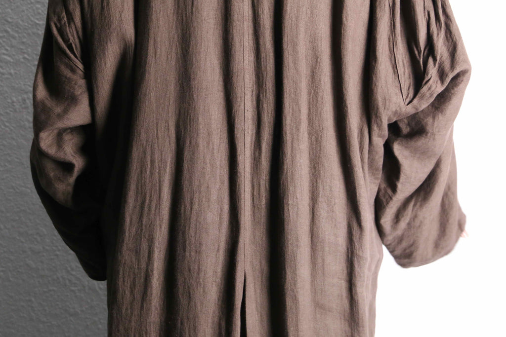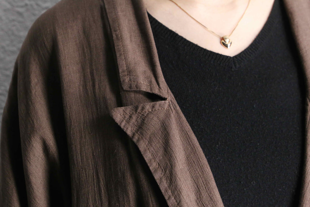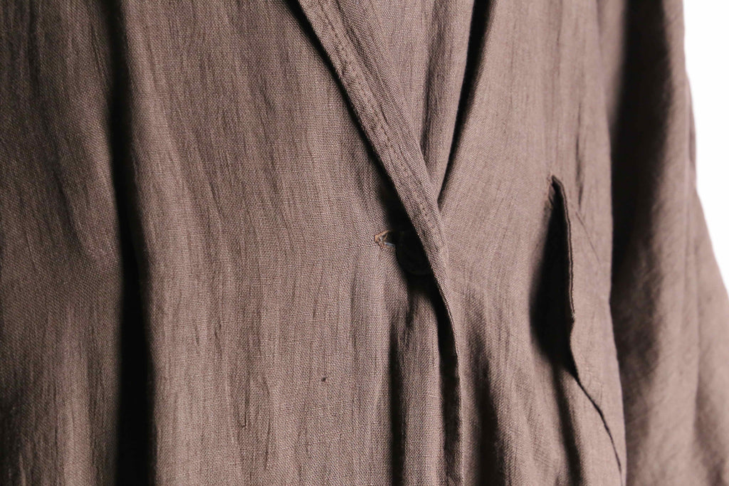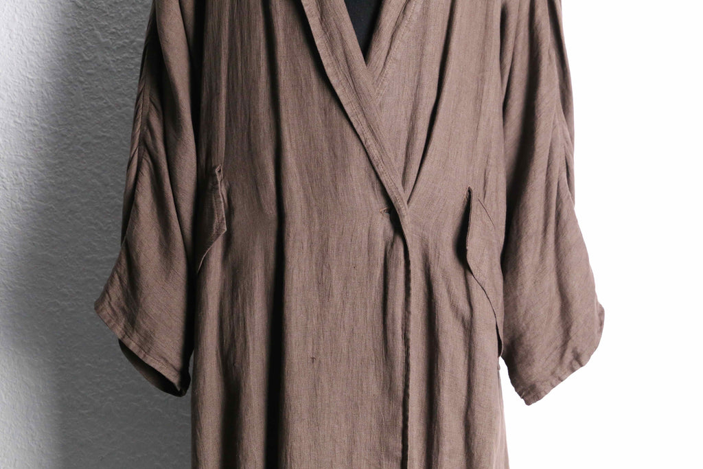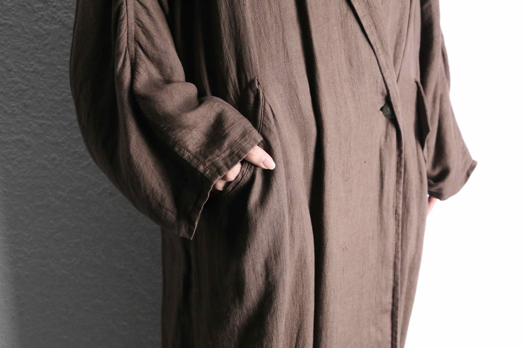 ナチュラルな風合いを持つリネン生地を使用しており、柔らかな落ち感と軽やかな着心地が魅力の一着。ロング丈ならではのゆったりとしたシルエットが、羽織るだけで空気を纏うようなリラックス感のあるスタイルを演出。アーム部分には、恐らく経年変化によって生まれた細かなギャザーが見られ、生地の表情に奥行きをプラス。長い時間を経て自然に形成されたディテールが、この個体ならではの味わいとして存在感を放っています。