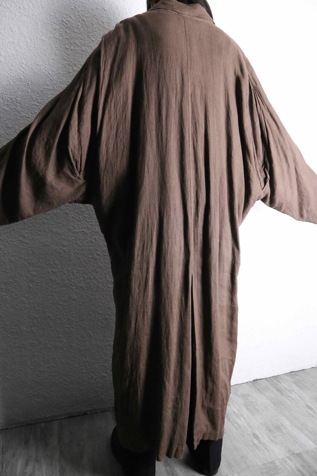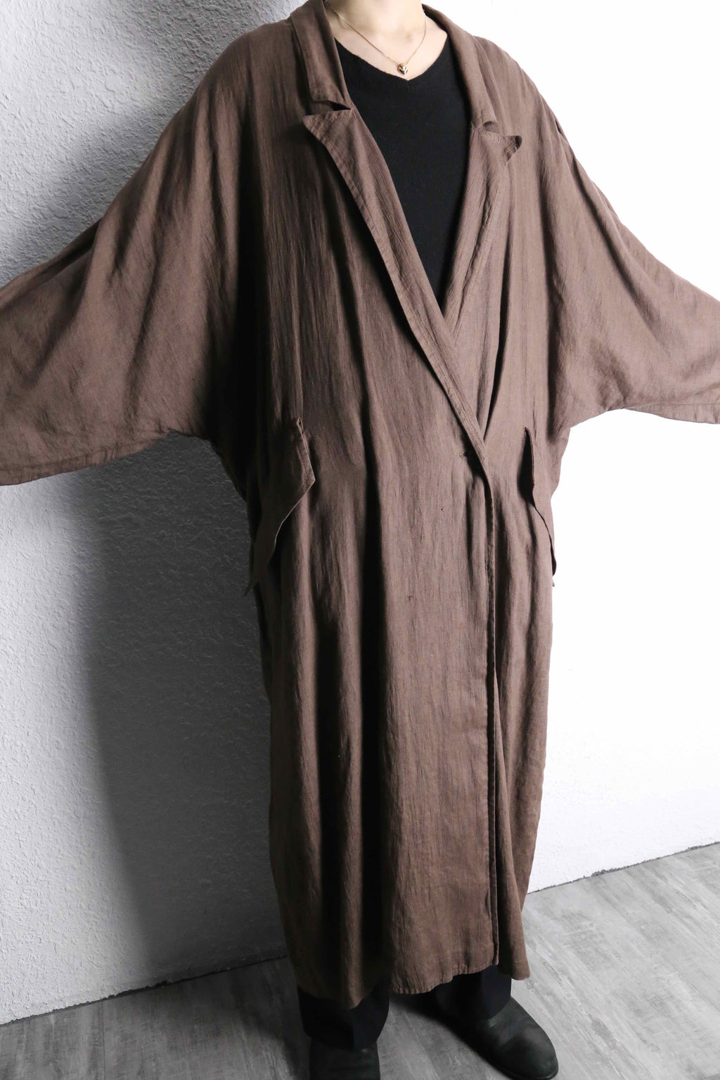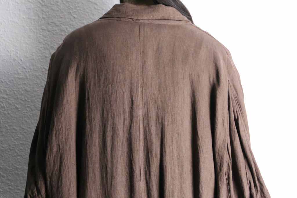 ナチュラルな風合いを持つリネン生地を使用しており、柔らかな落ち感と軽やかな着心地が魅力の一着。ロング丈ならではのゆったりとしたシルエットが、羽織るだけで空気を纏うようなリラックス感のあるスタイルを演出。アーム部分には、恐らく経年変化によって生まれた細かなギャザーが見られ、生地の表情に奥行きをプラス。長い時間を経て自然に形成されたディテールが、この個体ならではの味わいとして存在感を放っています。
