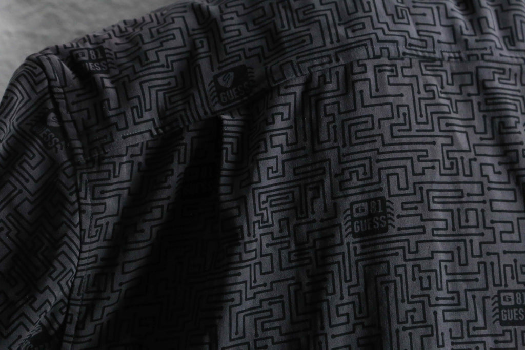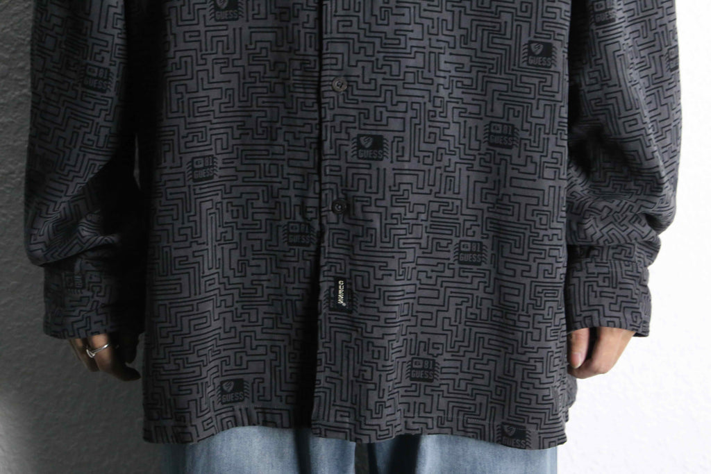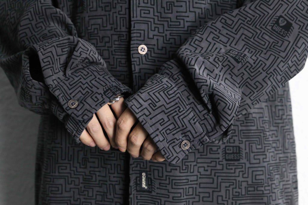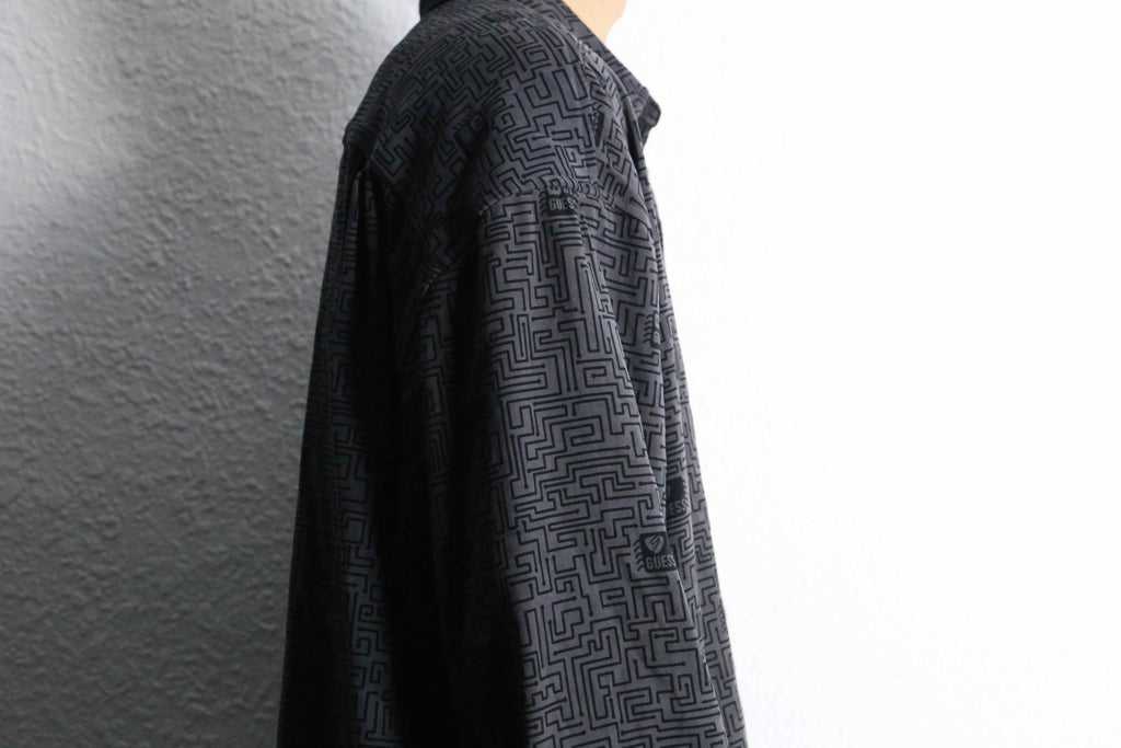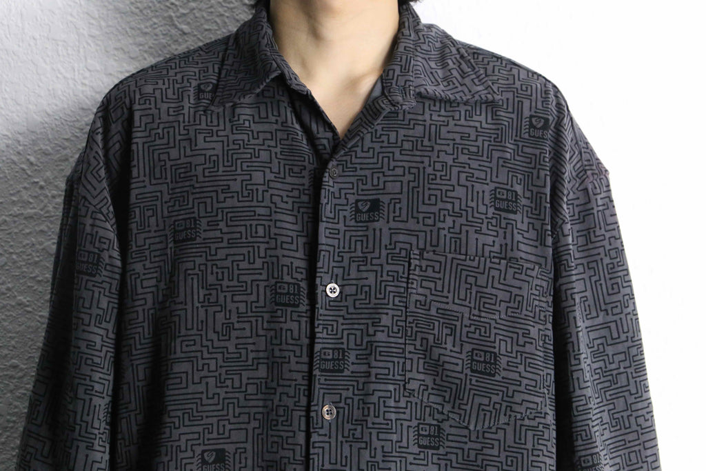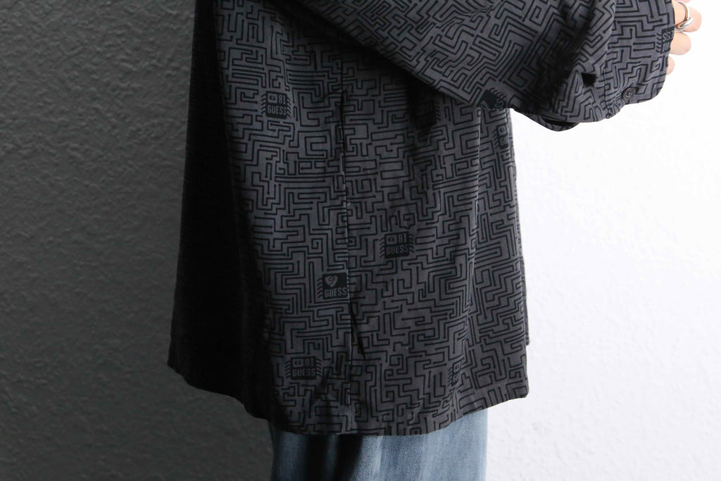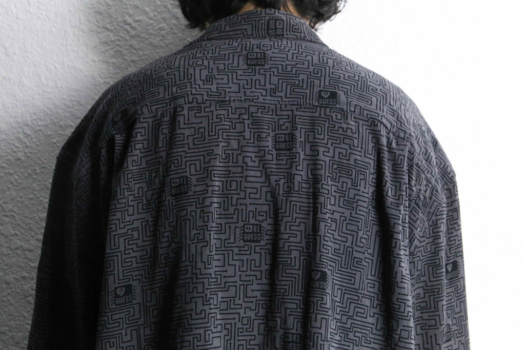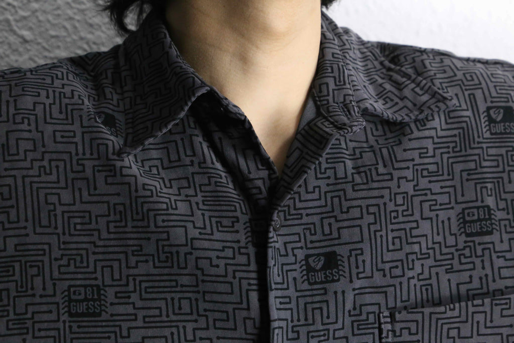 全体に散りばめられたGUESSロゴもさりげなく効いていて、総柄でもうるさくならないバランス感が秀逸。ポリエステルベースの軽やかな生地感に、ゆったりとしたXLサイズのシルエット。落ち感があるから、羽織るだけで自然と“抜け”が出る一着。