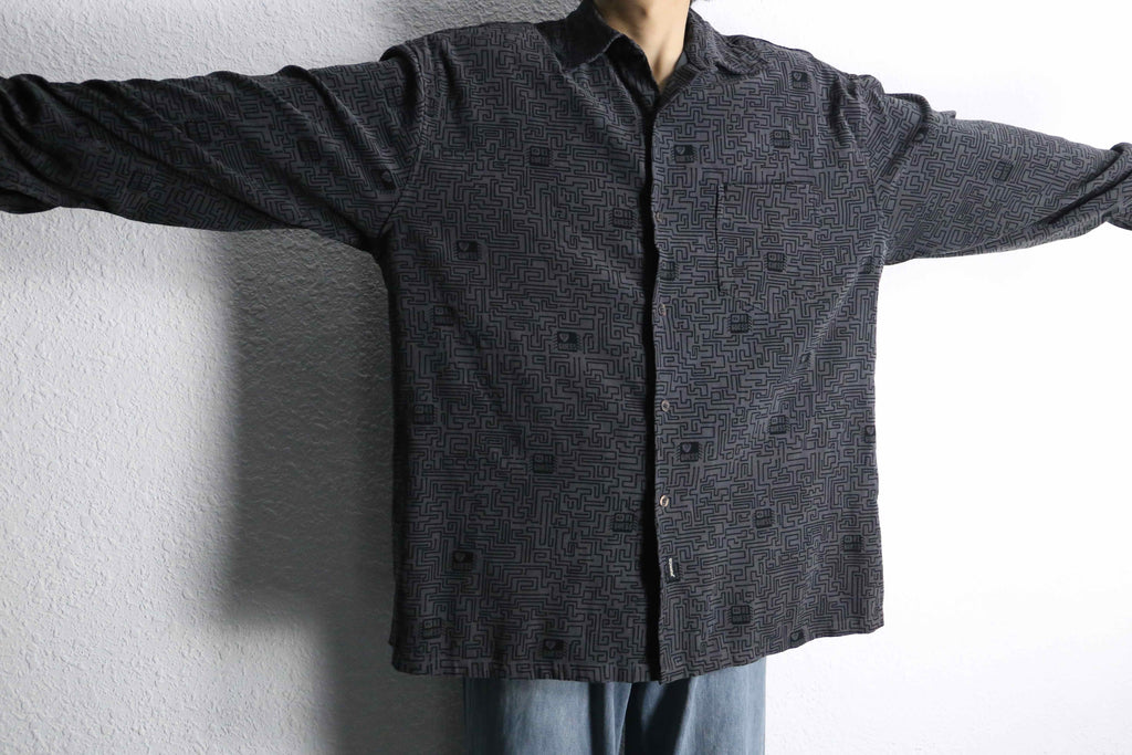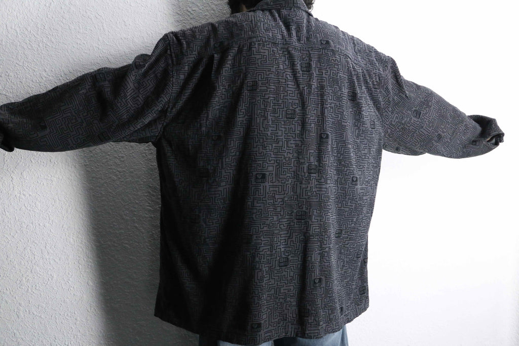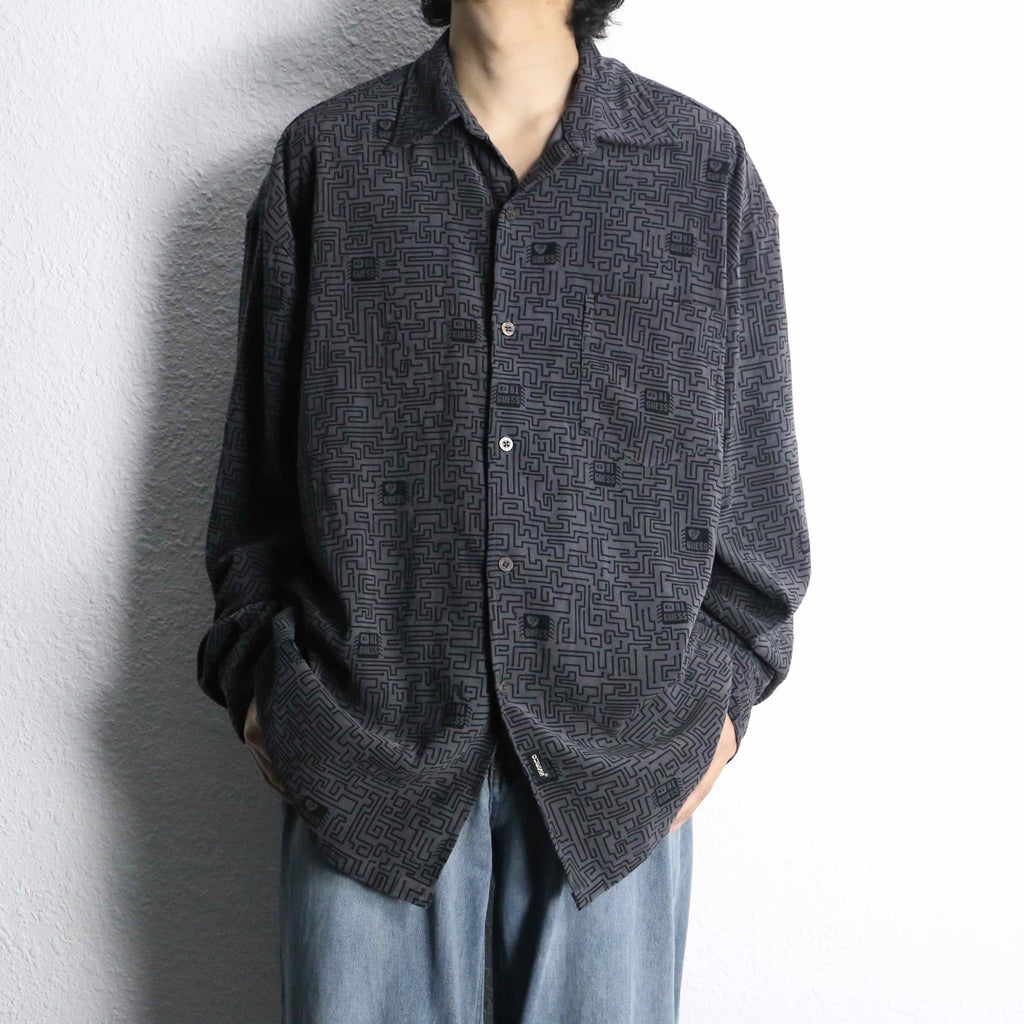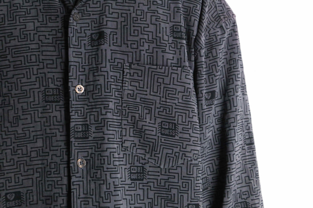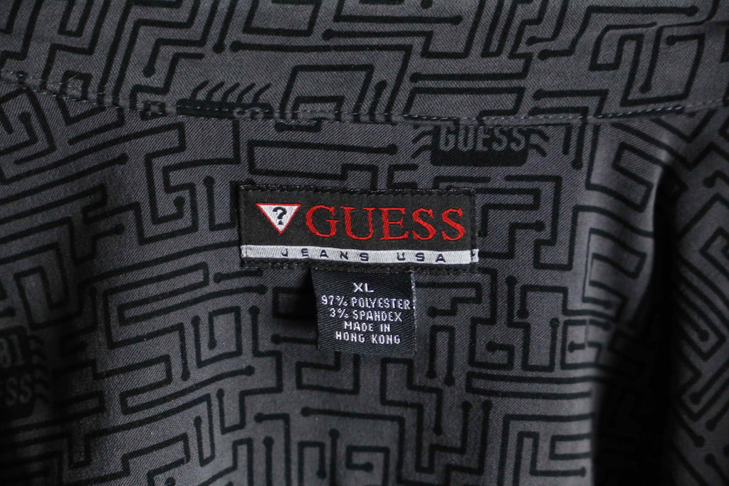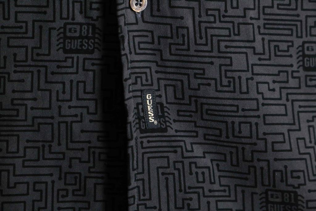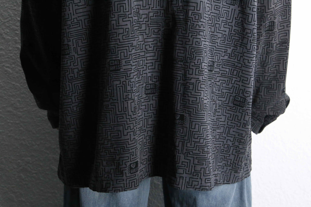 全体に散りばめられたGUESSロゴもさりげなく効いていて、総柄でもうるさくならないバランス感が秀逸。ポリエステルベースの軽やかな生地感に、ゆったりとしたXLサイズのシルエット。落ち感があるから、羽織るだけで自然と“抜け”が出る一着。