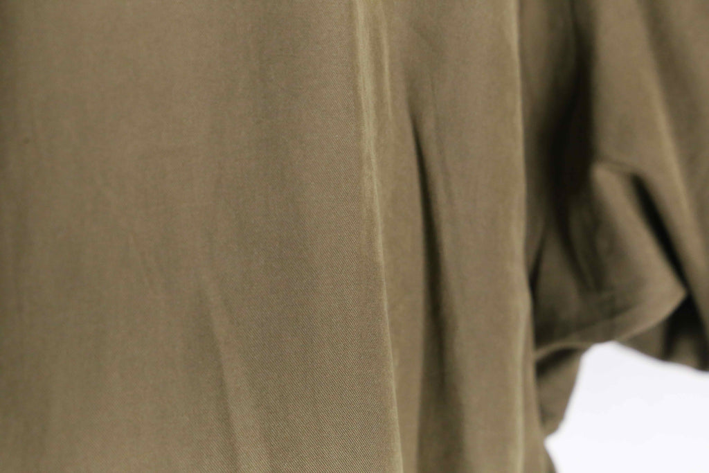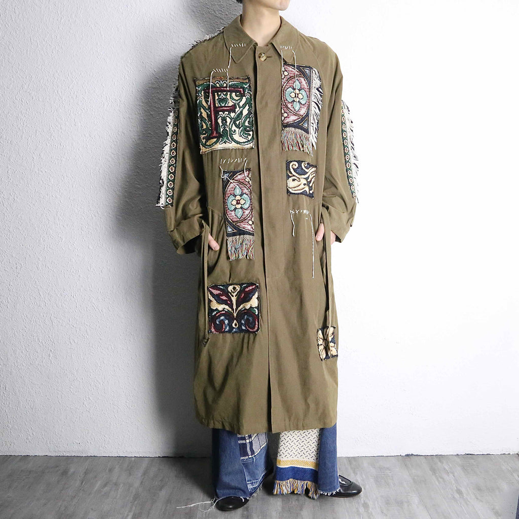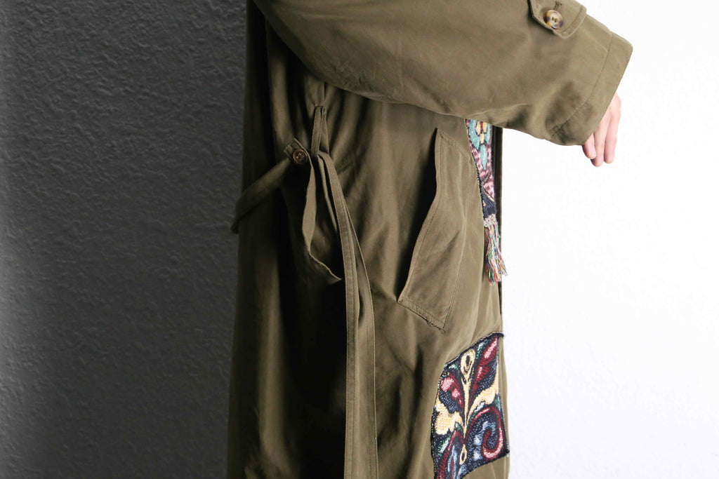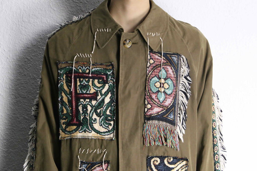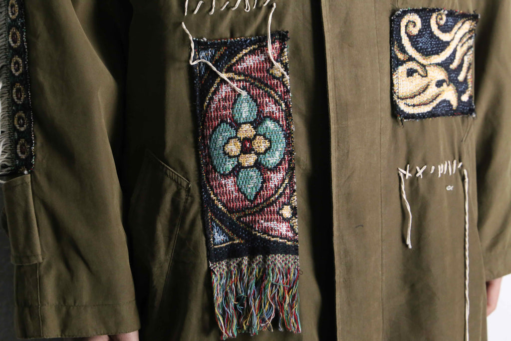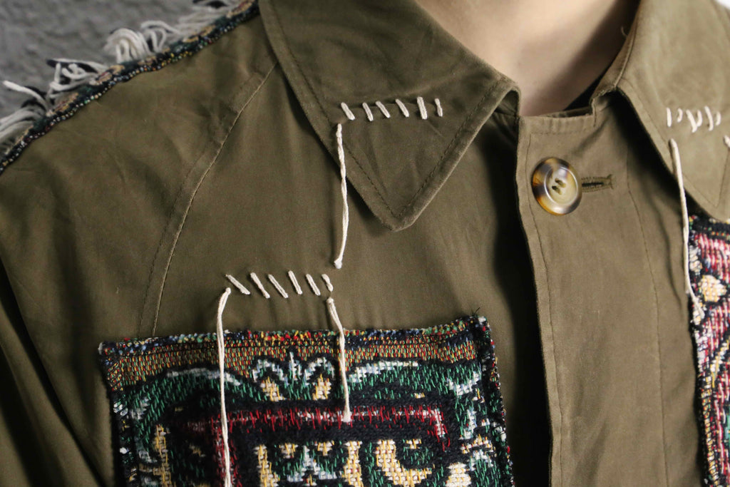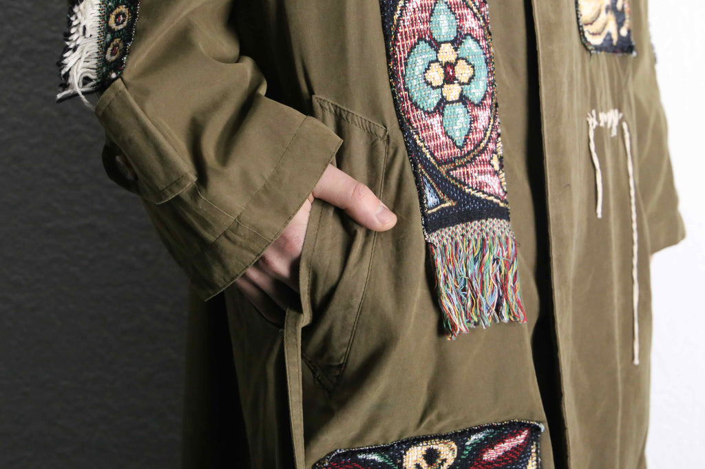 フロントや、裾に配置されたラグは、柄や色味がそれぞれ異なり、リメイクならではの雰囲気を楽しめます。落ち着いたカーキカラーをベースにしているため、個性的ながらもコーディネートに取り入れやすいのがポイント。