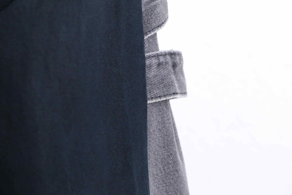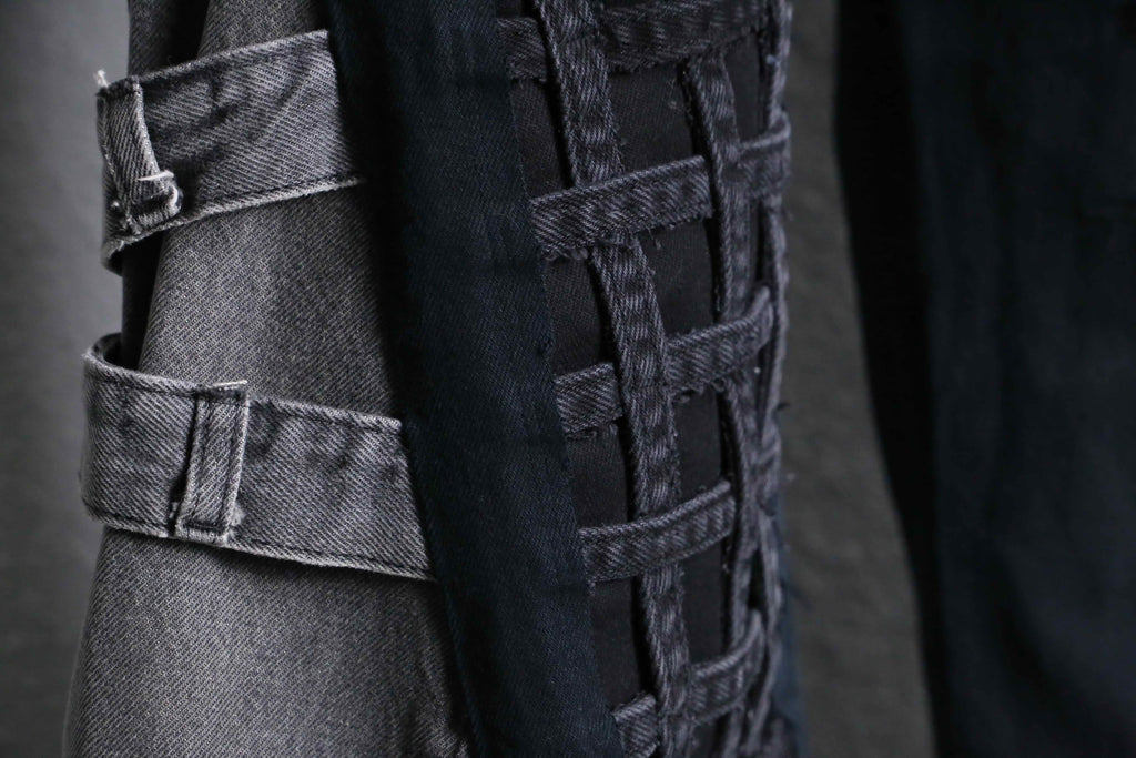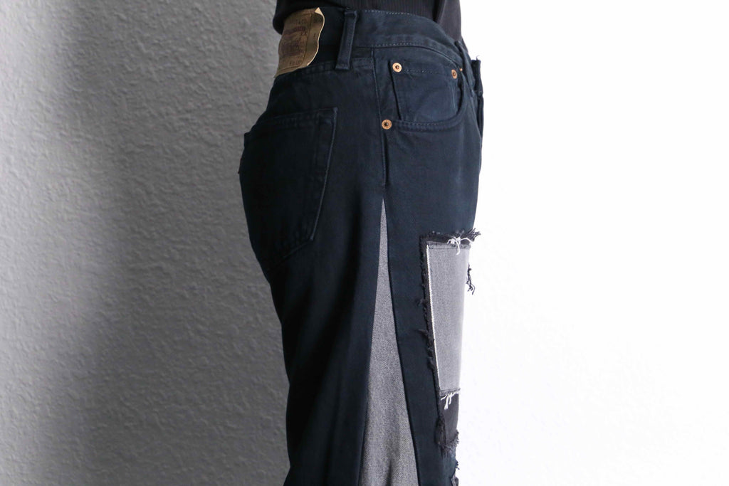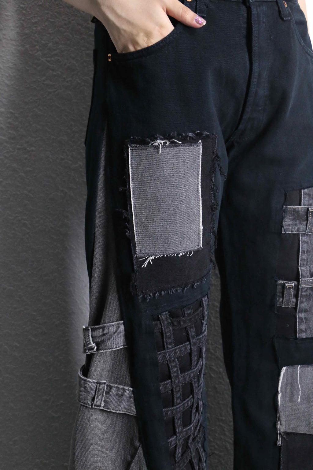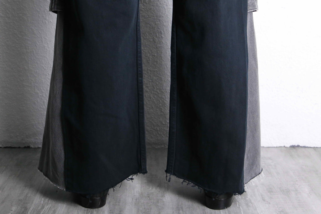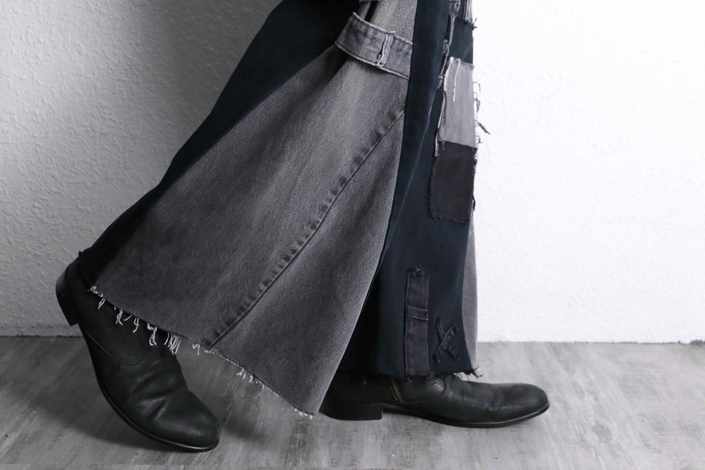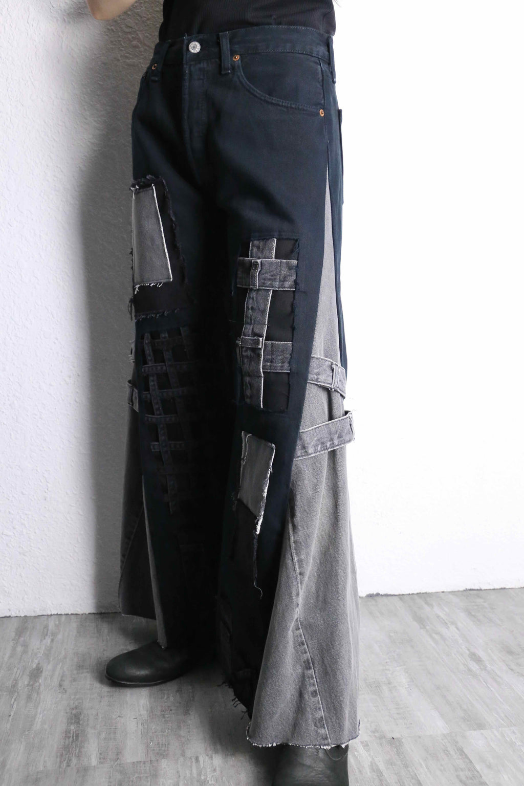 フロント部分のパッチワークを多めに設計した存在感抜群のデザインによる1本。ブラックボディのサイドからウォッシュグレーのデニムを差し込むことで、もも周りの広さをそのままに裾に向かって幅広となっていくボリューム満点で汎用性抜群カラーのバギーフレアのシルエットが顕現します。