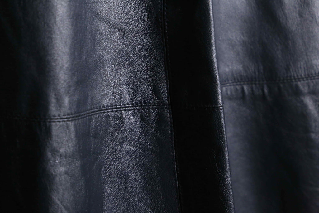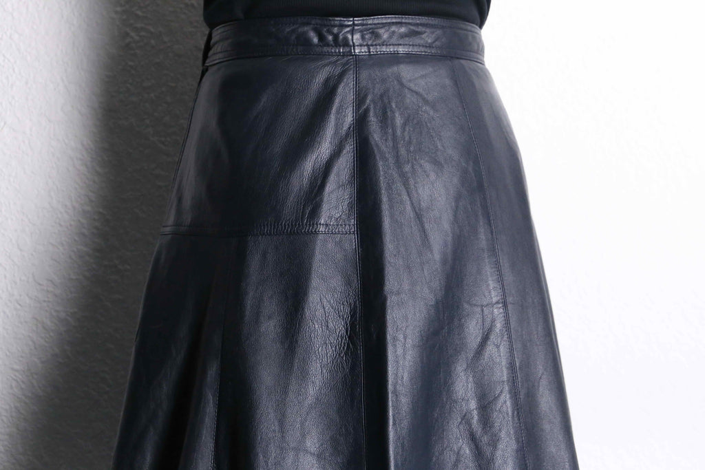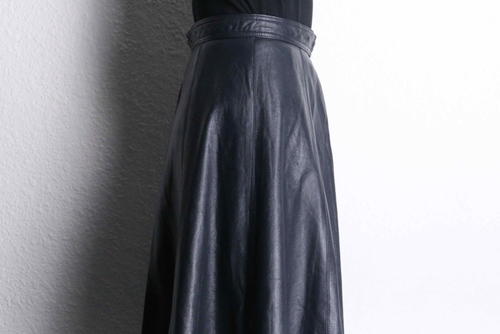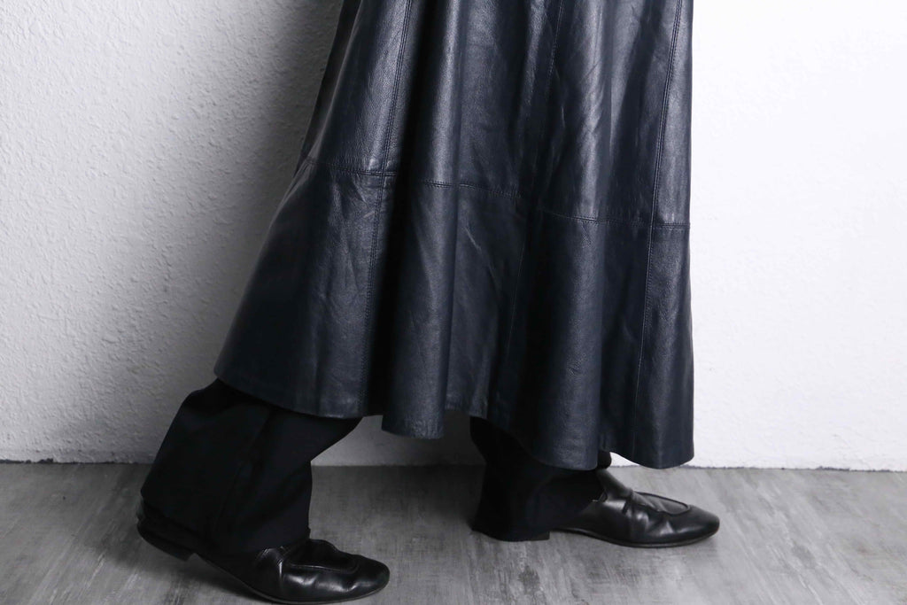 しなやかな革の質感と落ち着いた艶が、コーディネートに高級感をプラスします。裾にかけて広がるシルエットは、動きに合わせて美しく揺れ、存在感を放ちます。