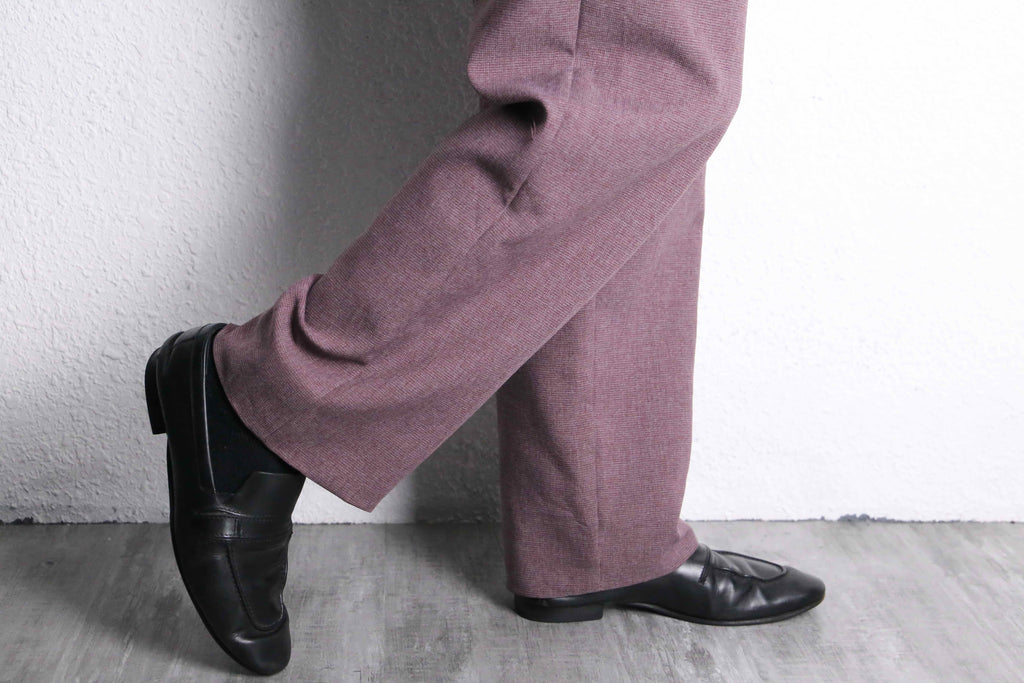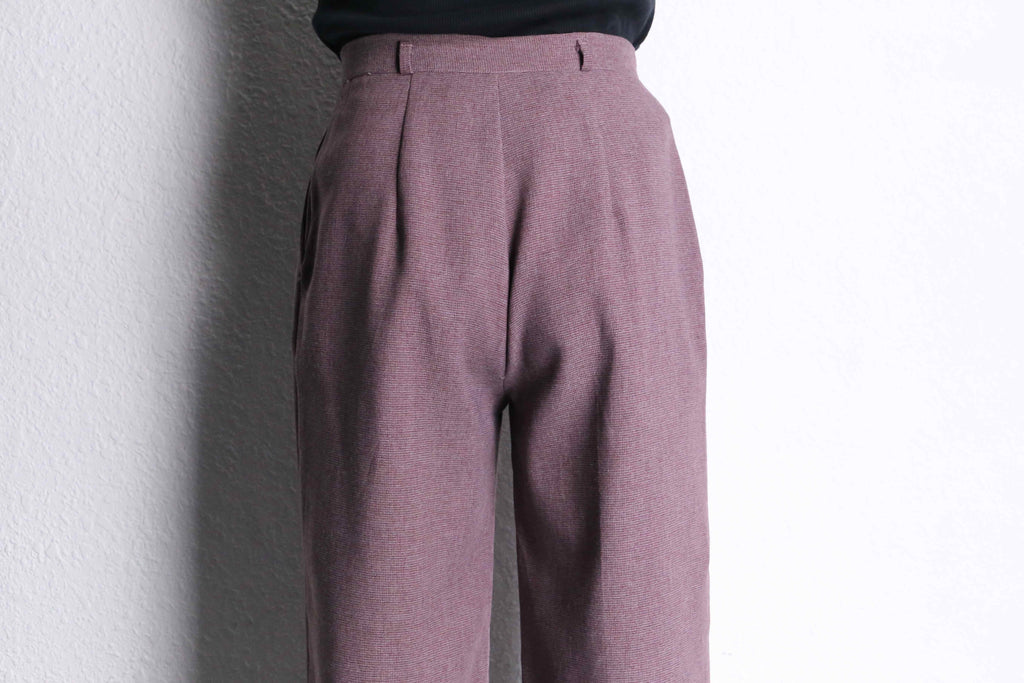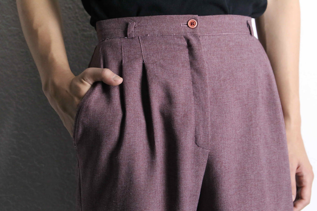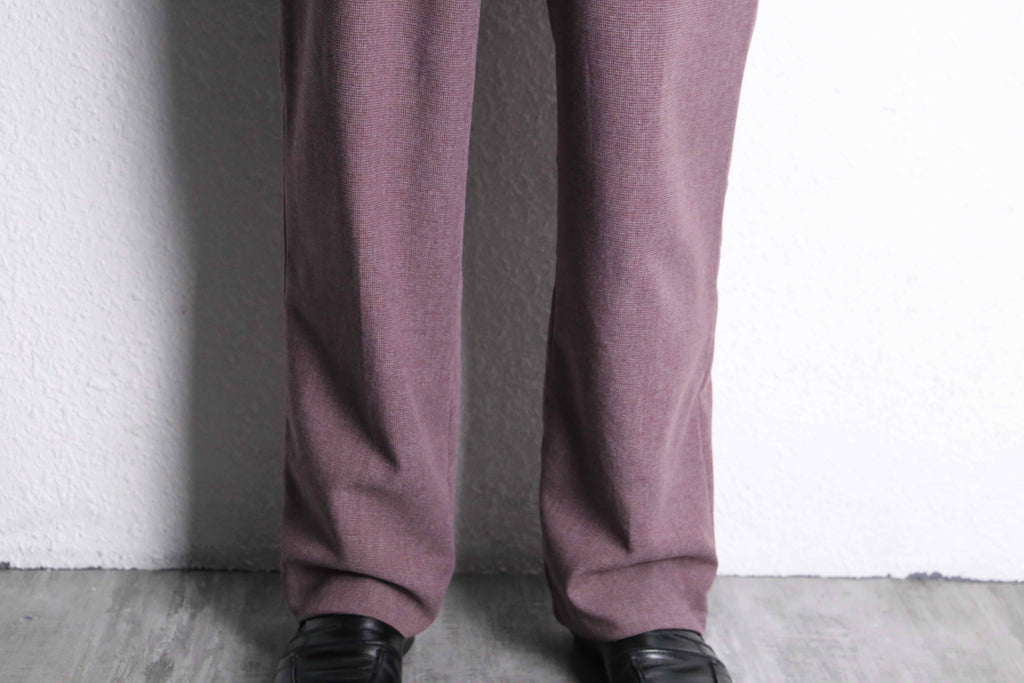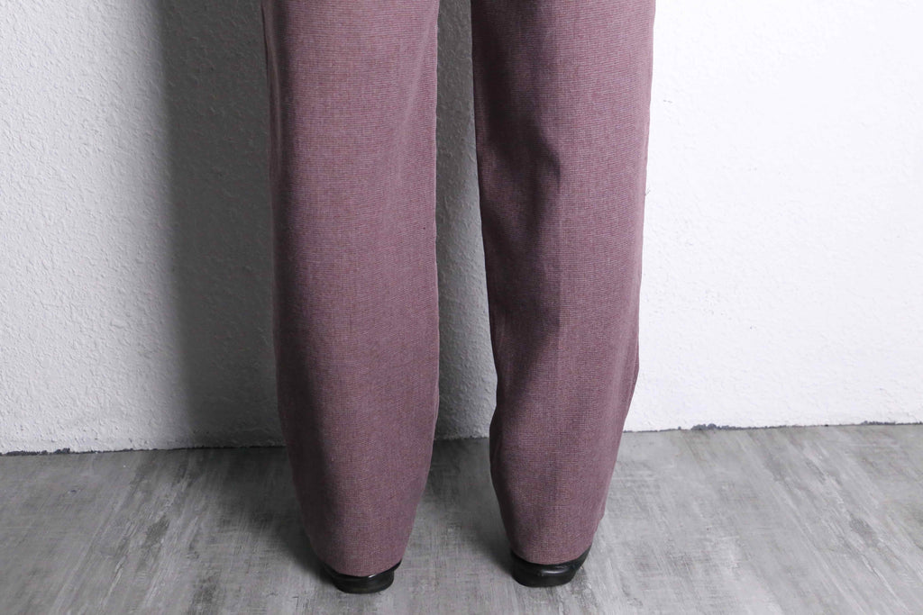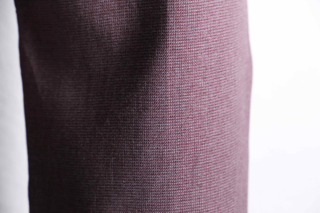深みのあるパープル寄りのカラーが上品な印象を与えるワイドスラックス。