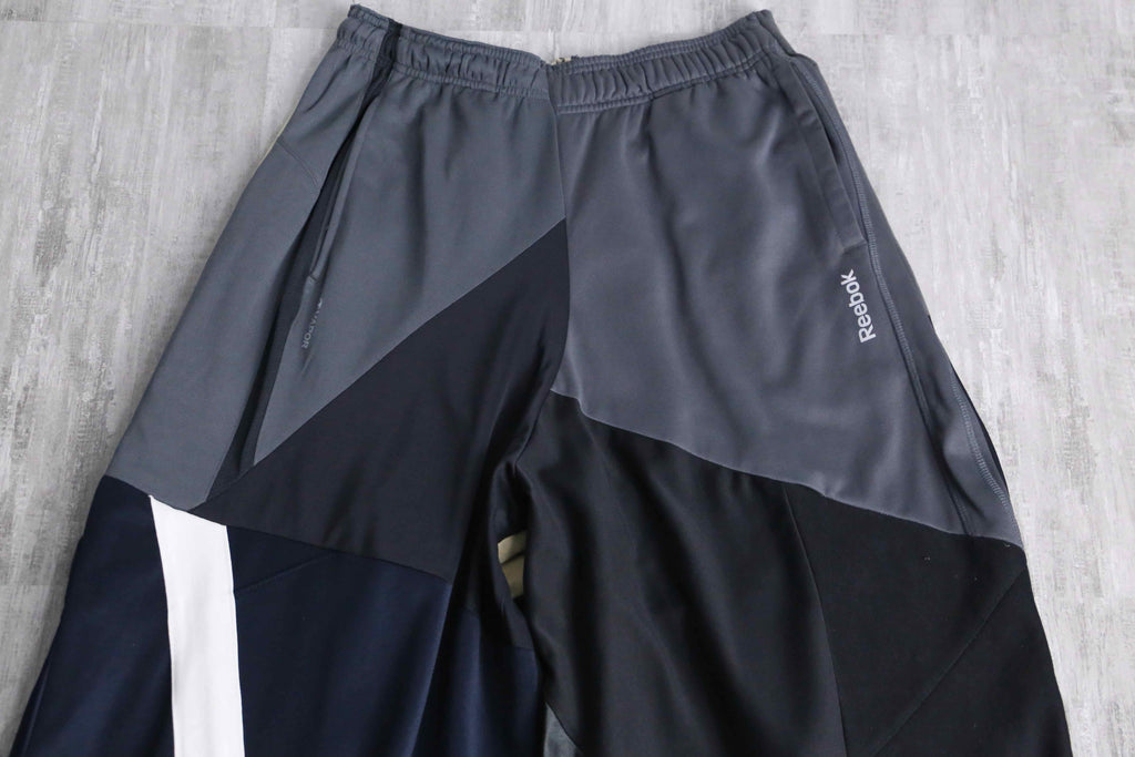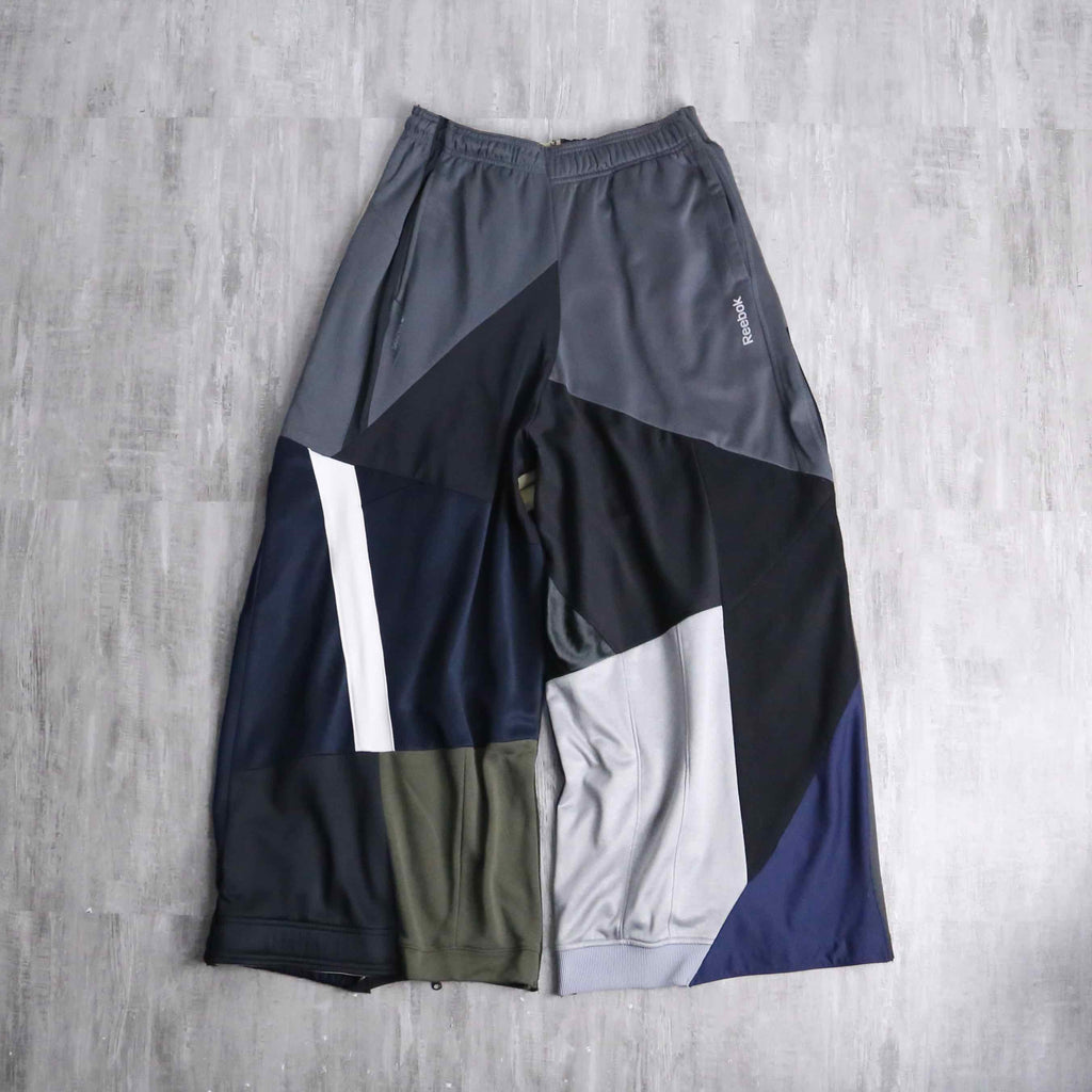 深めの股上と裾にかけて大きく広がる袴シルエットが特徴で、歩くたびに豊かなドレープを描きます。スポーツウェア特有の軽やかさと、リメイクならではの迫力を兼ね備えた一本。