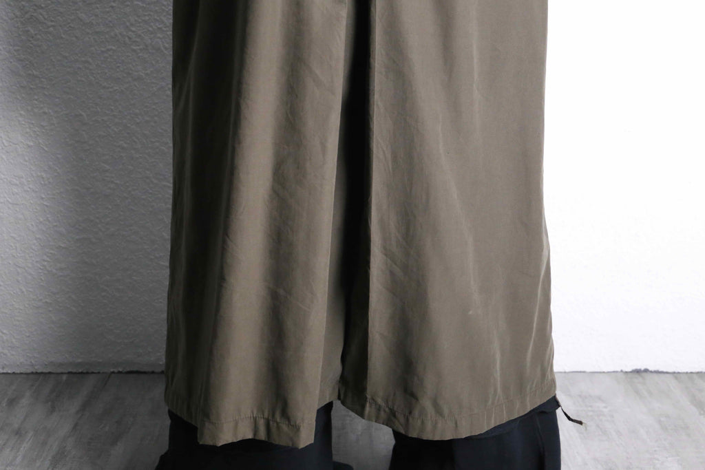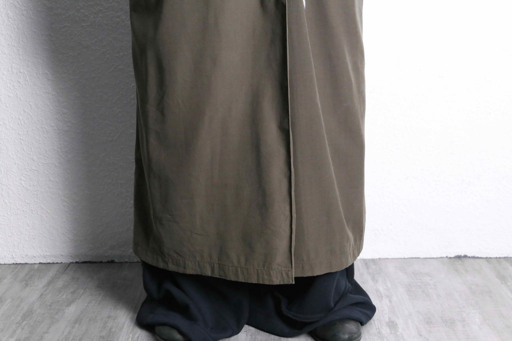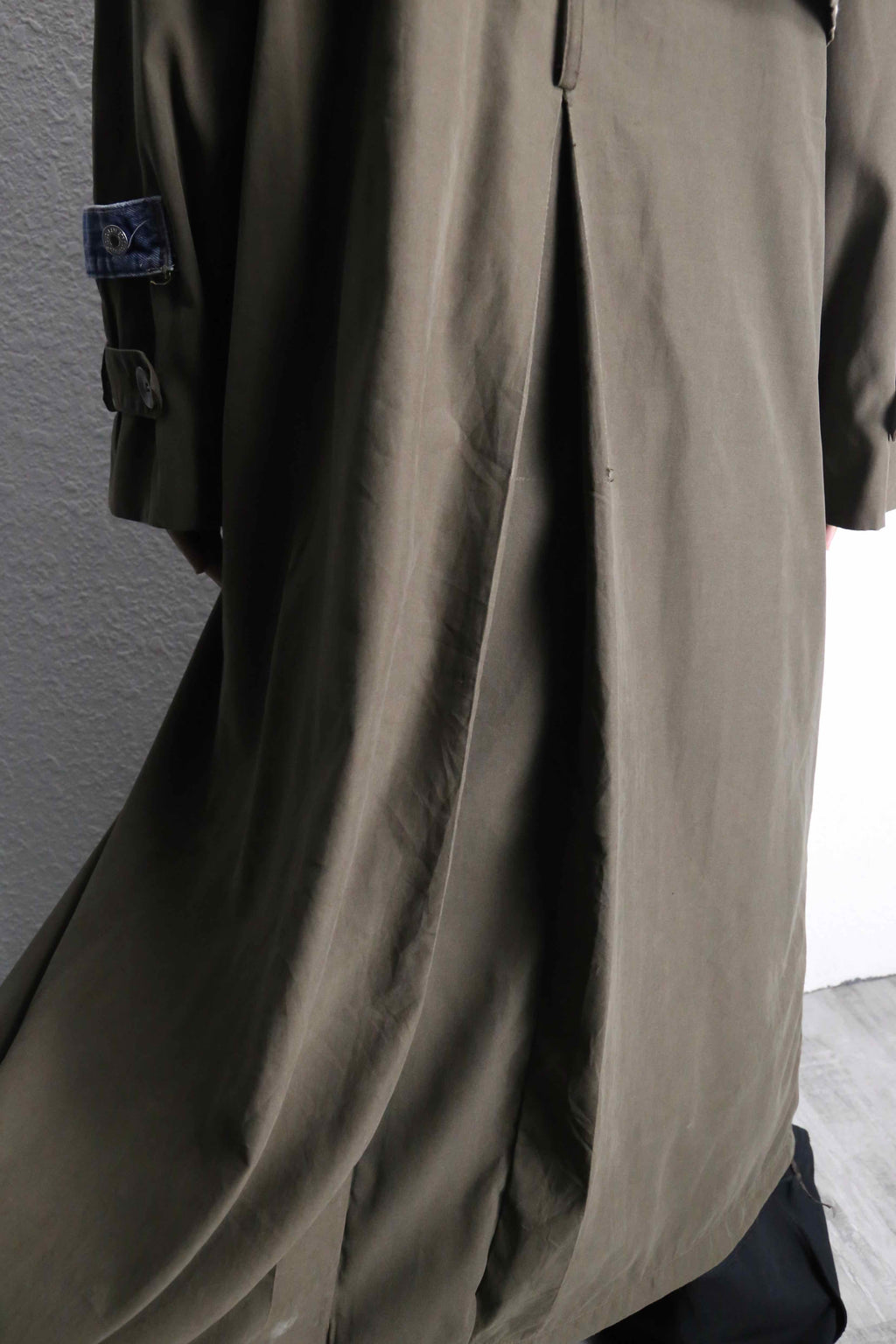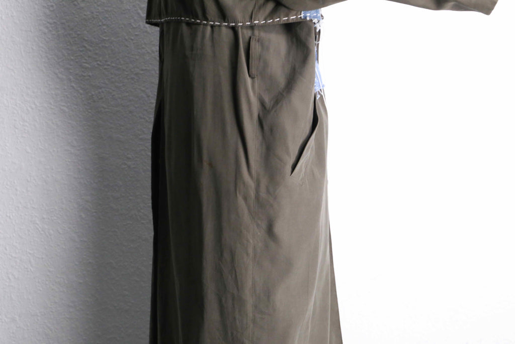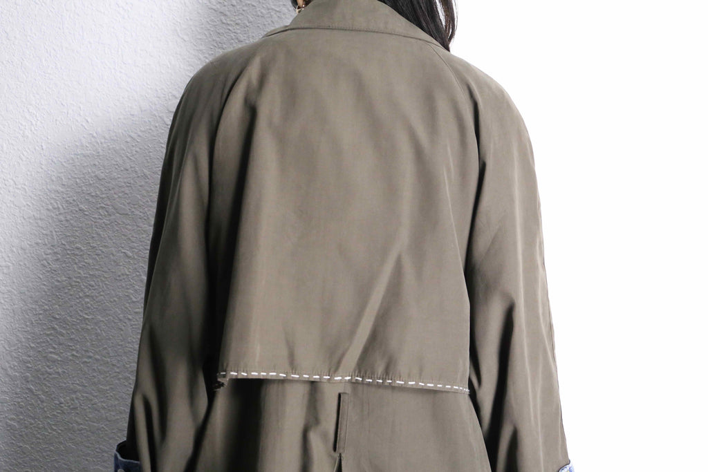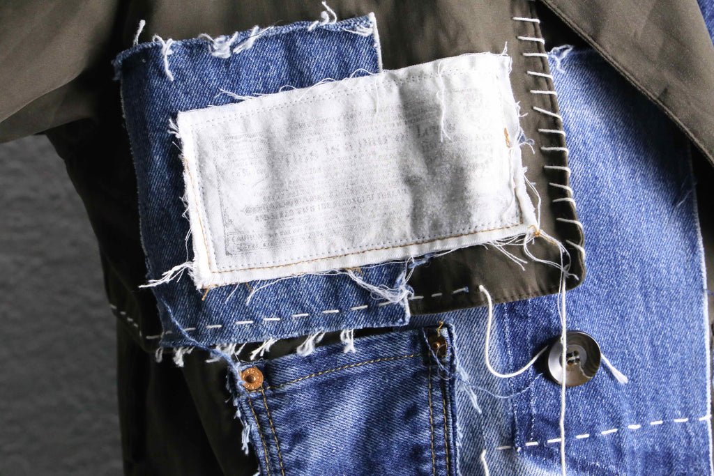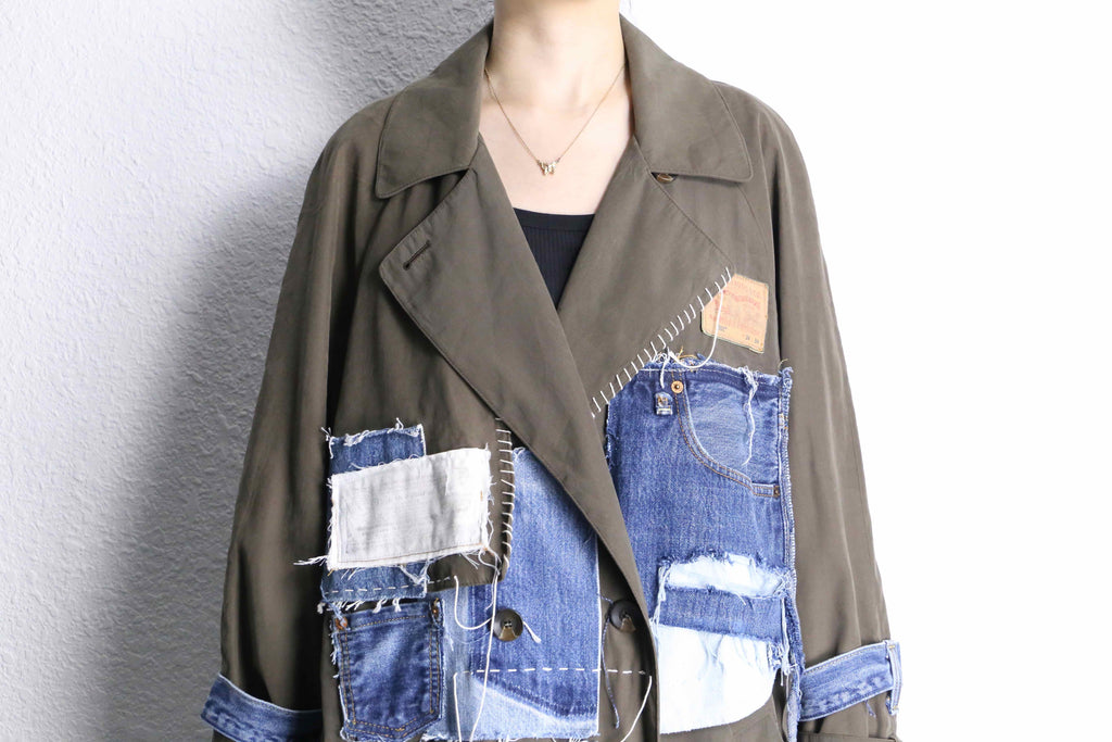 カーキのロングコートにデニムの生地を大胆に縫い合わせた、存在感のあるリメイクコート。フロント部分にはポケットや切りっぱなしのデニムパッチを組み合わせていて、ひとつひとつ違った表情を演出。ラフに仕上げた糸のほつれや、あえて残した縫い目もデザインの一部になっていて、独特な雰囲気を楽しめるのが魅力の一着。