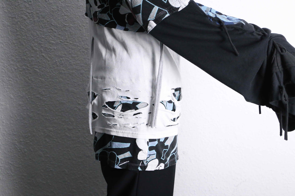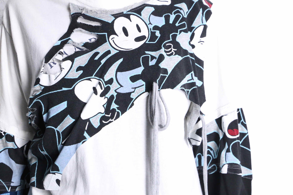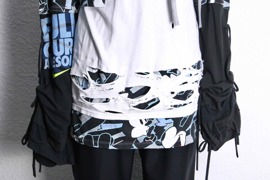 複数のプリントTシャツを解体し、独自の感覚で再構築したリメイクロングスリーブTシャツ。