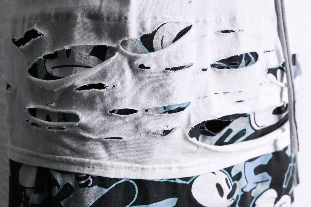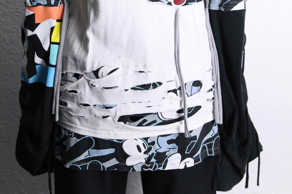 キャラクターグラフィックを大胆に切り替えたデザインは、フロントや裾に施されたクラッシュディテールと相まって、一点物らしい存在感を漂わせます。長めに取られた着丈とルーズなシルエット、さらに袖を強調したバランスによって、ストリートの空気感とモードな雰囲気を同時に表現。スタイリングとしては、ワイドパンツや落ち感のあるスラックスと組み合わせることで、ゆるさの中に洗練された印象を作り出せます。さらに、インナーにタートルネックやハイネックをレイヤードすれば、季節感を取り入れながら奥行きのある着こなしに。