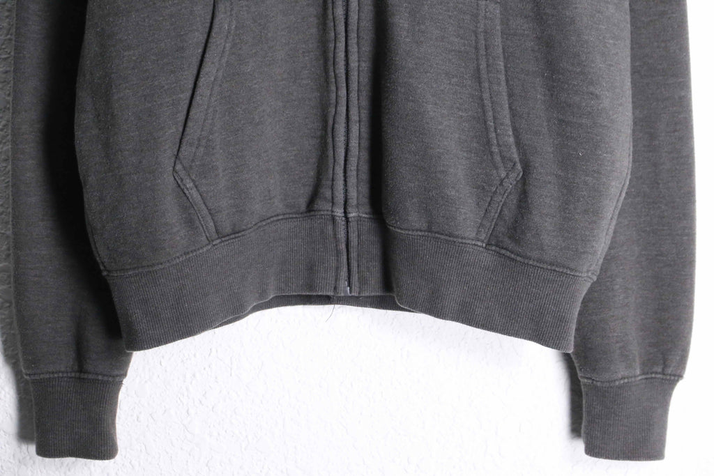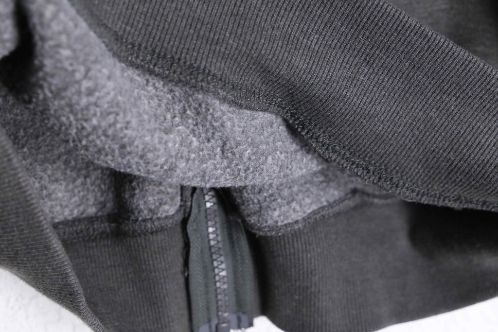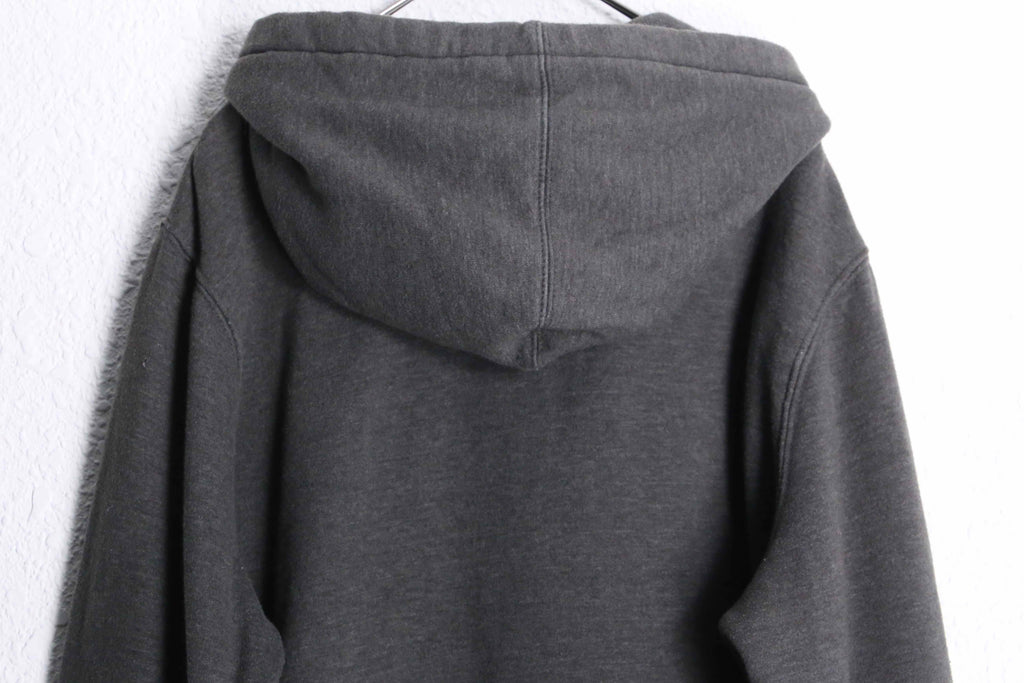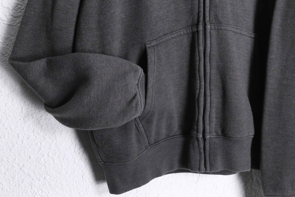 全体は柔らかなスウェット地で仕立てられ、ゆったりとした身幅と落ち感のある肩のラインがリラックスした雰囲気を演出。さらに特徴的なのは、フード部分にワッフル地を切り替えている点。異素材を組み合わせることで奥行きが生まれ、シンプルながらも遊び心のあるデザインに仕上がっています。ジップ仕様とカンガルーポケットによる実用性の高さも魅力で、軽い羽織りからライトアウター的な使い方まで幅広く対応。