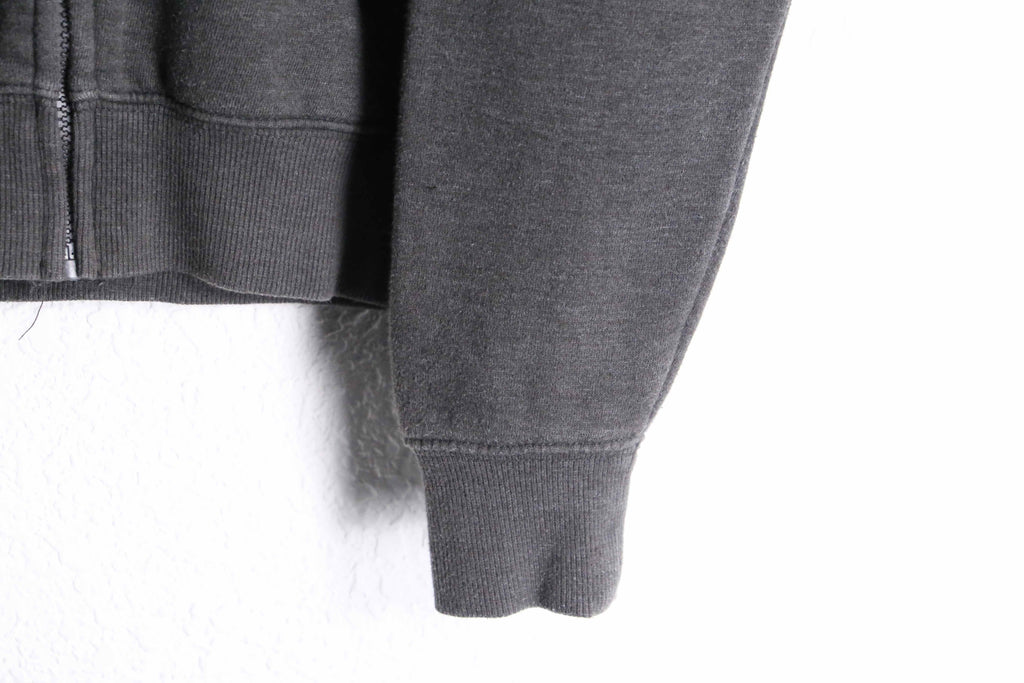 チャコールトーンをベースにしたジップアップパーカー。胸元の赤い刺繍がシンプルな表情にアクセントを添え、控えめながらも存在感を放ちます。