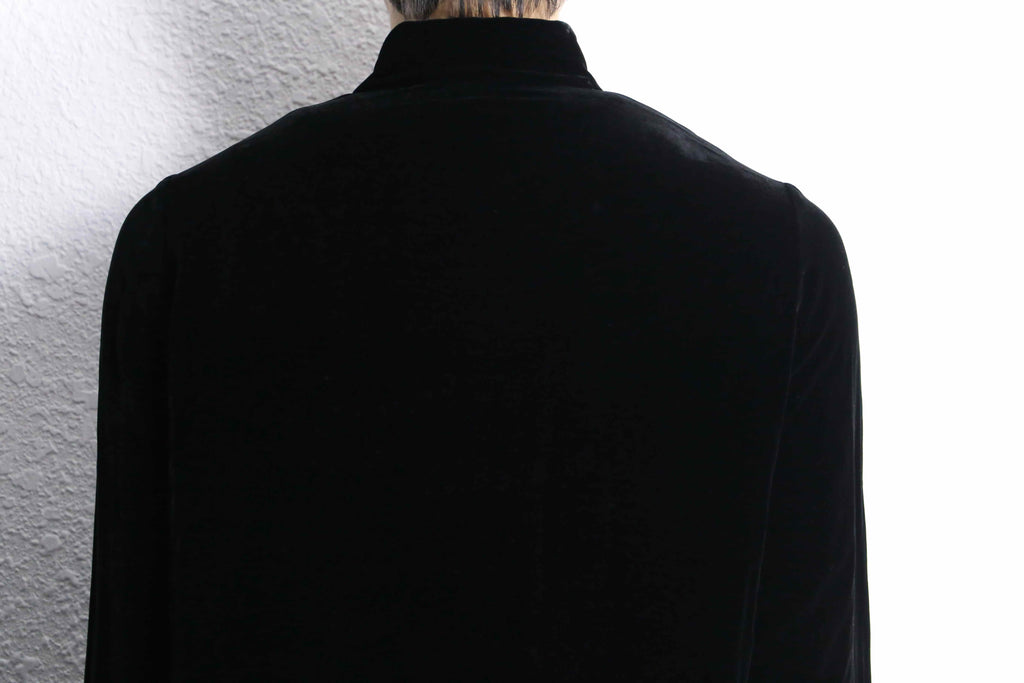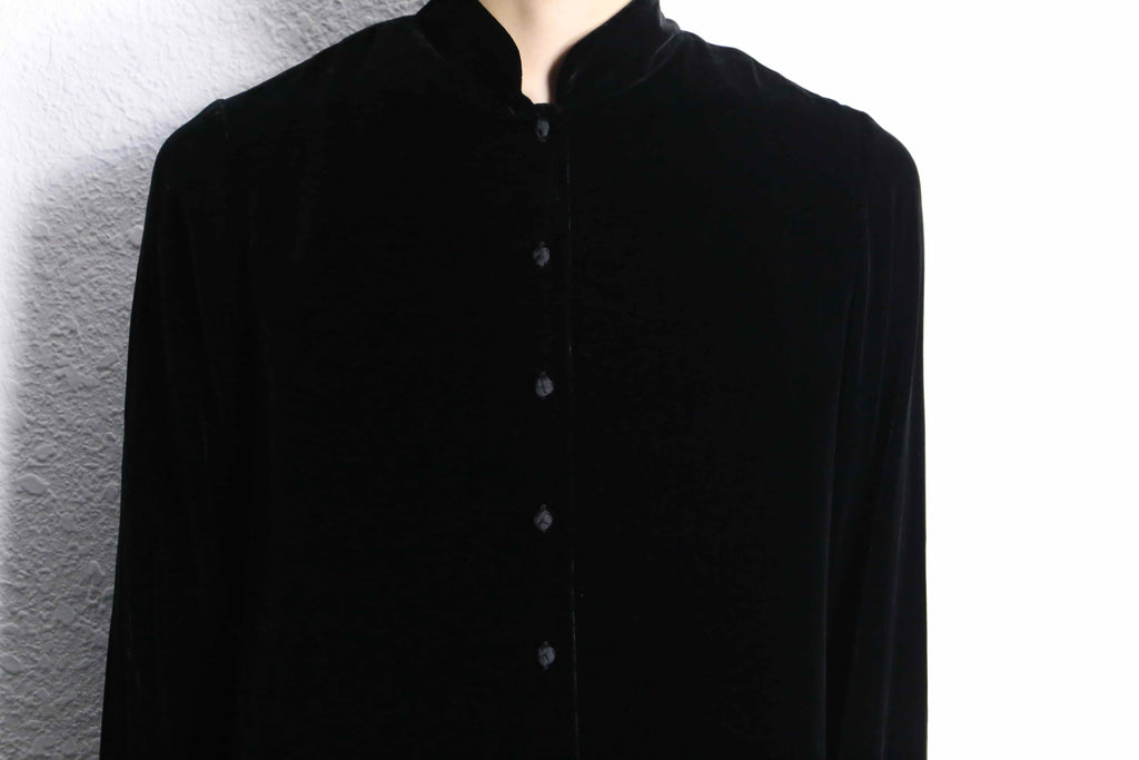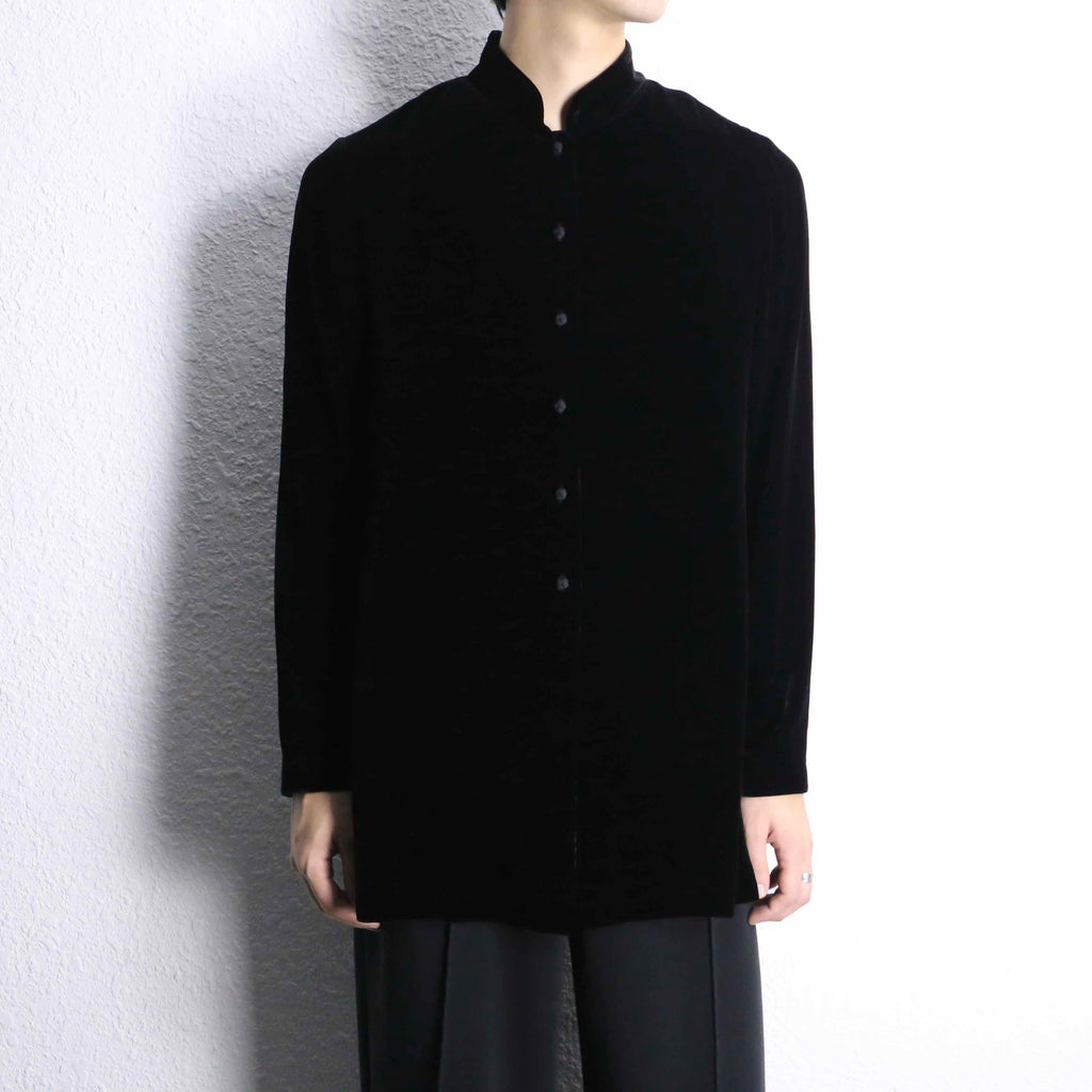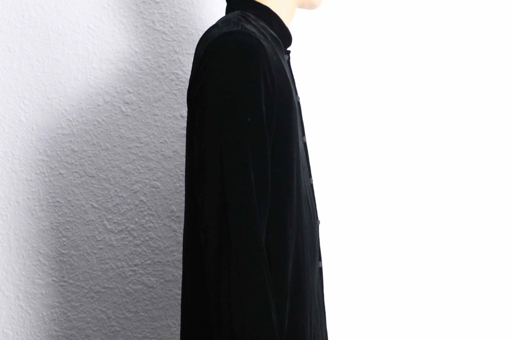 深みのあるブラックベロアが、上品な艶を纏って表情を変えるチャイナシャツ。