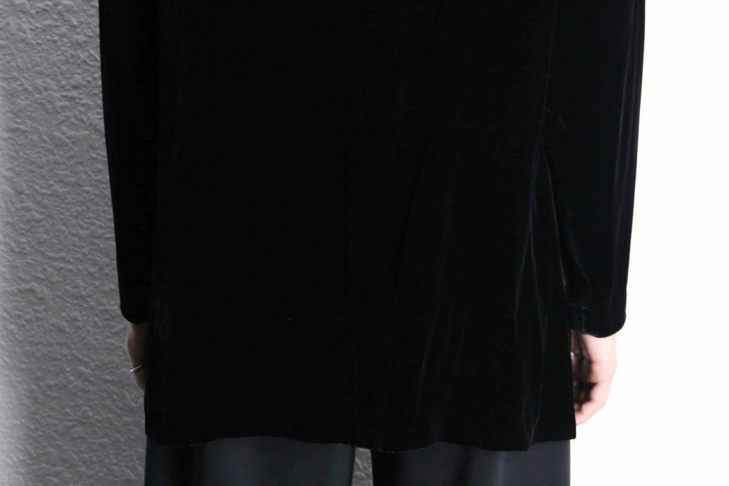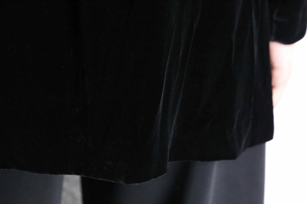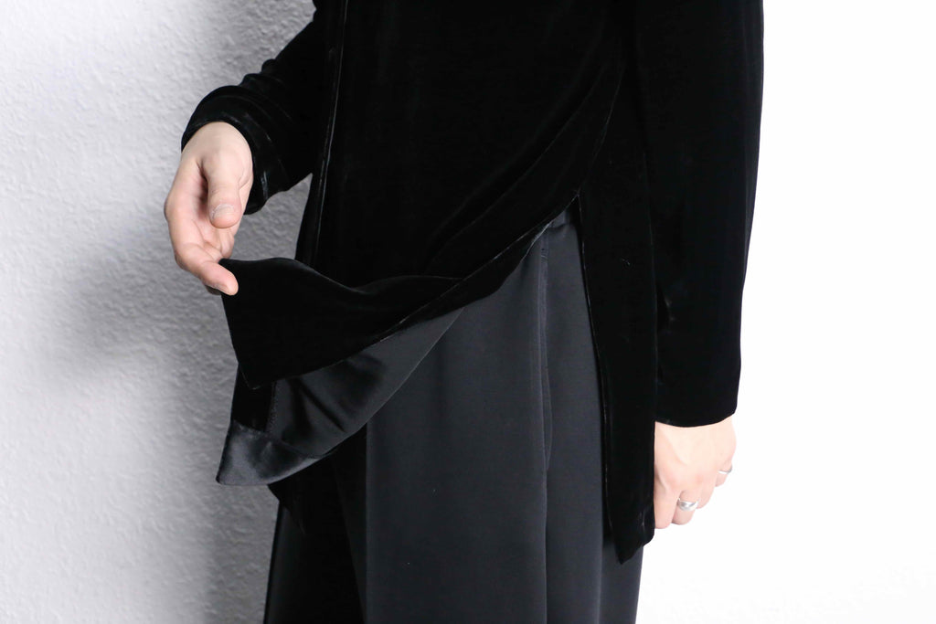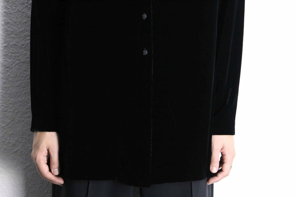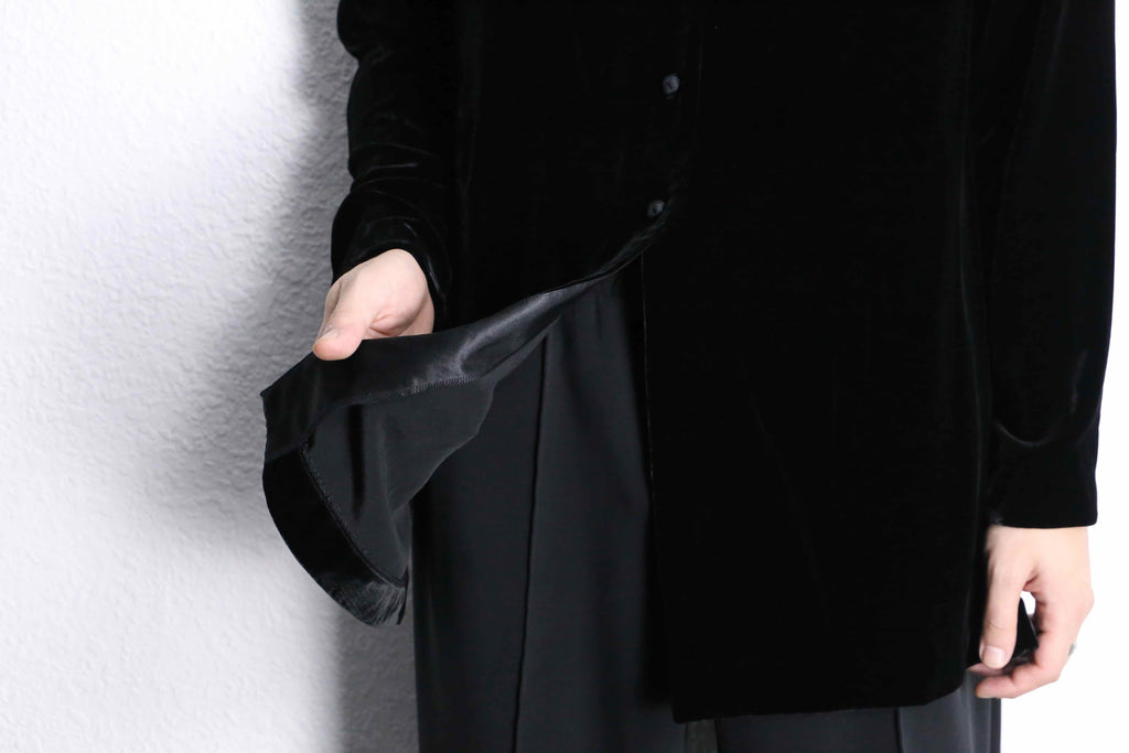 深みのあるブラックベロアが、上品な艶を纏って表情を変えるチャイナシャツ。