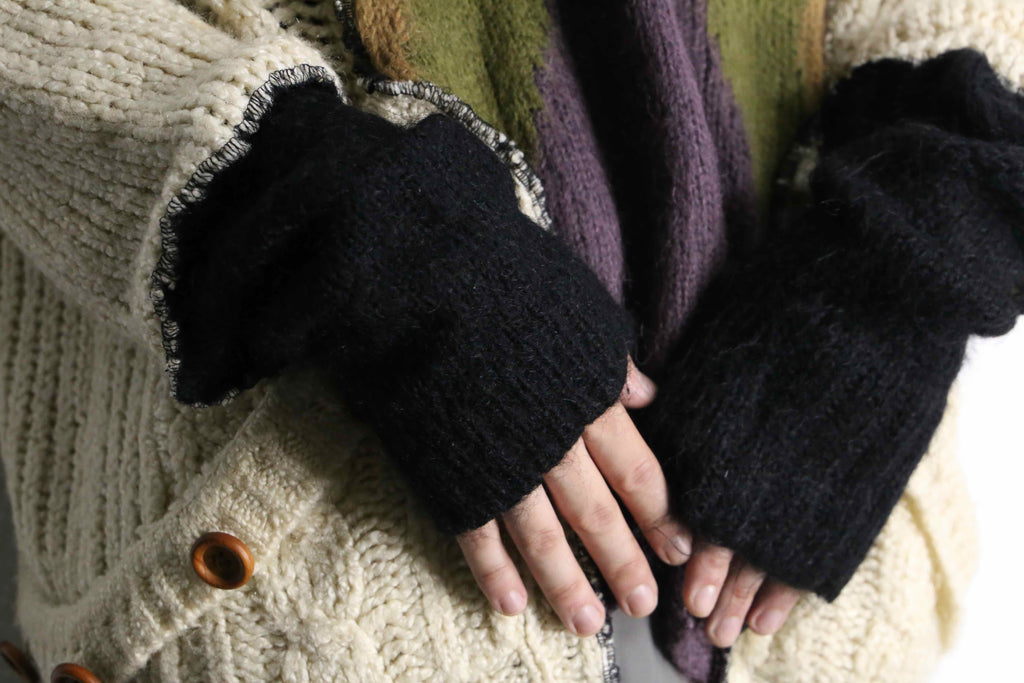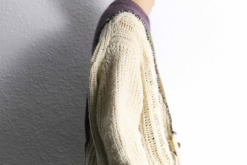 手作業による大胆な切り替えや、計算されたほつれの表情が独特の存在感を放ちます。アイボリーのケーブル編みに、深みのあるパープルとオリーブの配色を重ねることで、温かみの中にアーティスティックなムードを演出。フロントに施されたボタンや異素材のステッチが、クラフト感と前衛的なデザイン性を両立しています。ゆったりとした身幅と長めの袖丈が生み出すリラックスしたシルエットも魅力。