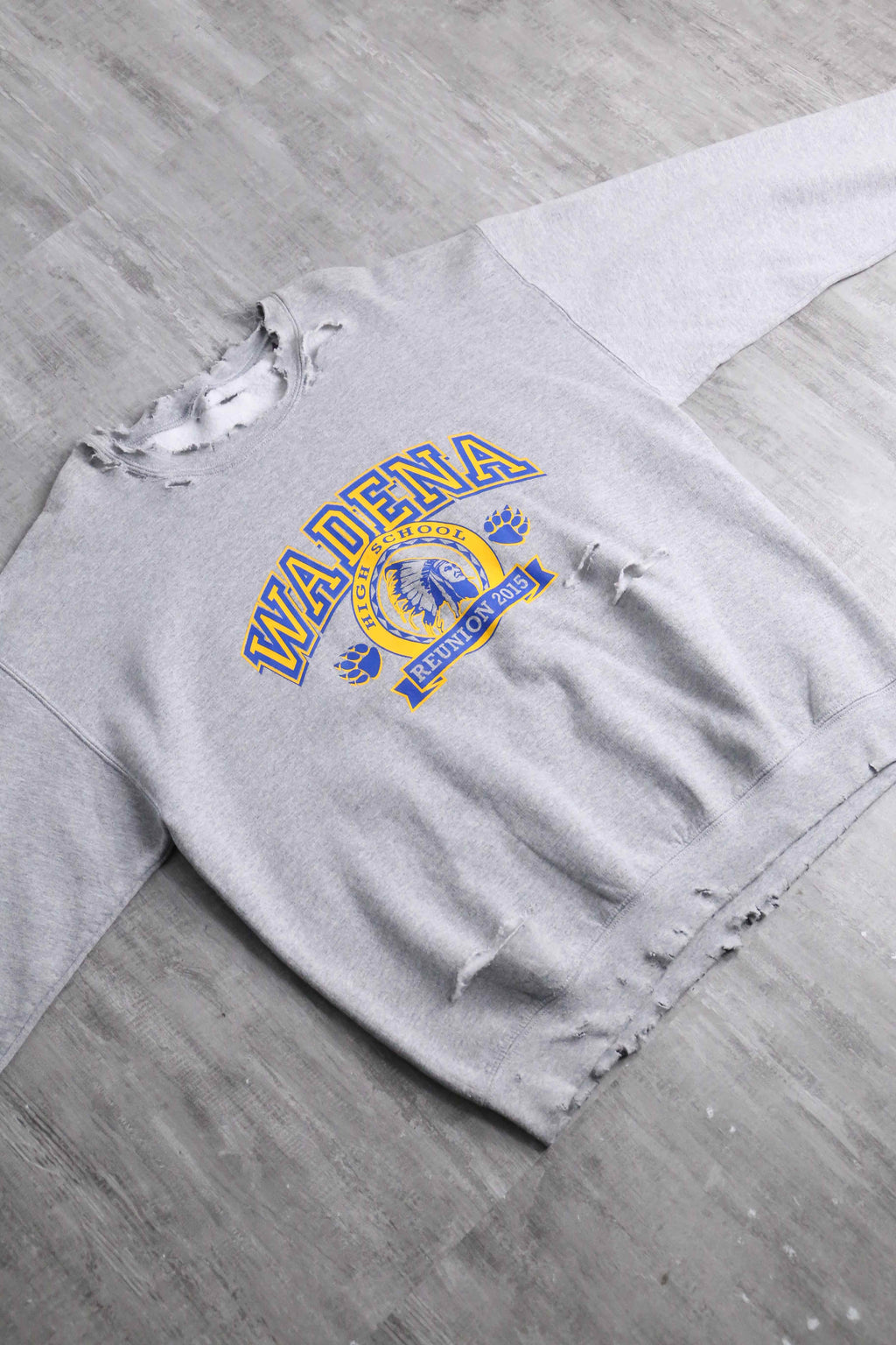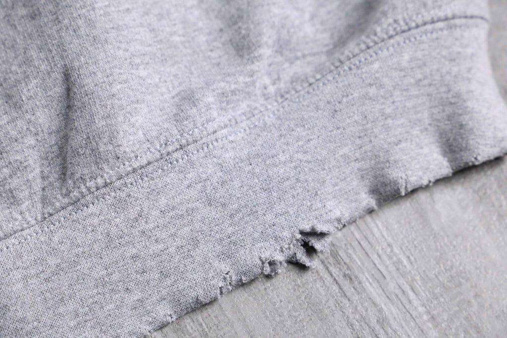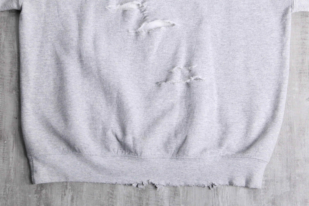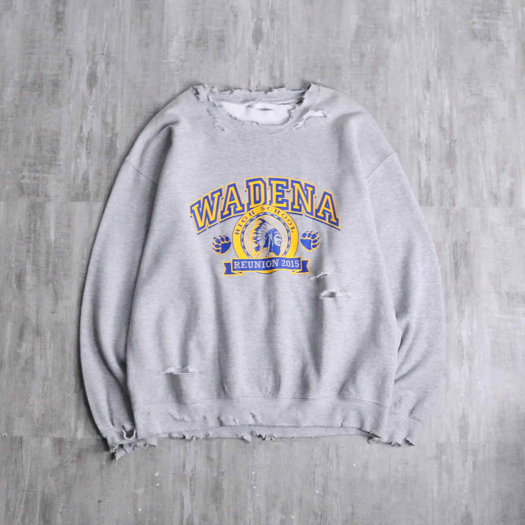 今回入荷したのは、グレーのボディにイエロー×ブルーのカレッジロゴが映える、ヴィンテージライクなスウェットです。首元や裾に施されたダメージ加工がこなれた雰囲気をつくり、1枚で着ても存在感のある仕上がり。程よくゆるさのあるシルエットで、男女問わずラフに着こなせます。