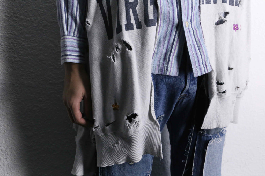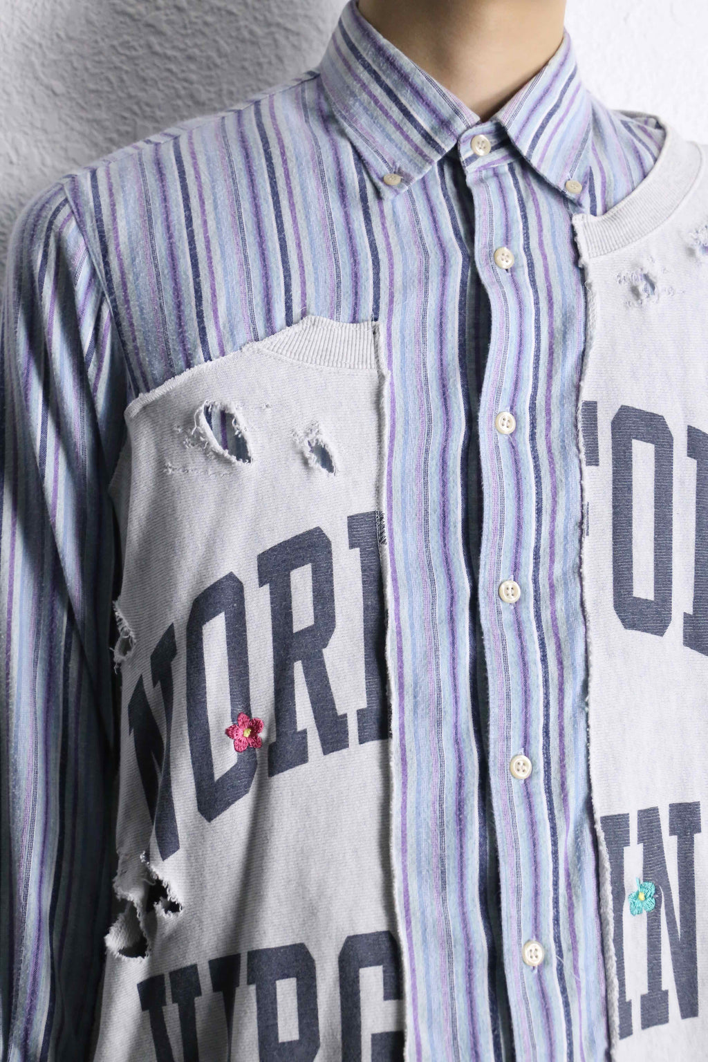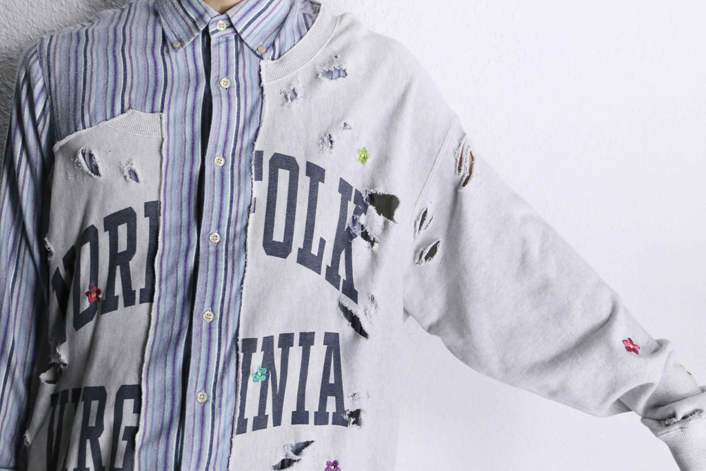 ヴィンテージのカレッジスウェットとストライプシャツを再構築したリメイクアイテムで「NORFOLK VIRGINIA」のプリントが印象的なスウェットに、シャツ生地をドッキングすることで、ラフさと上品さを兼ね備えた独自のバランスを実現しています。