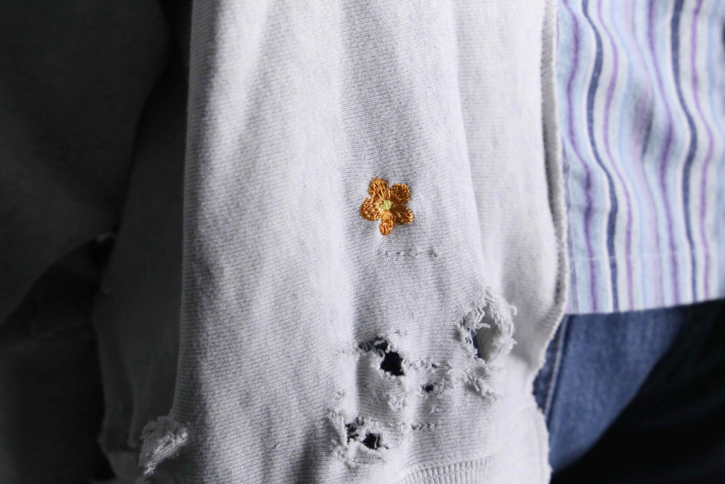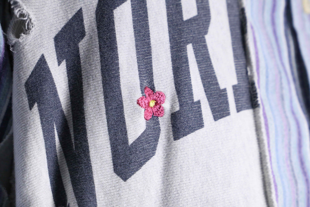 全体に施されたダメージ加工やカラフルな刺繍が、一点一点異なる表情を演出しておりルーズなシルエットでユニセックスに着用でき、デニムやワイドパンツなどカジュアルなボトムとも好相性です。是非。