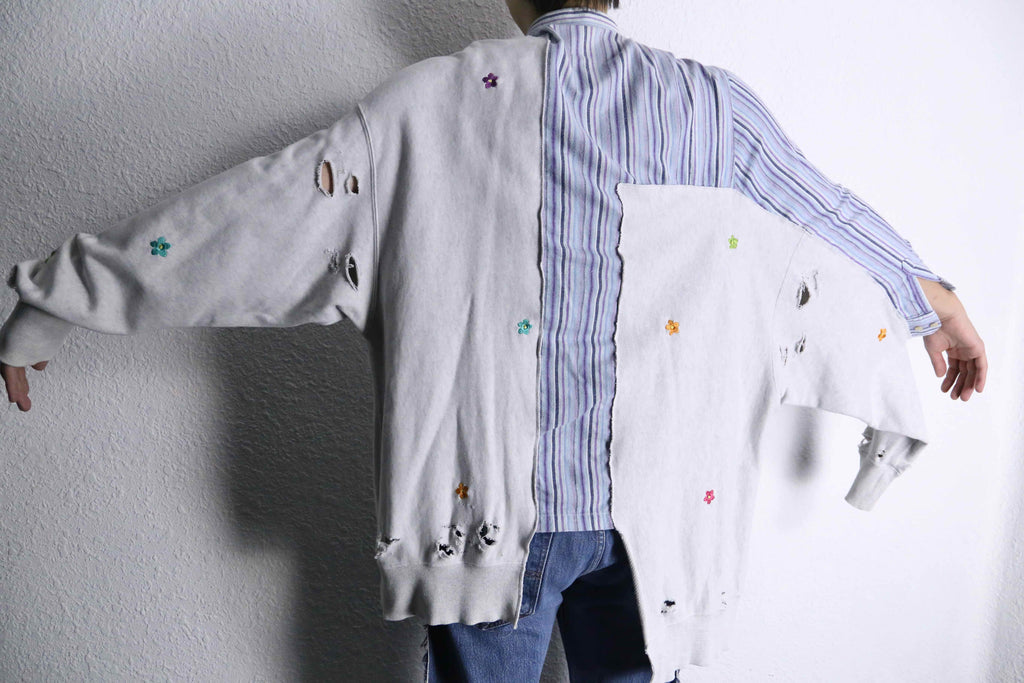 当店人気のリメイクアイテムより、ブルーのストライプシャツにダメージのスウェットがドッキングされた可愛いらしいトップスが入荷しました。